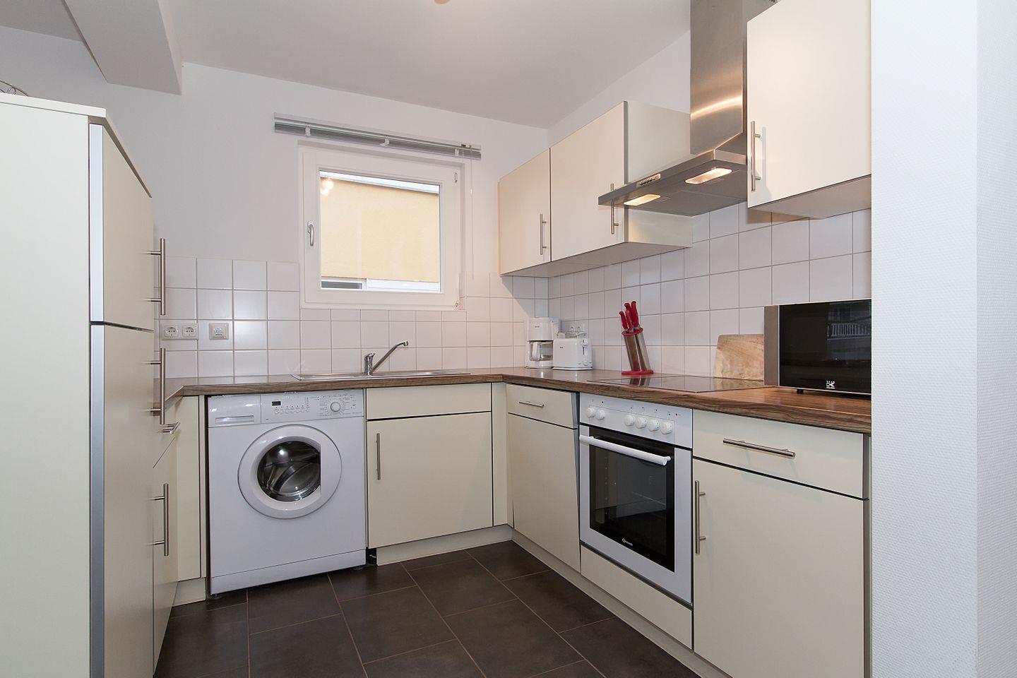 - in separater Ecke im Wohnraum befindet sich eine offene Einbauküche inkl. Geschirrspüler, Herd, Backofen, Kaffeemaschine, Toaster, Wasserkocher und ein Kühlschrank mit Gefrierteil