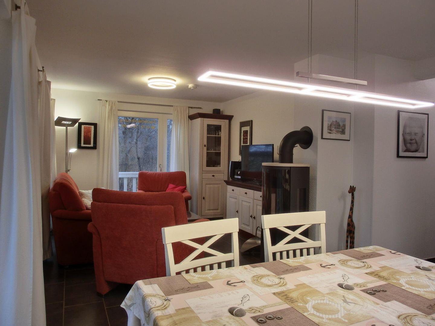 - Wohnbereich mit Kaminofen, Fußbodenheizung, Sitz- und Essecke, Smart-TV, CD- und DVD-Player