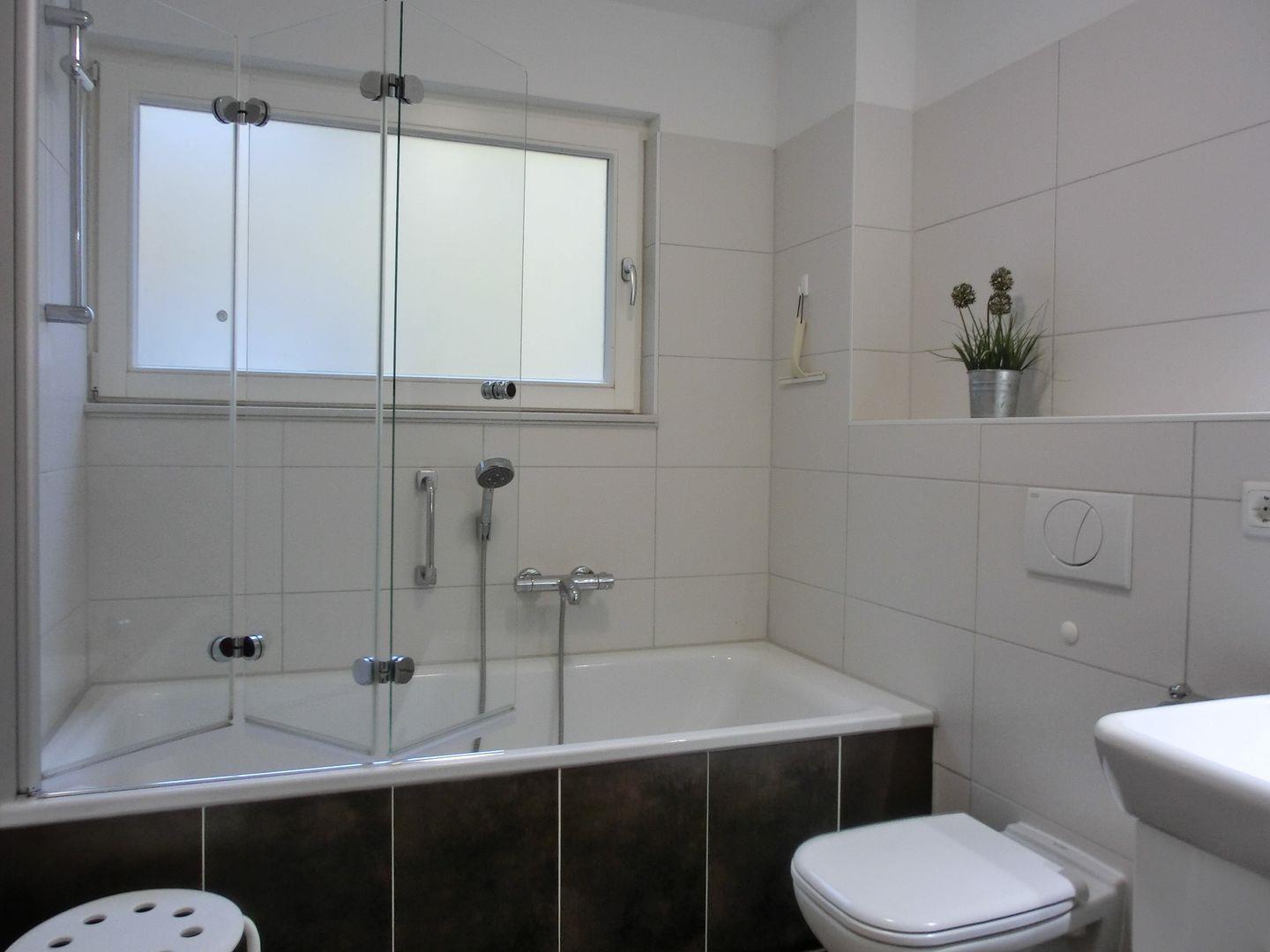 - Tageslichtbadezimmer mit Badewanne, WC, Waschtisch, Fön und genügend Ablagefläche