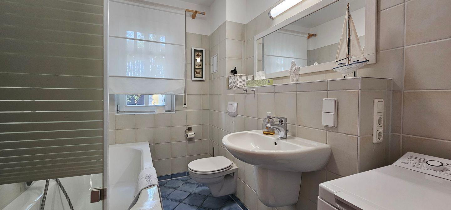 • Tageslichtbad mit Badewanne, WC, Waschtisch, Fön und viel Ablagefläche