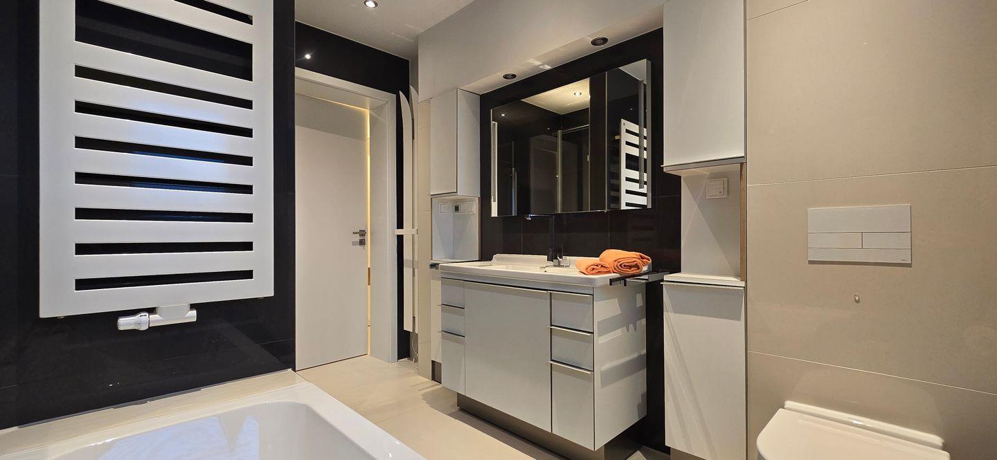 • Bad mit bodengleicher Dusche, Badewanne, WC, Waschbecken & Haartrockner