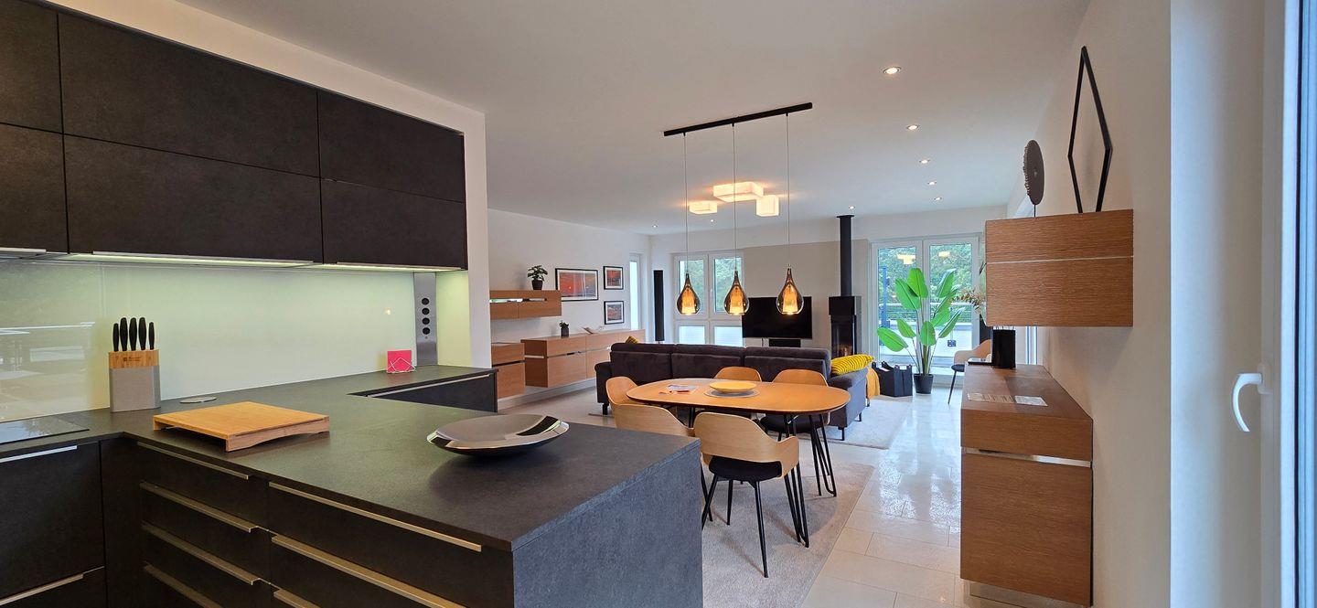 • Offene Küche voll ausgestattet mit Induktionskochfeld, Backofen, Kühlschrank mit Gefrierfach, Geschirrspüler, Kaffeemaschine,
