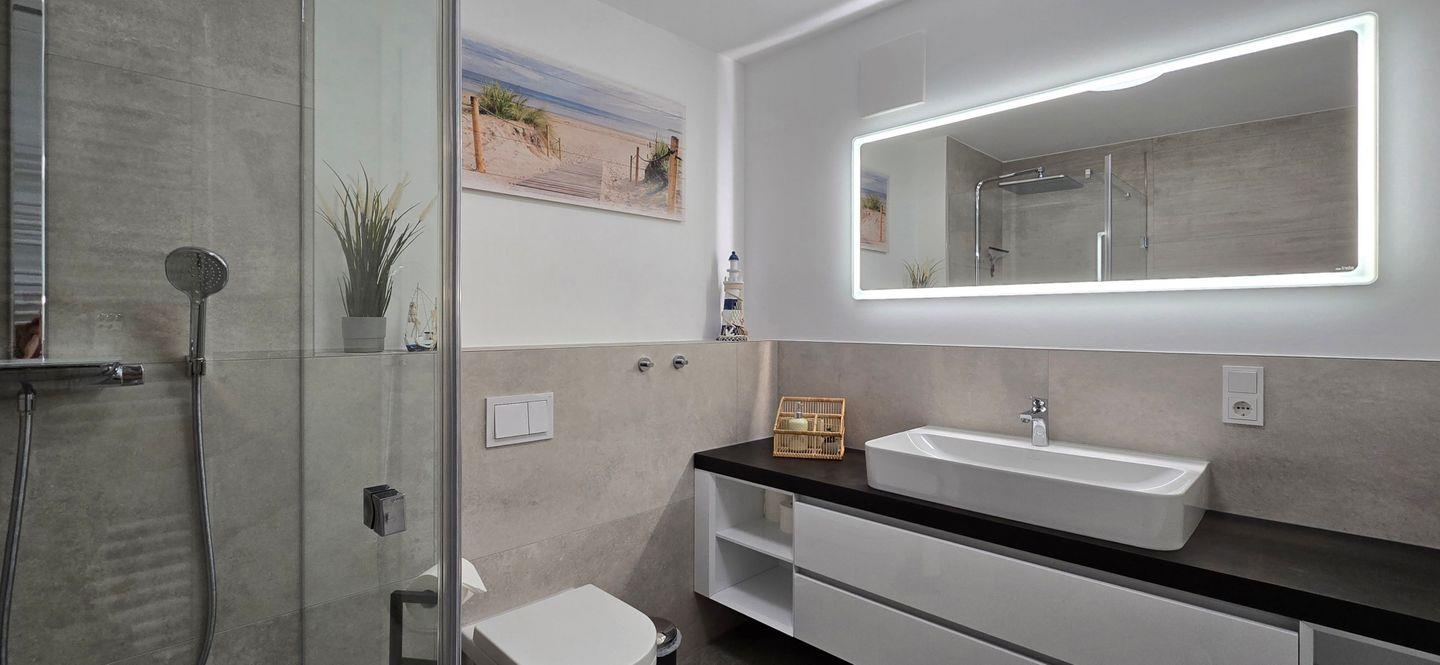 • Waschbecken, WC und großes Spiegelglas, Haartrockner