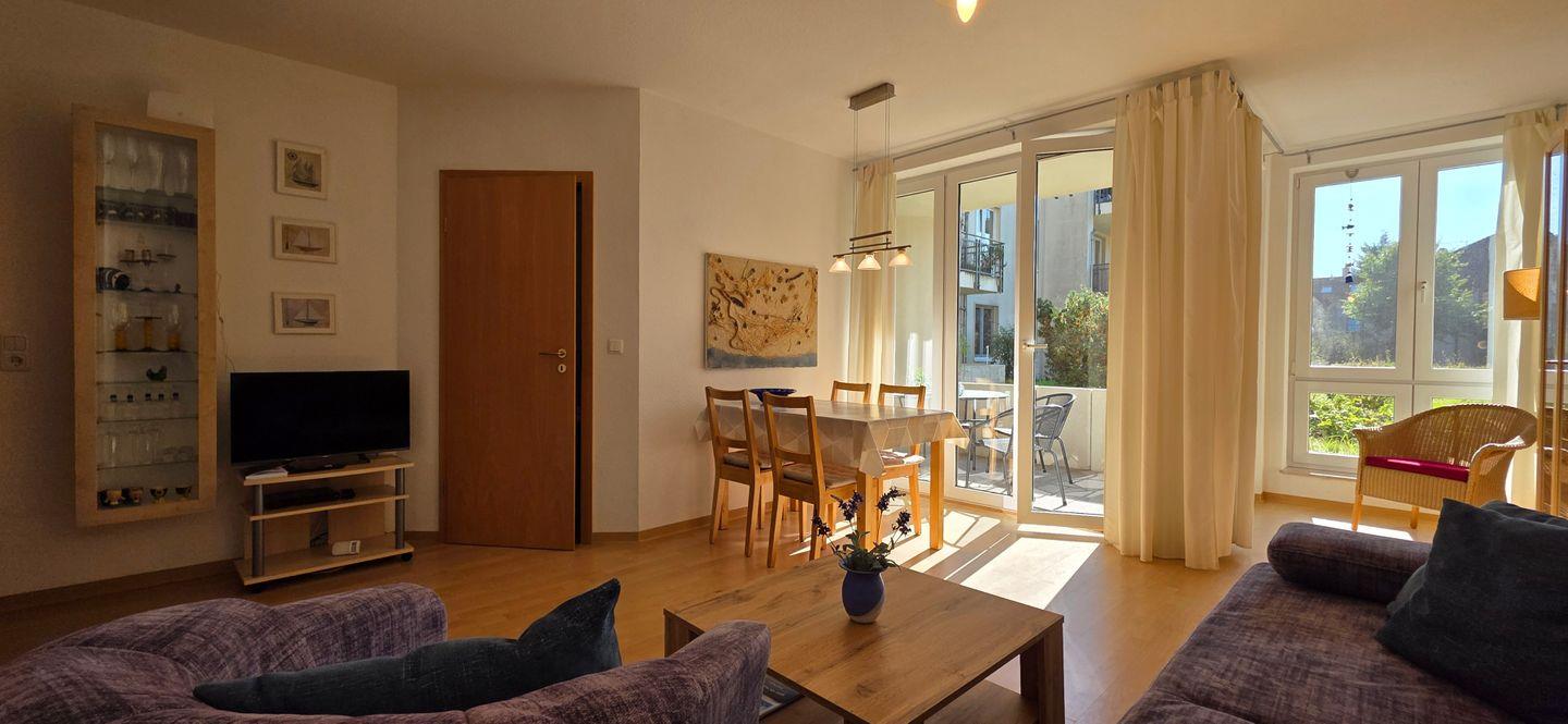 • Wohnzimmer mit gemütlichem Sofa, TV und Radio lädt zum Entspannen ein.