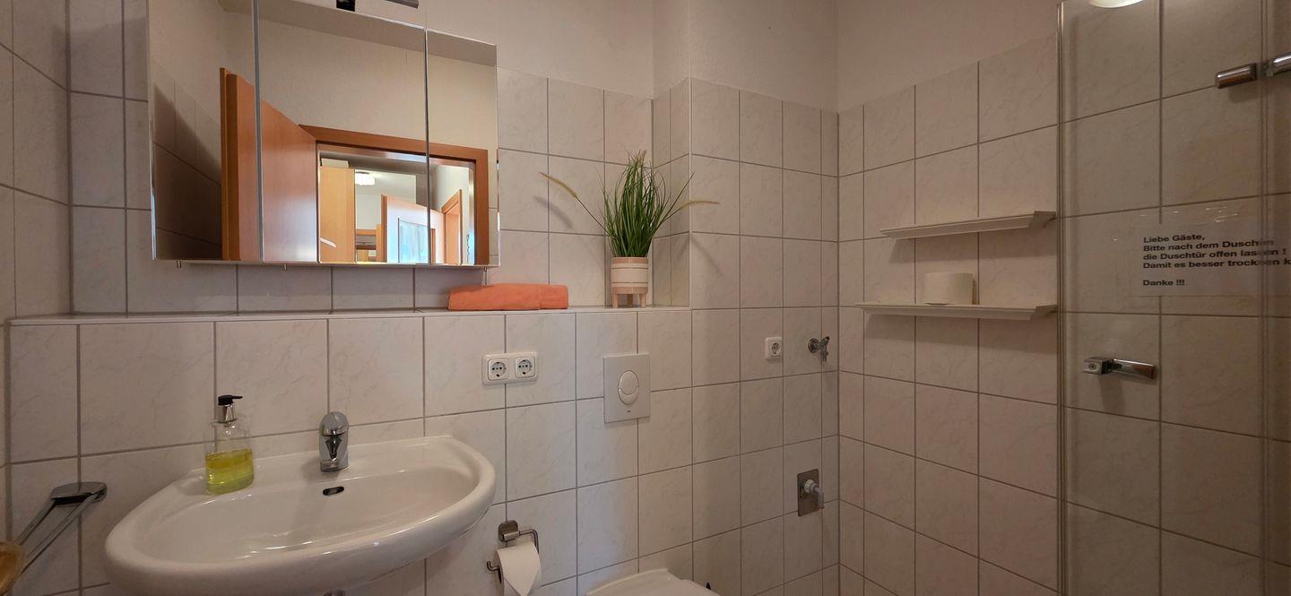 • Badezimmer mit Dusche, WC, Waschbecken und Haartrockner