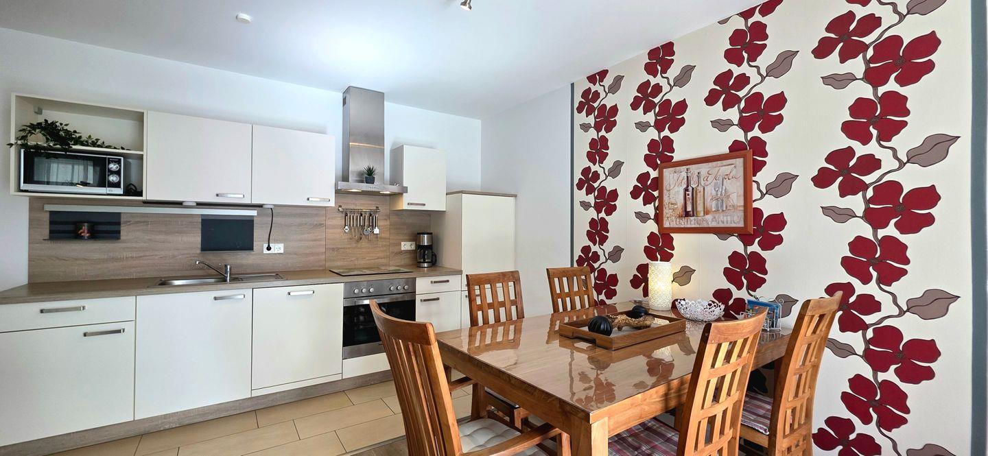 • offene Küche mit Herd, Backofen, Kühlschrank mit Gefrierfach, Geschirrspüler, Mikrowelle, Wasserkocher,