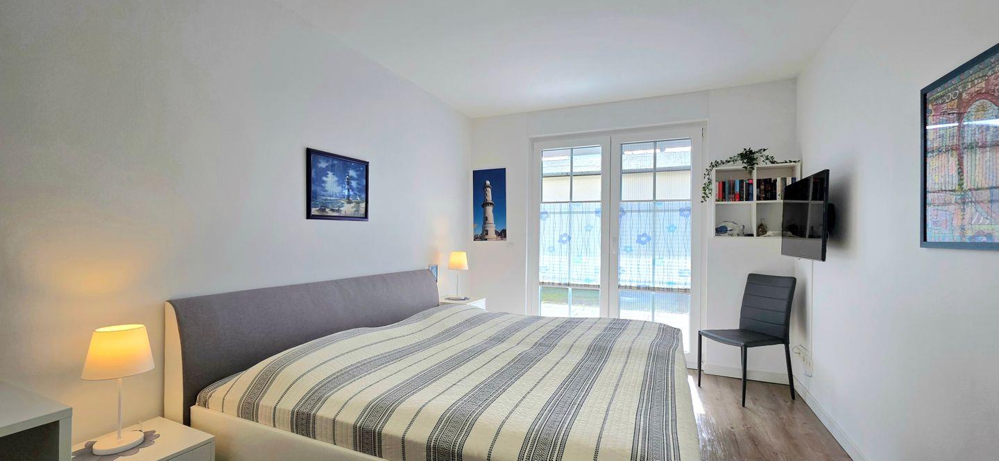 • Schlafzimmer mit Doppelbett (200 cm x 200 cm, geteilte Matratze), Schreibtisch und zweiter TV