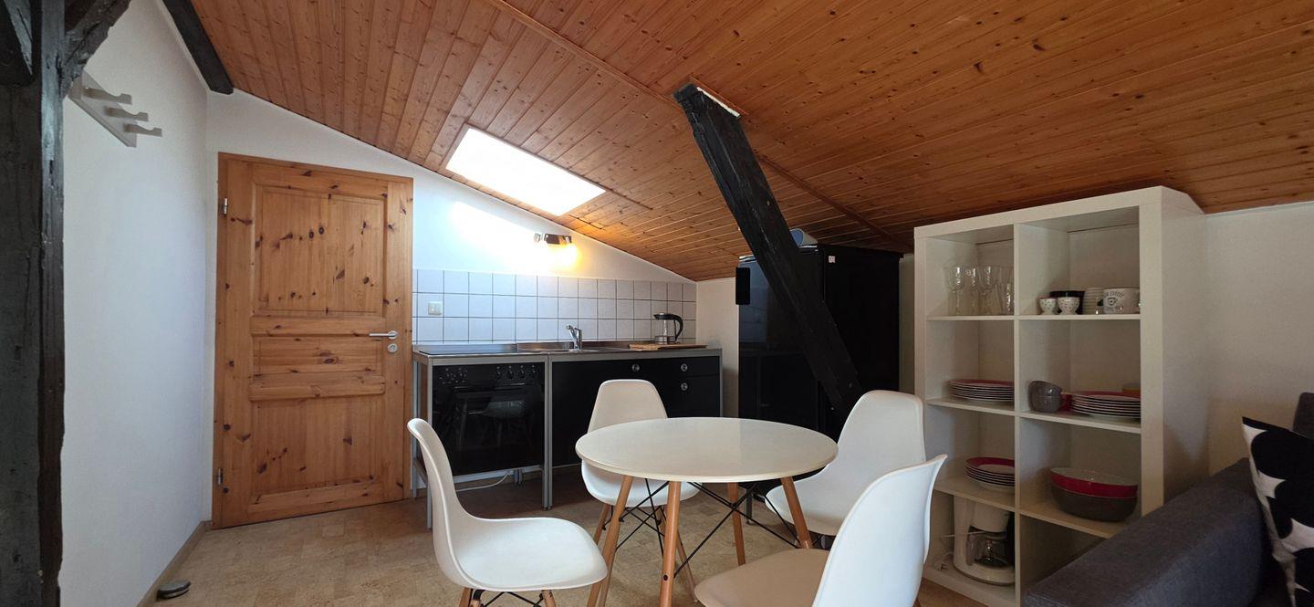 • offene Küche mit Herd, Kühlschrank mit Gefrierfach, Kaffeemaschine, Wasserkocher und Toaster