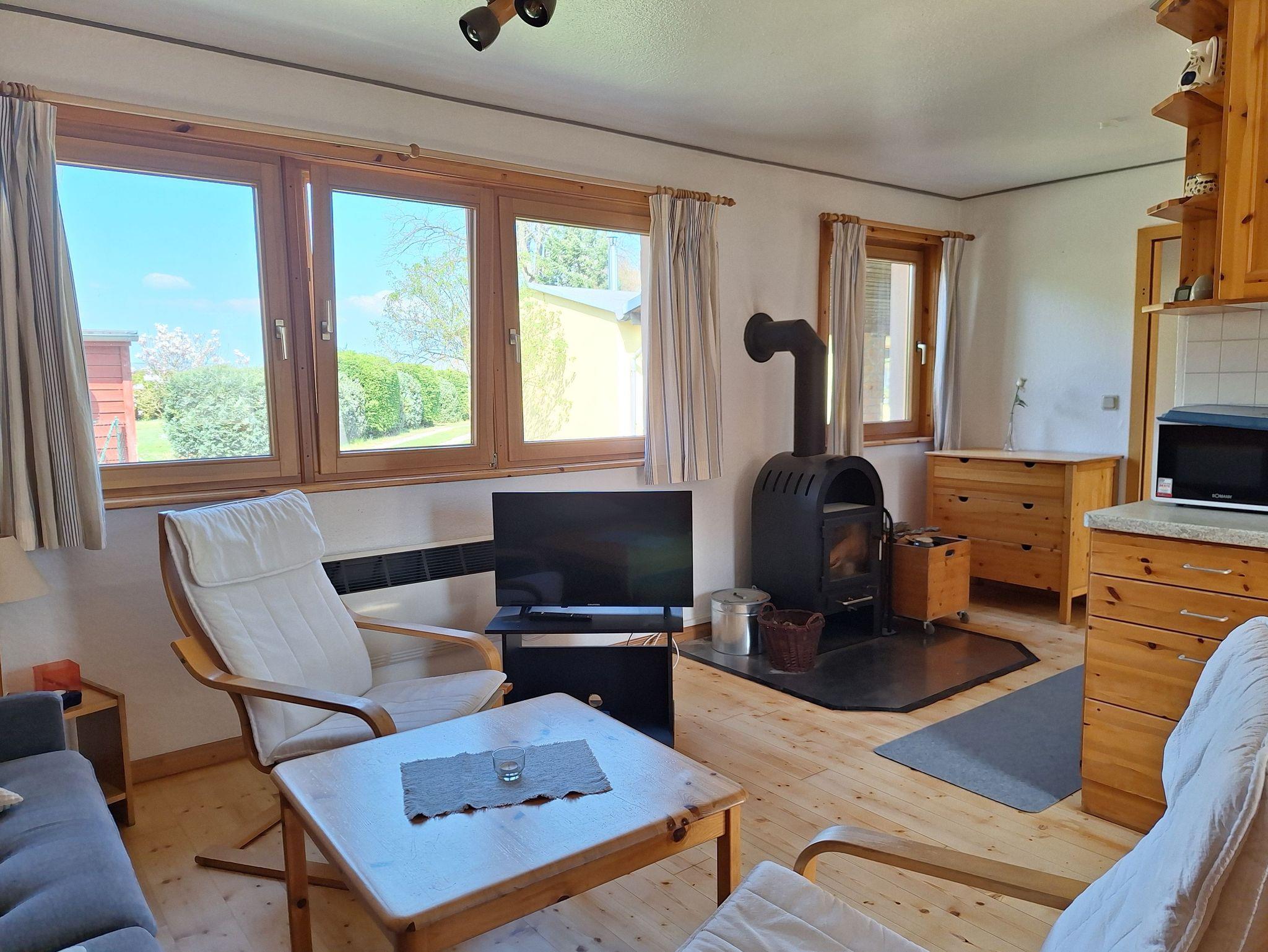 Der offene Wohnbereich umfasst das gemütliche Sofa, einen Esstisch und die Einbauküche. Diese verfügt über alle Utensilien des täglichen Bedarfs.