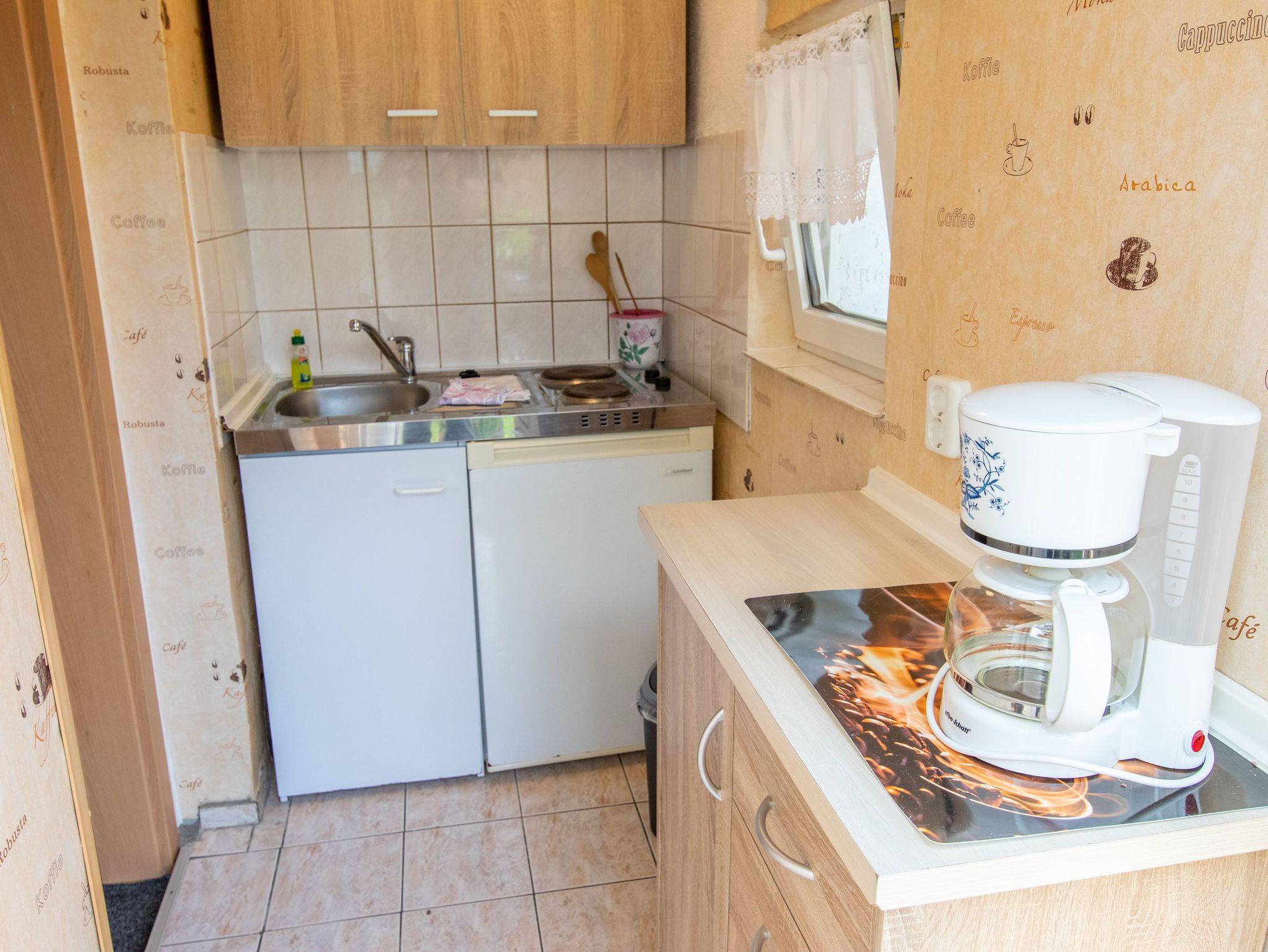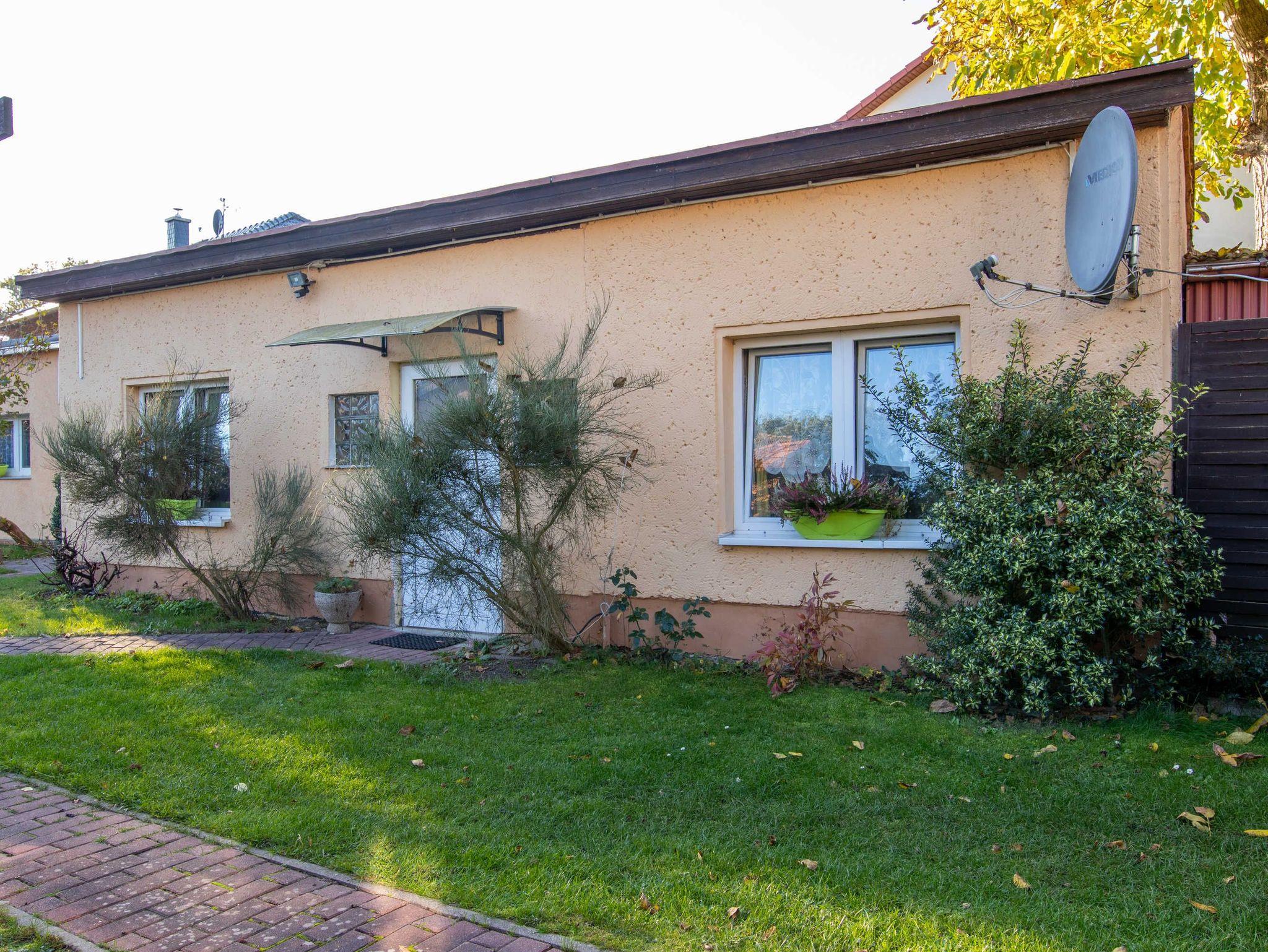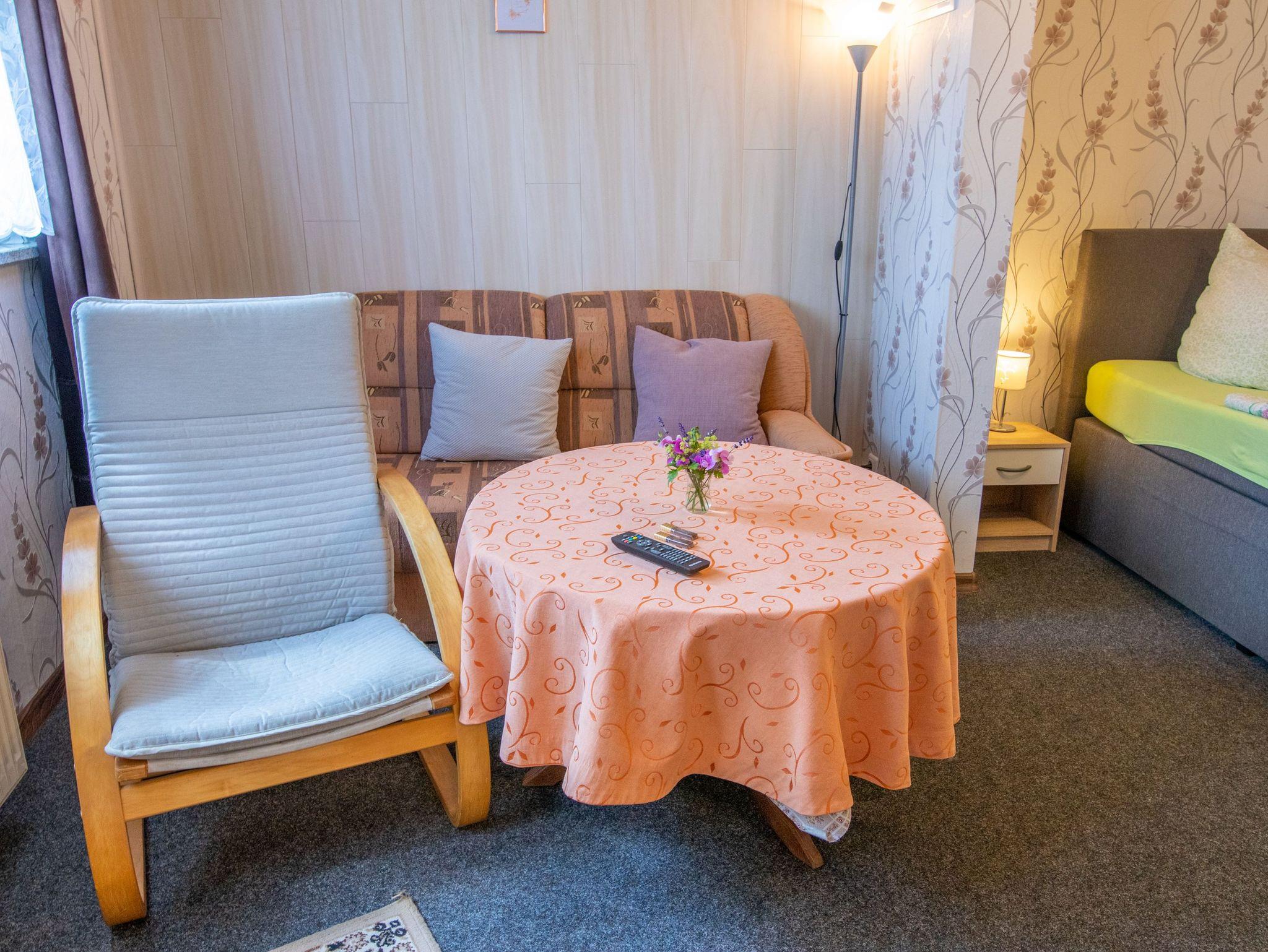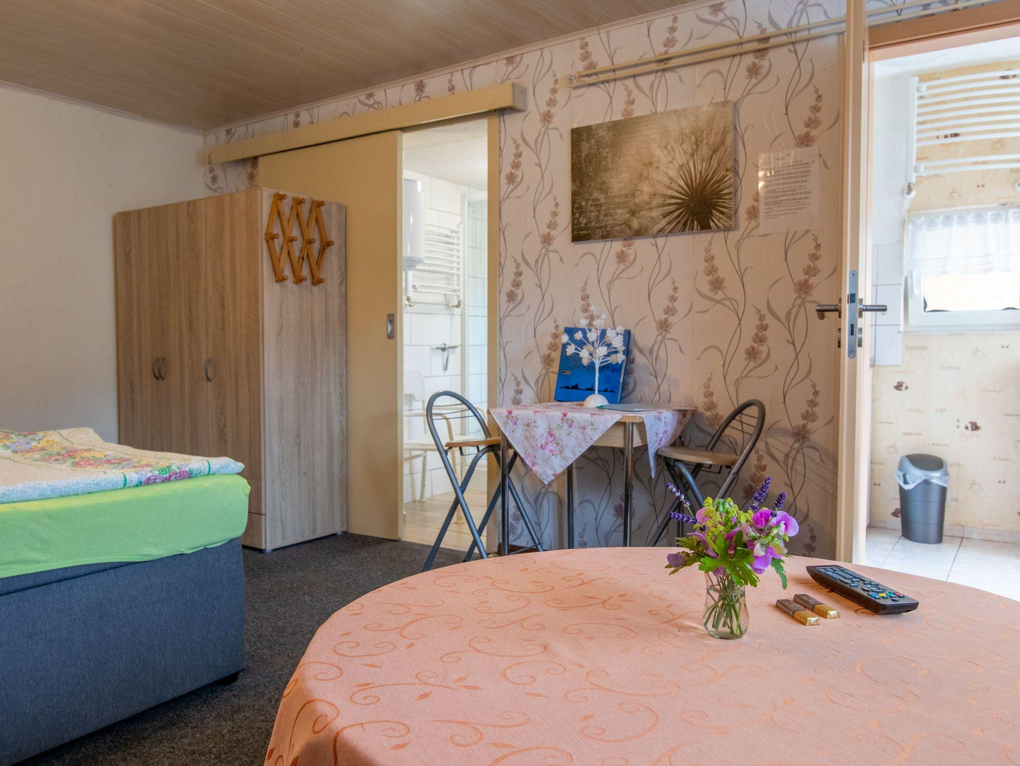 Die Ferienwohnung 3 befindet sich in einem separaten Haus im Bungalowstil auf dem hinteren Teil des Gartengrundstücks und umfasst eine überdachte Terrasse mit einem Tisch und Holzmöbeln. Durch die Eingangstür gelangt man in die Küche, die mit einer Pantry Küche, einem Kühlschrank, Kaffemaschine, Wasserkocher und Toaster ausgestattet ist. Das kombinierte Wohn- und Schlafzimmer eignet sich mit seinem Doppelbett (180x200), dem Schlafsofa, einem kleinen Ess-Bereich und dem Flachbild- TV für 2 Personen. Im Badezimmer gibt es neben einer Runddusche noch ein WC und Waschbecken. Die Rasenflächen können als Liegewiese genutzt werden. Auf Wunsch kann gern gegrillt weden.