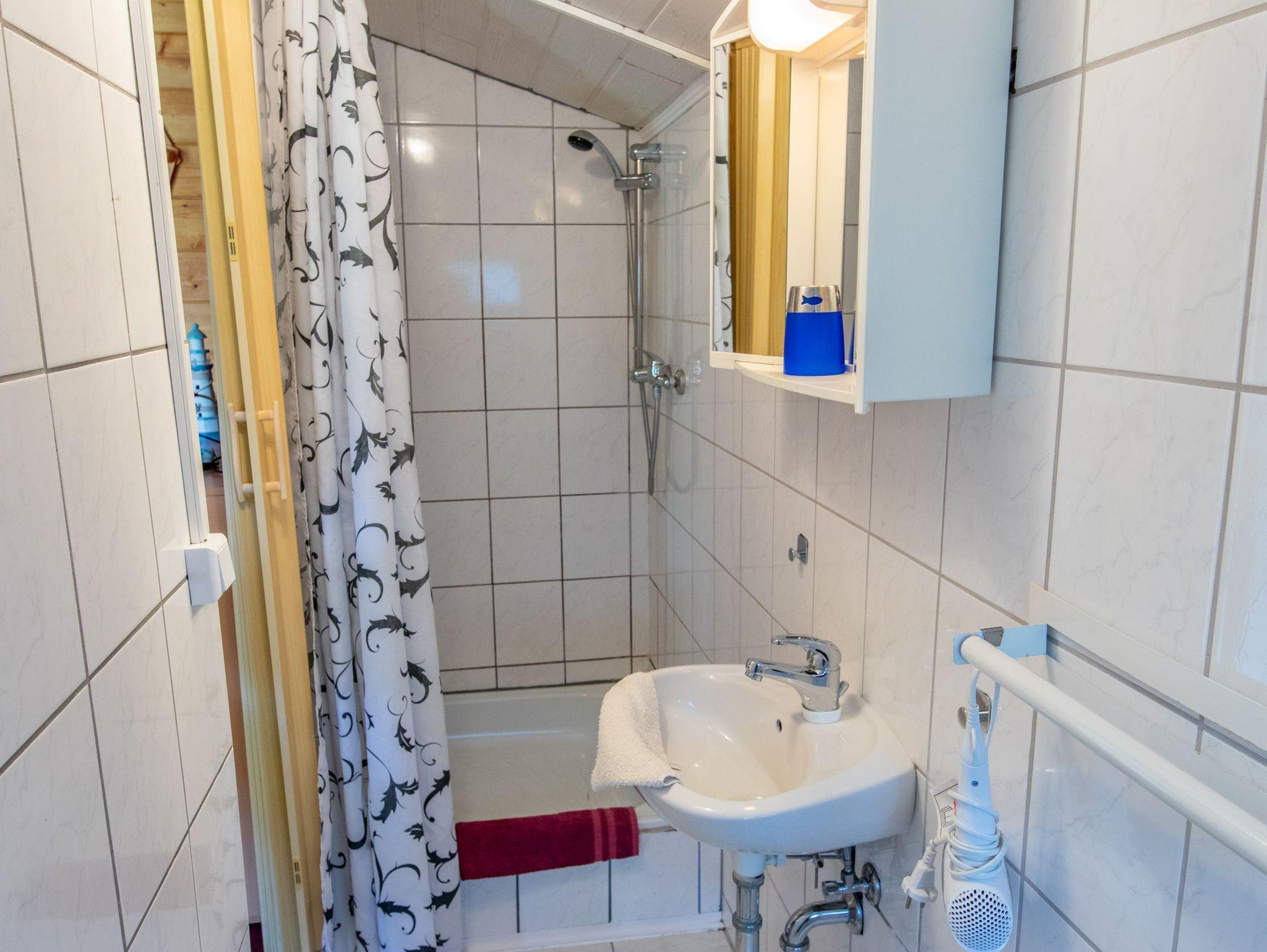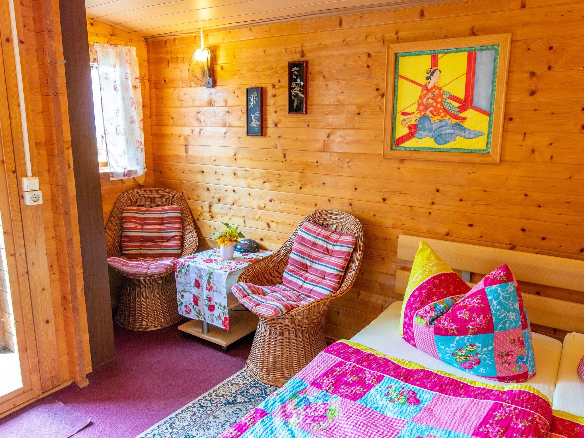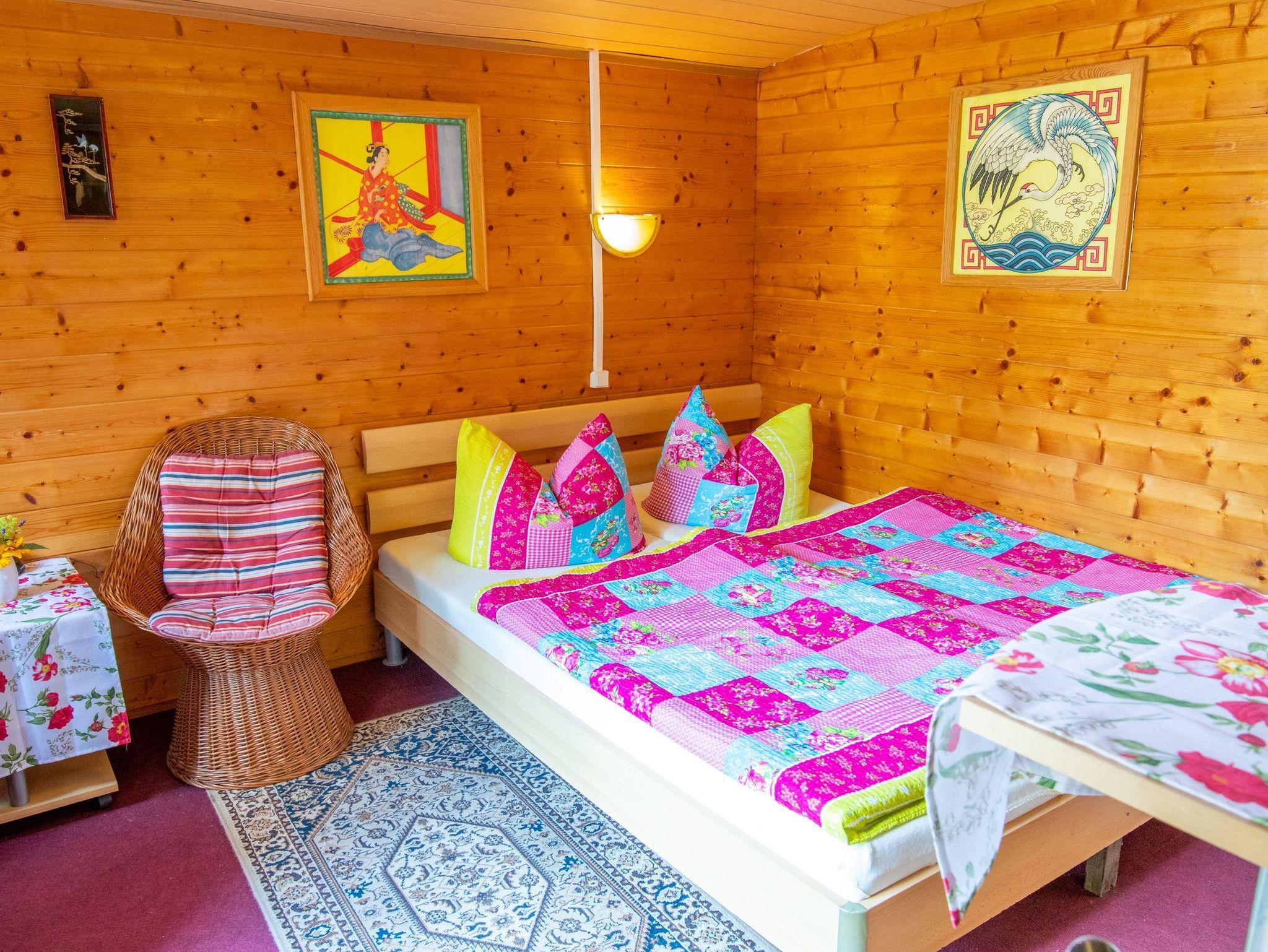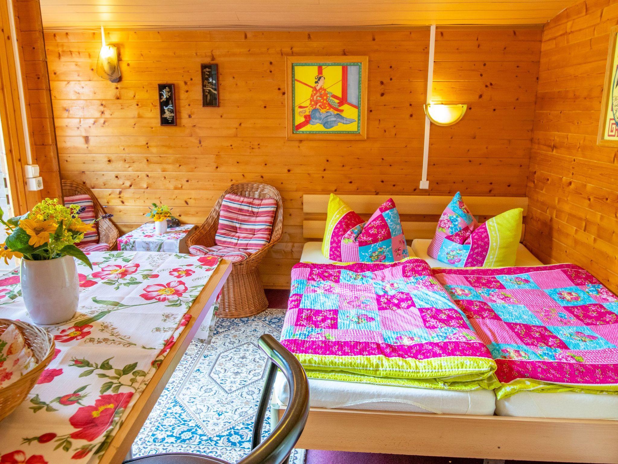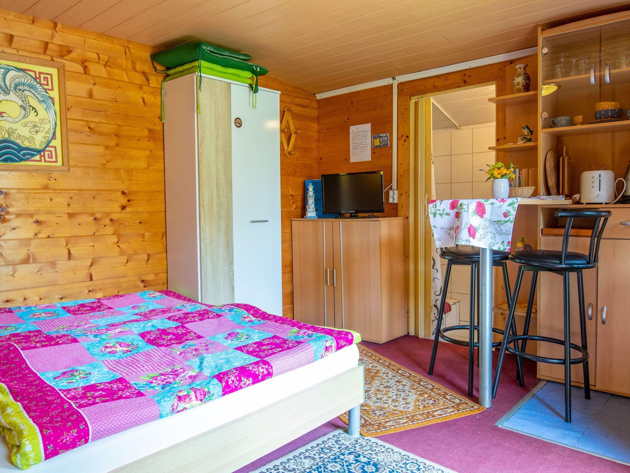 Das Sommerhäuschen 5 ist ein kleines Holzhaus für 2 Personen auf dem hinteren Teil des Gartengrundstücks. Das kombinierte Wohn- und Schlafzimmer verfügt über ein Doppelbett (160x200), eine Sitzecke mit Rattanmöbeln, einen Flachbild-TV sowie ein Radio. Der Küchenbereich mit einem kleinen Essplatz ist mit einer Pantry Küche, Kühlschrank, Kaffemaschine, Wasserkocher und Toaster ausgestattet. Im Badezimmer gibt es eine Dusche und eine Toilette mit Waschbecken.