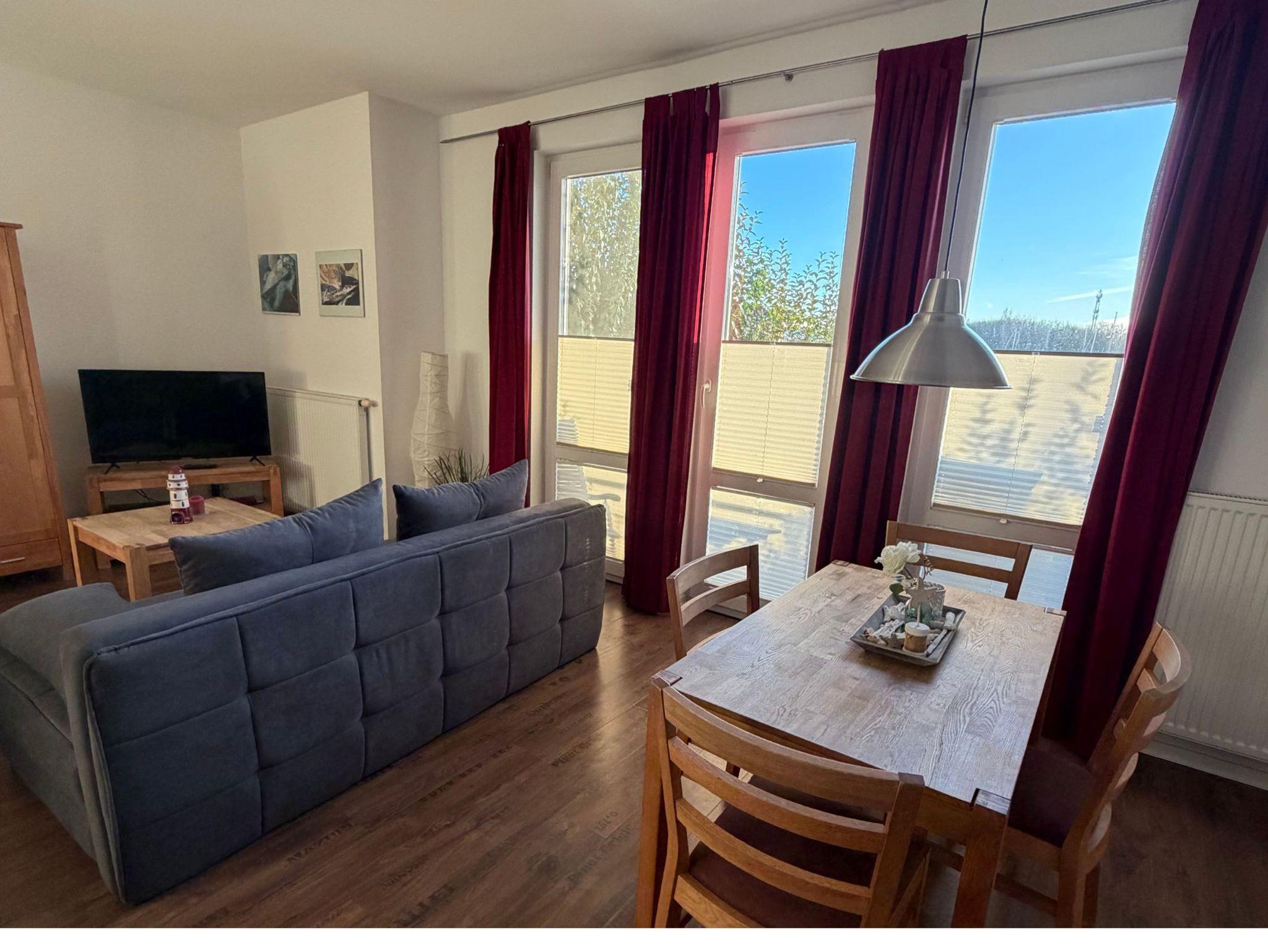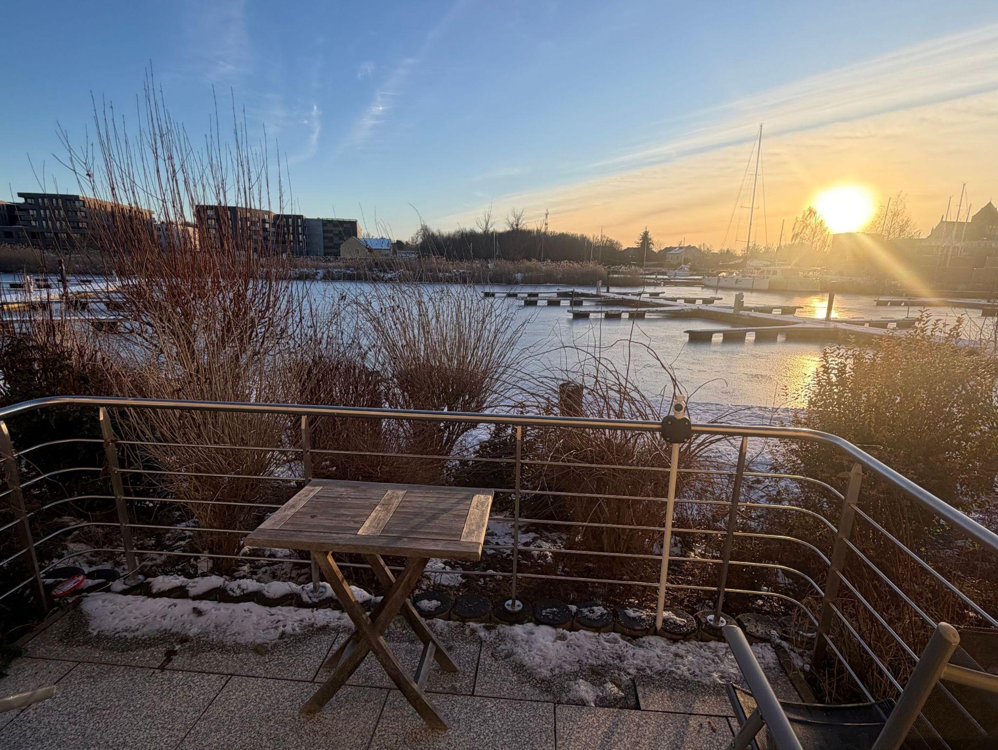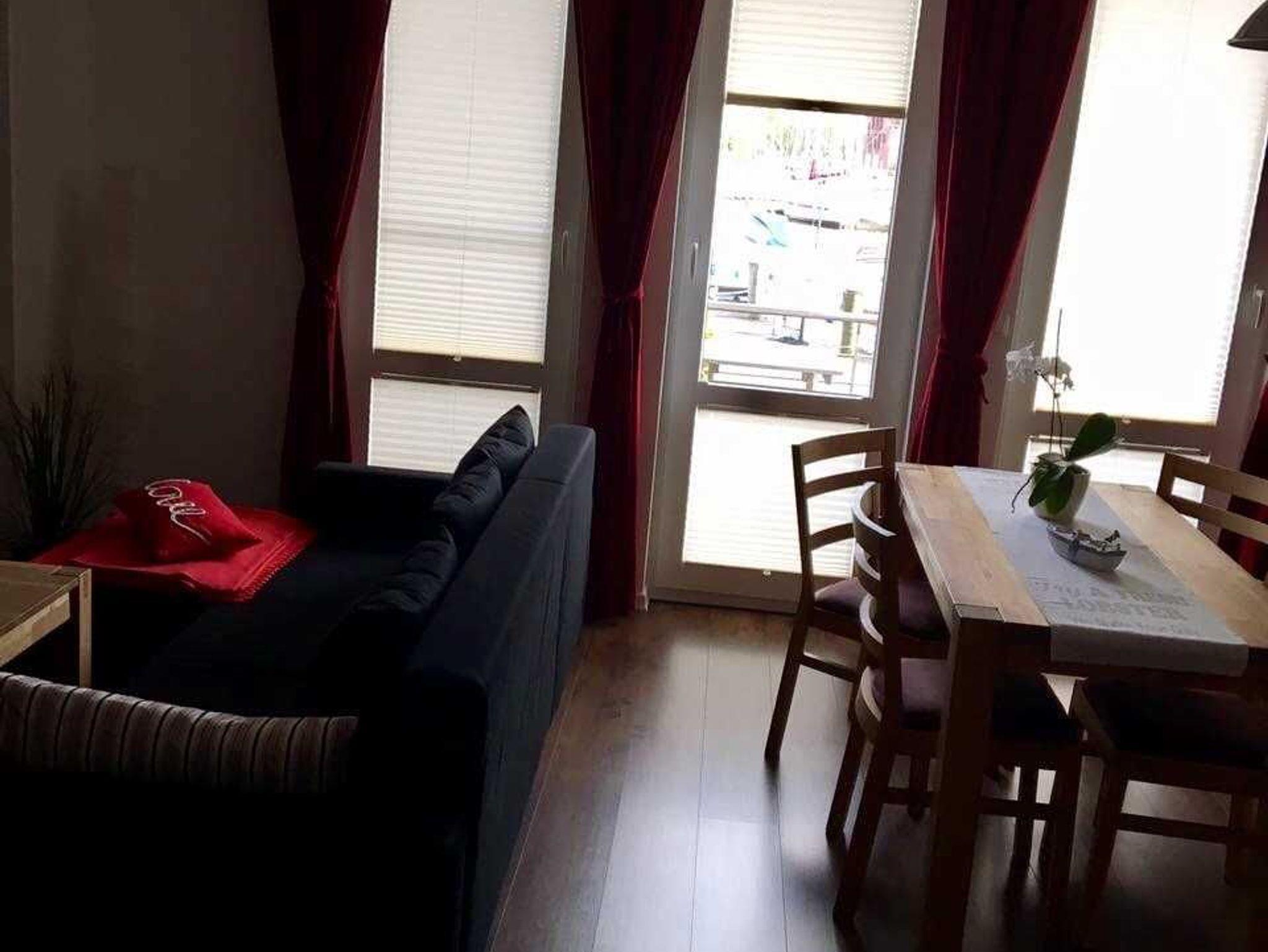 Moderne Ferienwohnung mit Terrasse und Blick auf den Yachthafen in Greifswald.