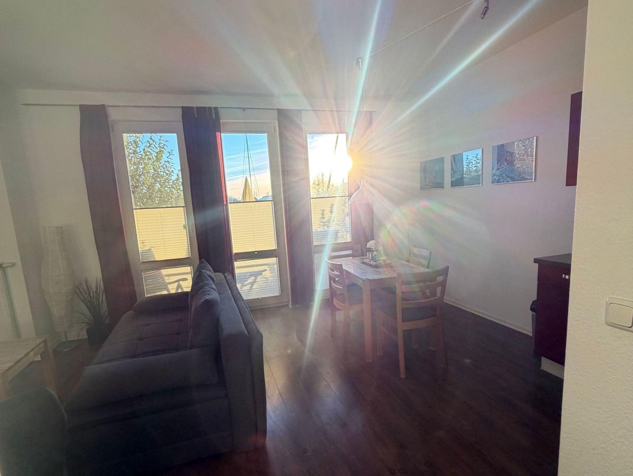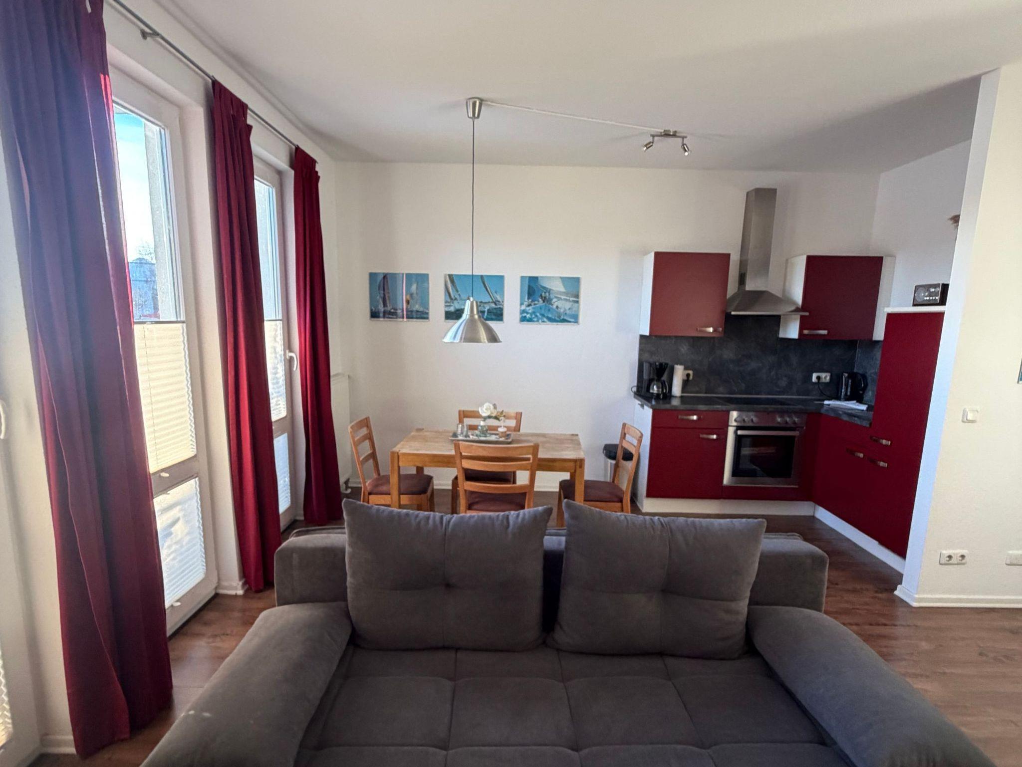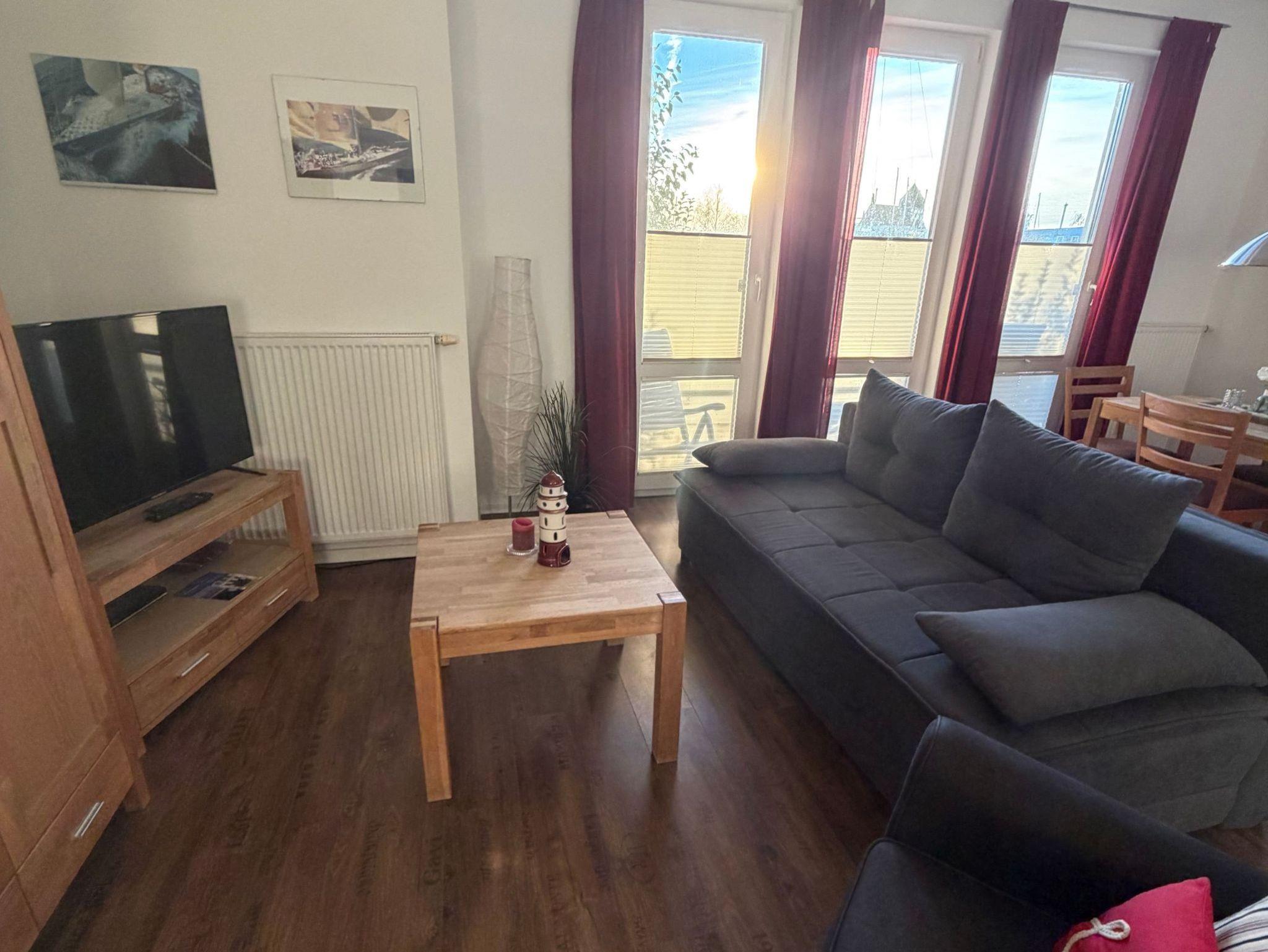Moderne Ferienwohnung mit Terrasse und Blick auf den Yachthafen in Greifswald.
