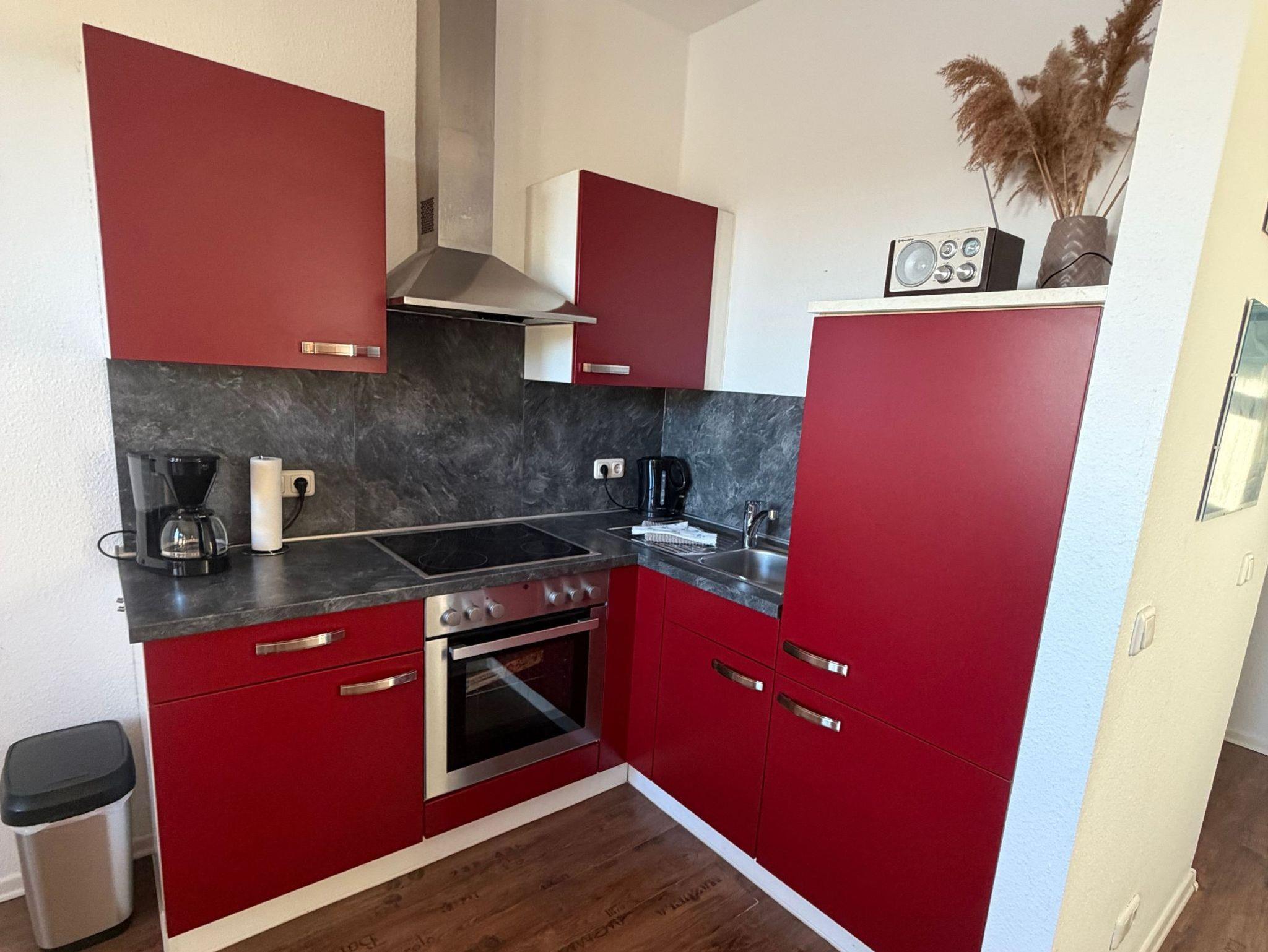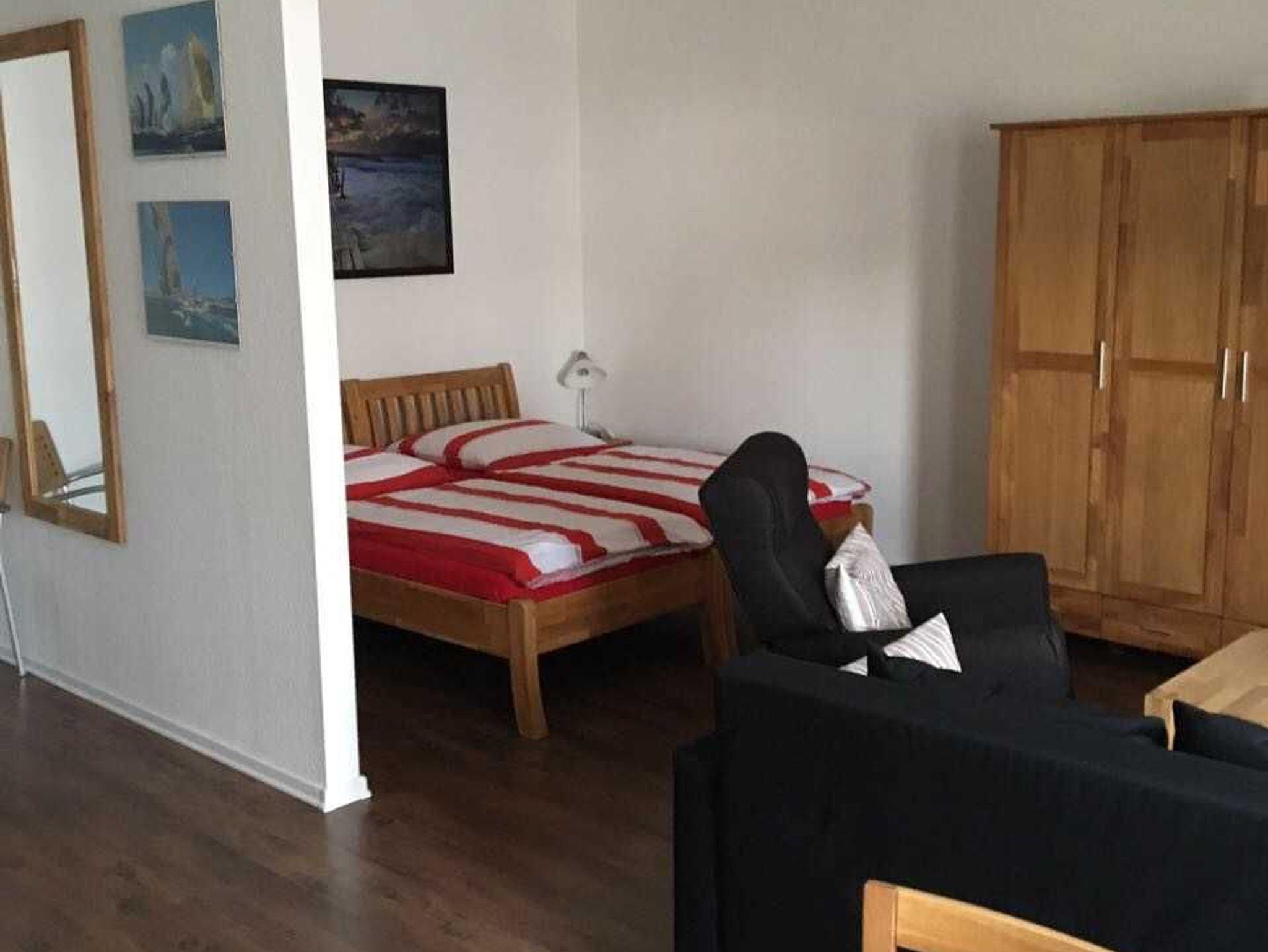 Die Studiowohnung hat eine Terrasse mit Blick aufs Wasser. Im der Wohnküche befindet sich eine neue Schlafcouch (Februar 2025) sowie ein 1,80m Bett, was man auch auseinander stellen kann.