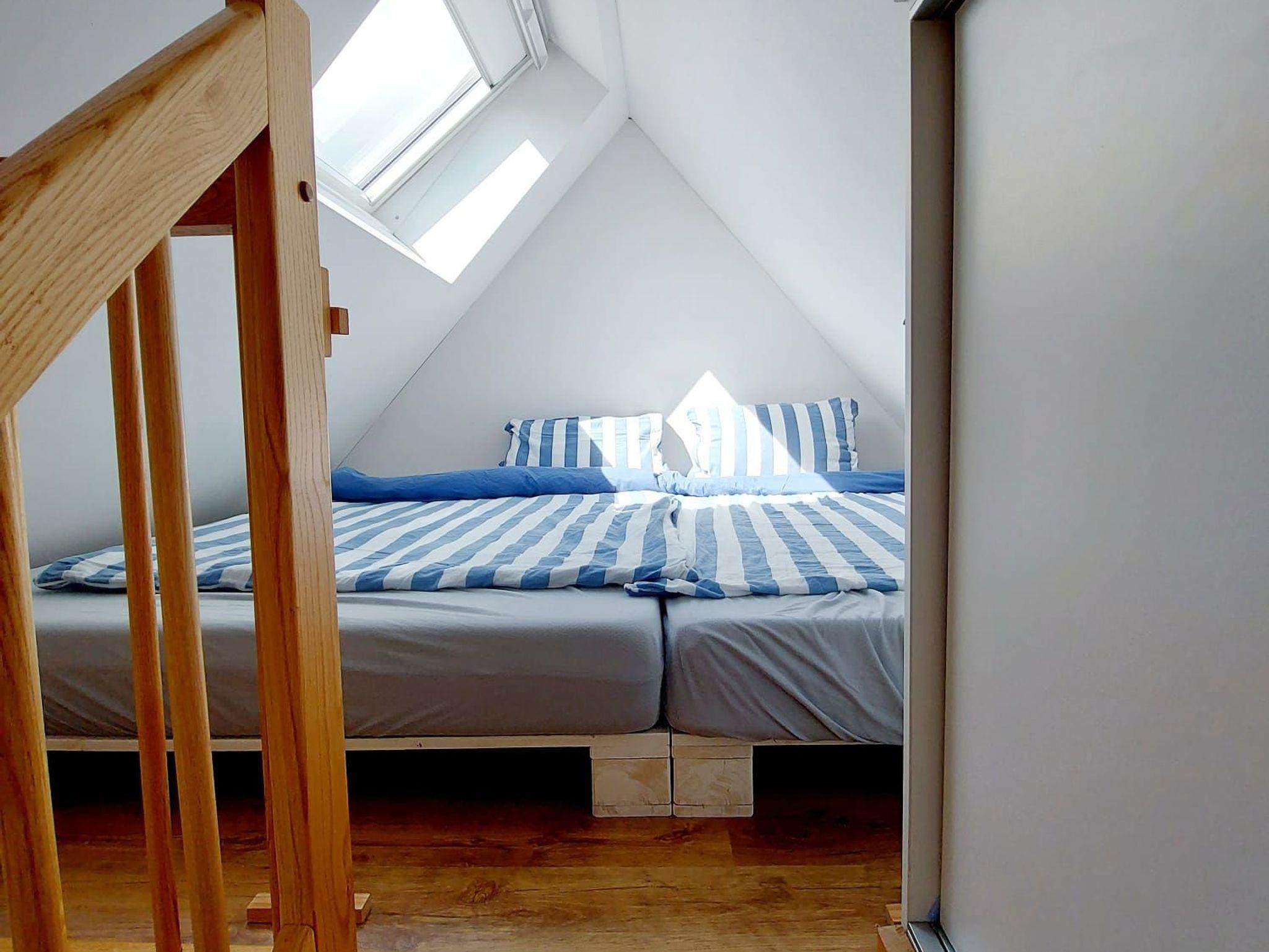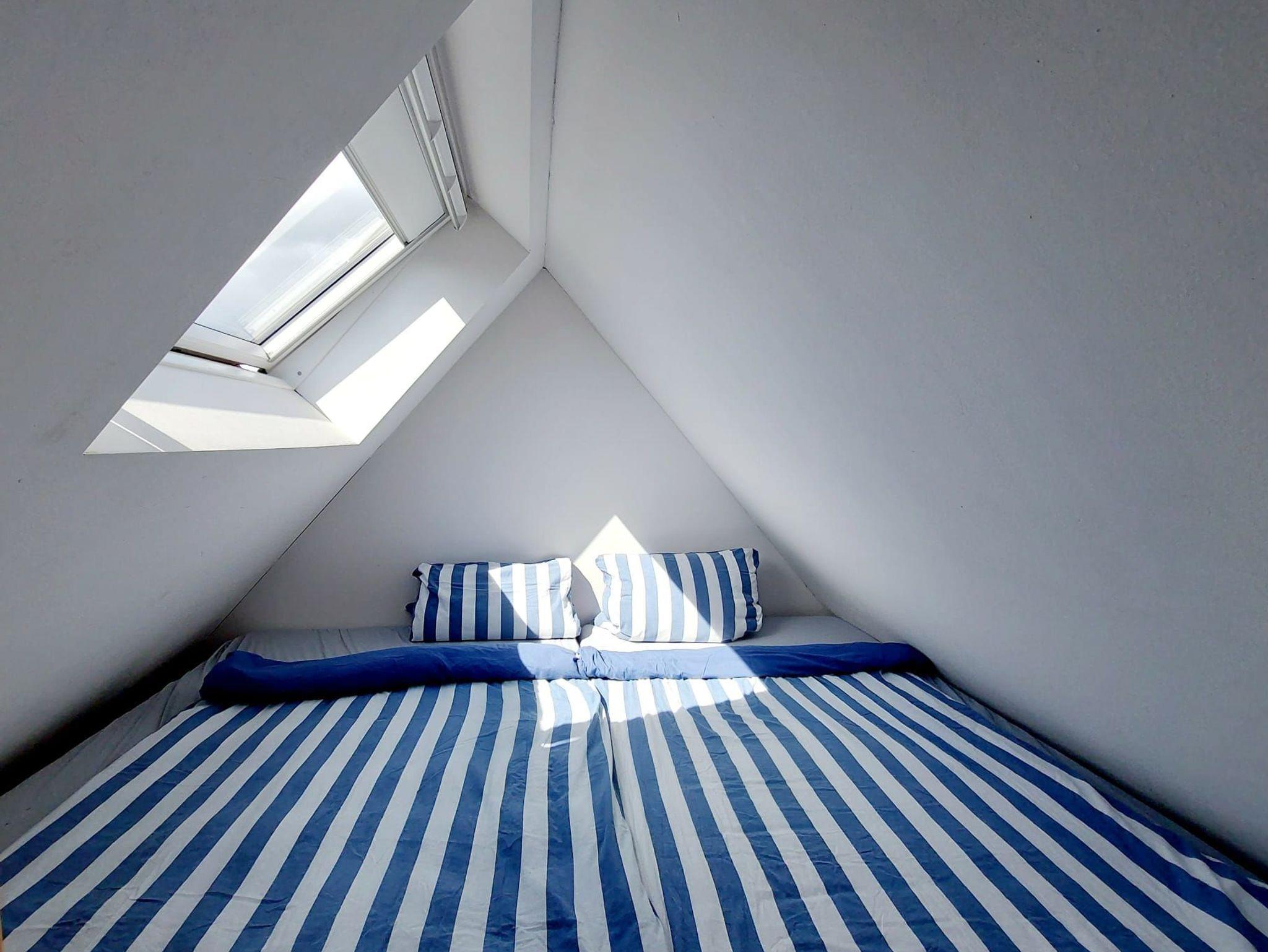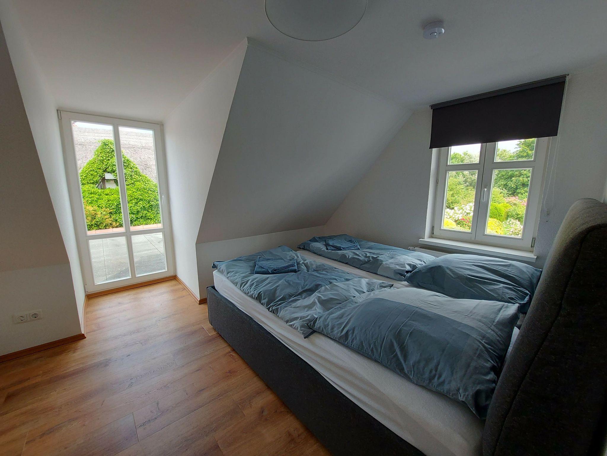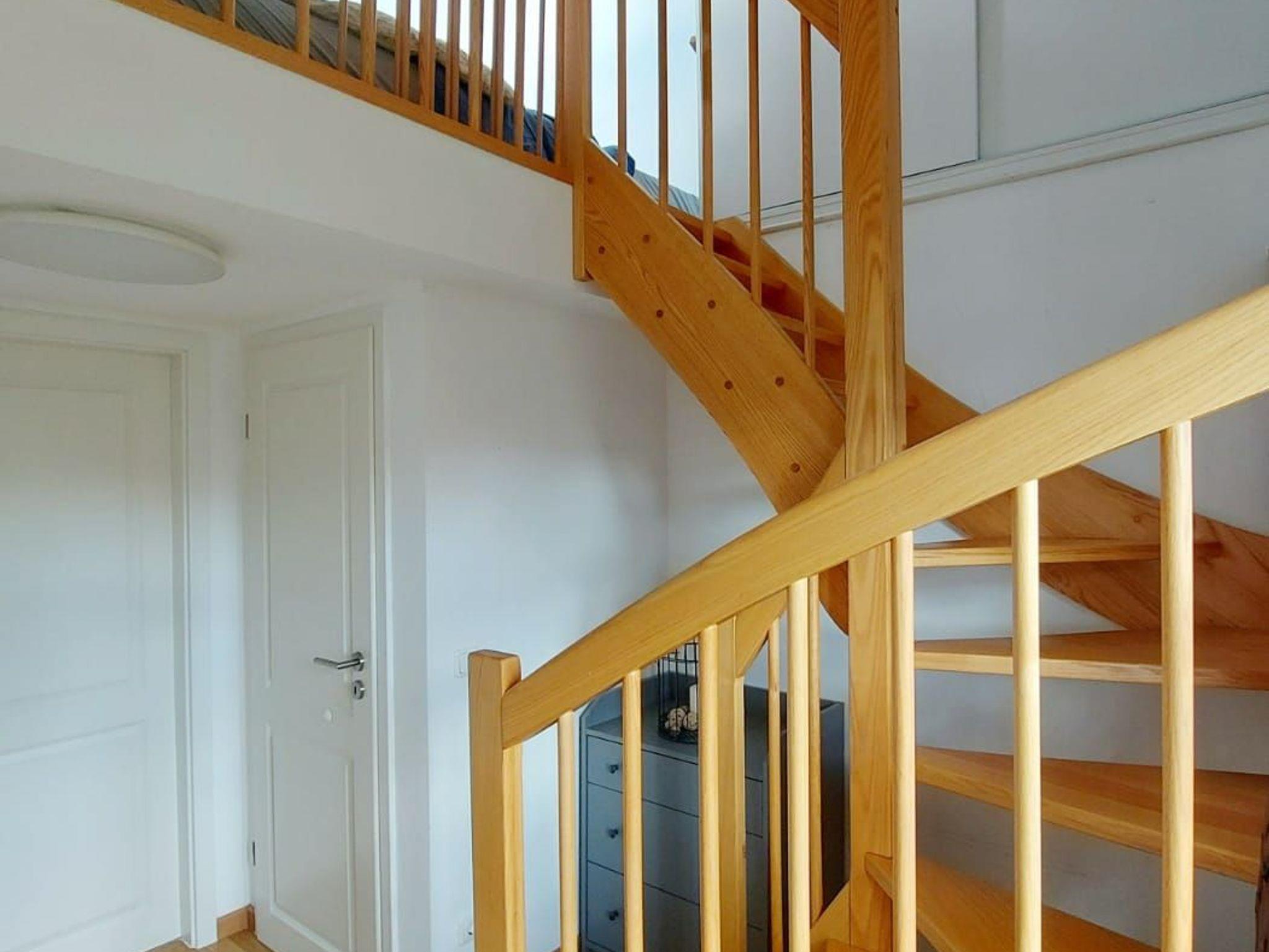 Über eine weitere Eichentreppe gelangt man ins Dachgeschoss, wo sich ein großzügiges Familienbett mit 3 Meter Breite befindet.