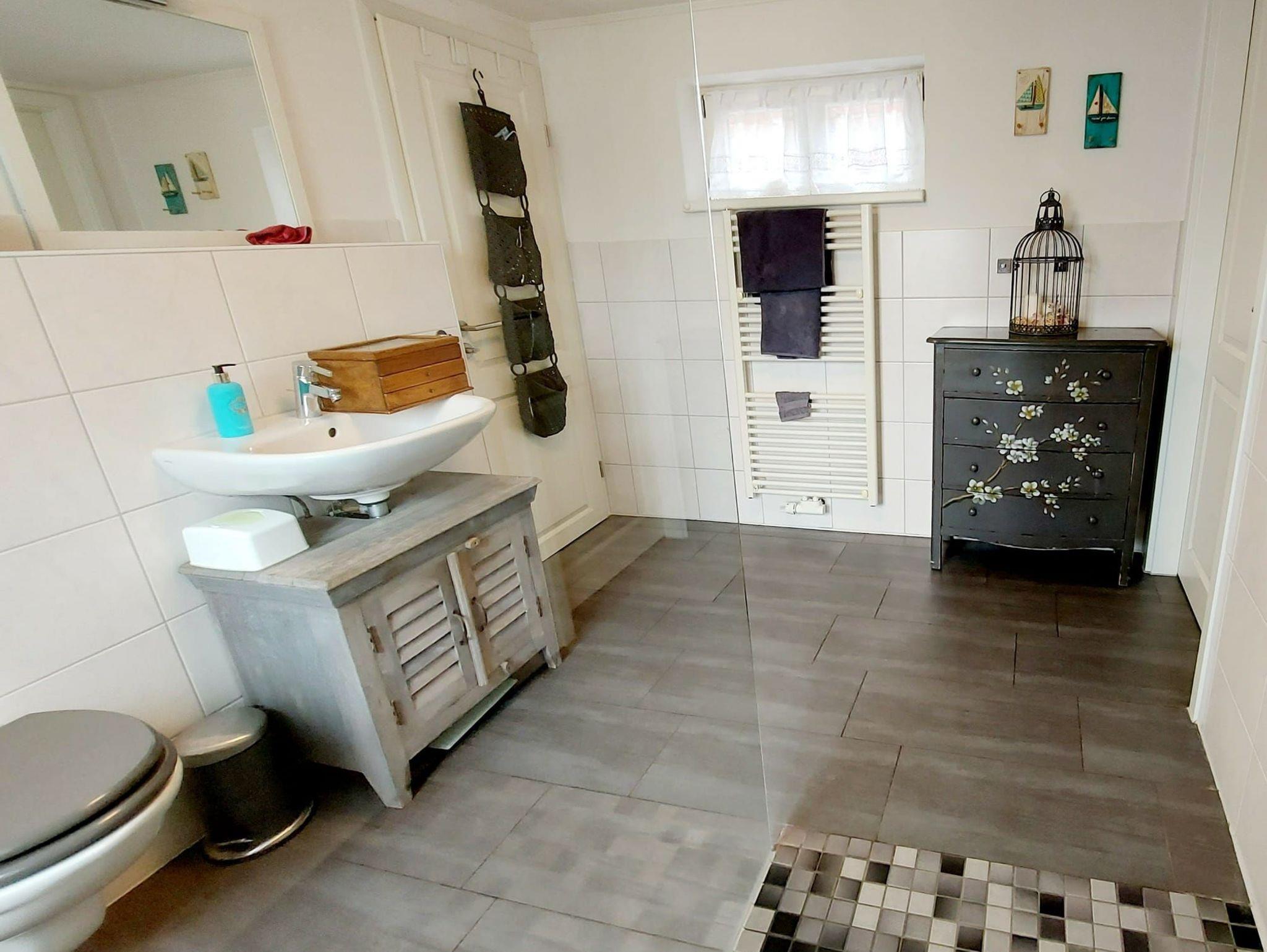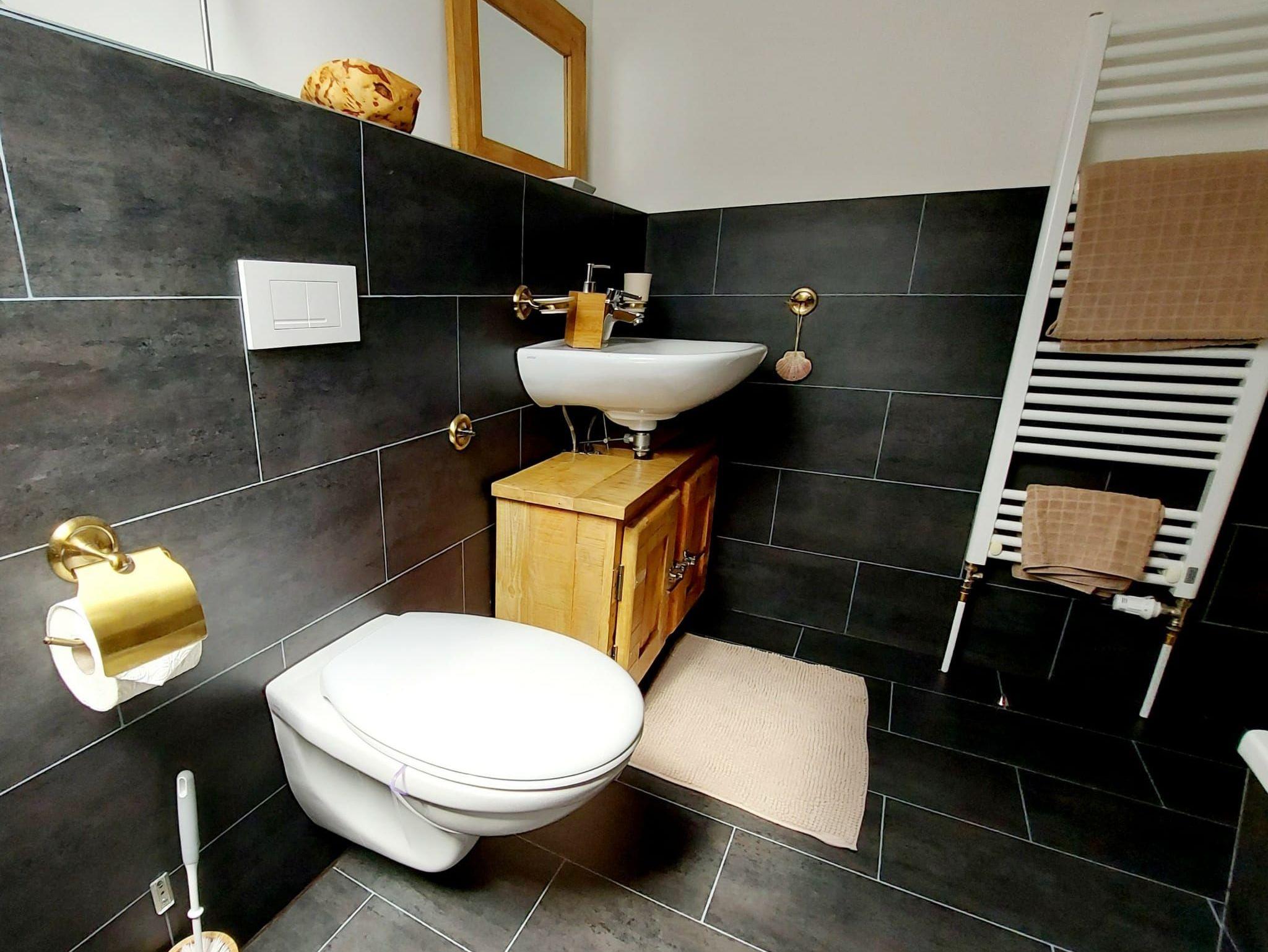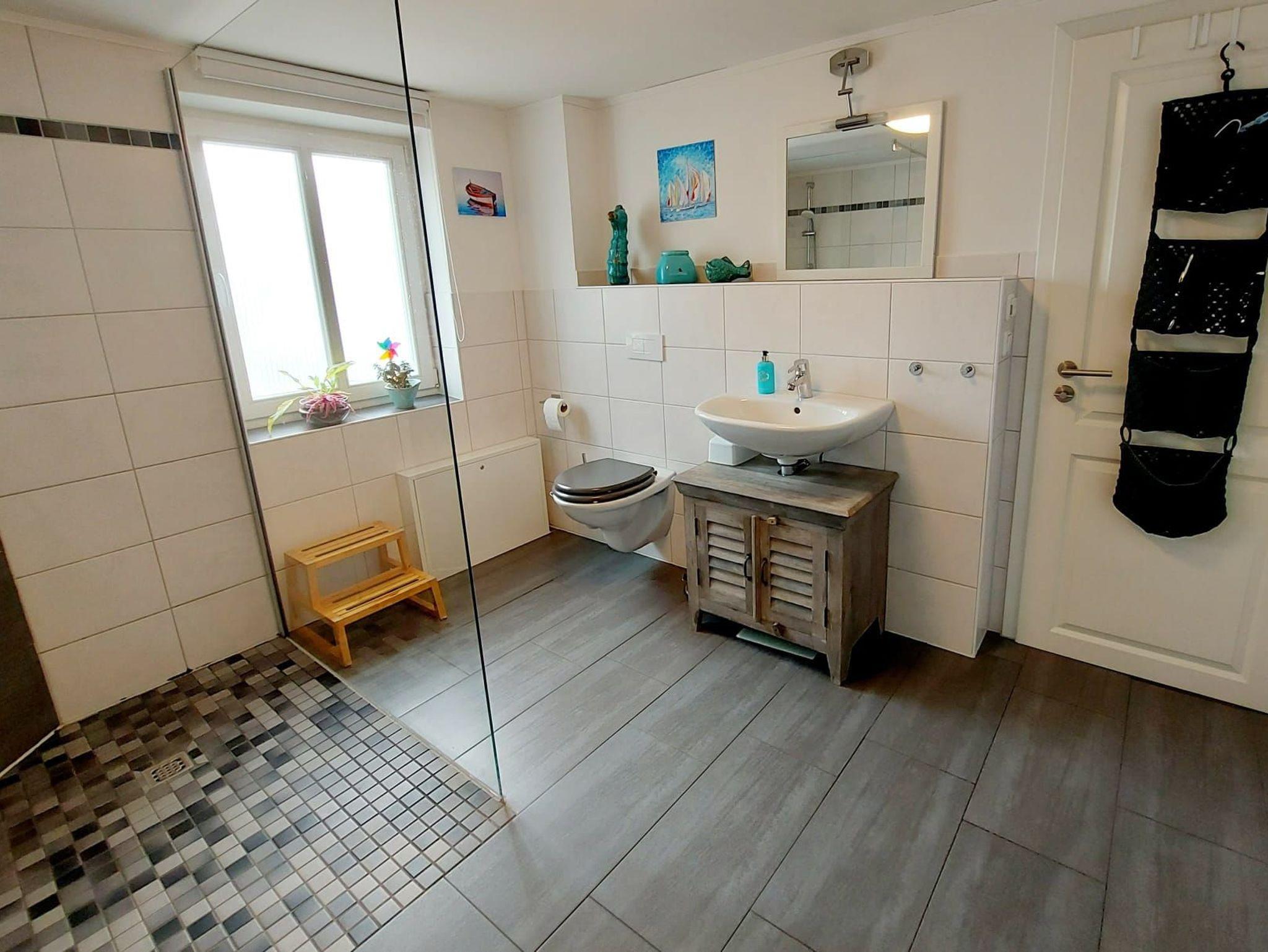 Die untere Etage verfügt über eine Fußbodenheizung. Hier befinden sich ein geräumiger Flur, das Wohnzimmer mit Essecke und Smart TV, die Küche mit weiterer Essecke sowie eines der beiden Badezimmer mit großzügiger ebenerdiger Dusche und WC.