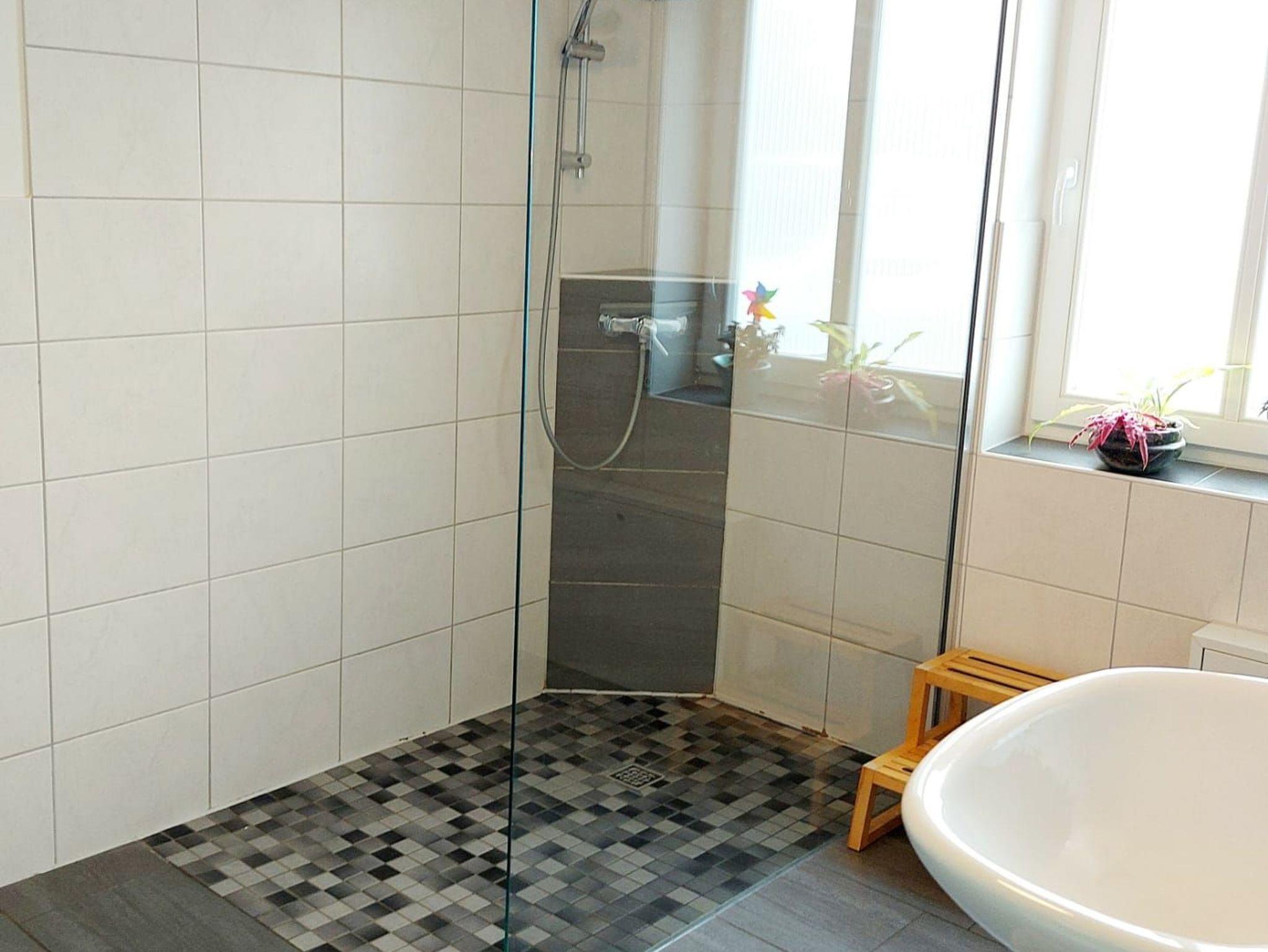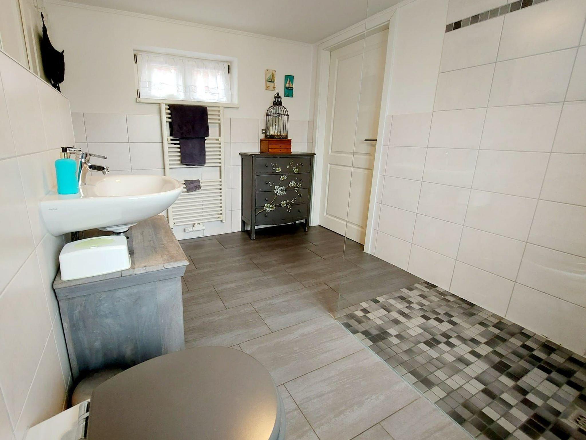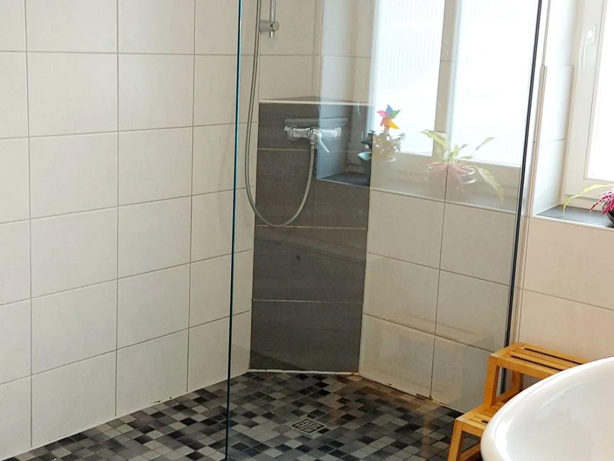 Die untere Etage verfügt über eine Fußbodenheizung. Hier befinden sich ein geräumiger Flur, das Wohnzimmer mit Essecke und Smart TV, die Küche mit weiterer Essecke sowie eines der beiden Badezimmer mit großzügiger ebenerdiger Dusche und WC.
