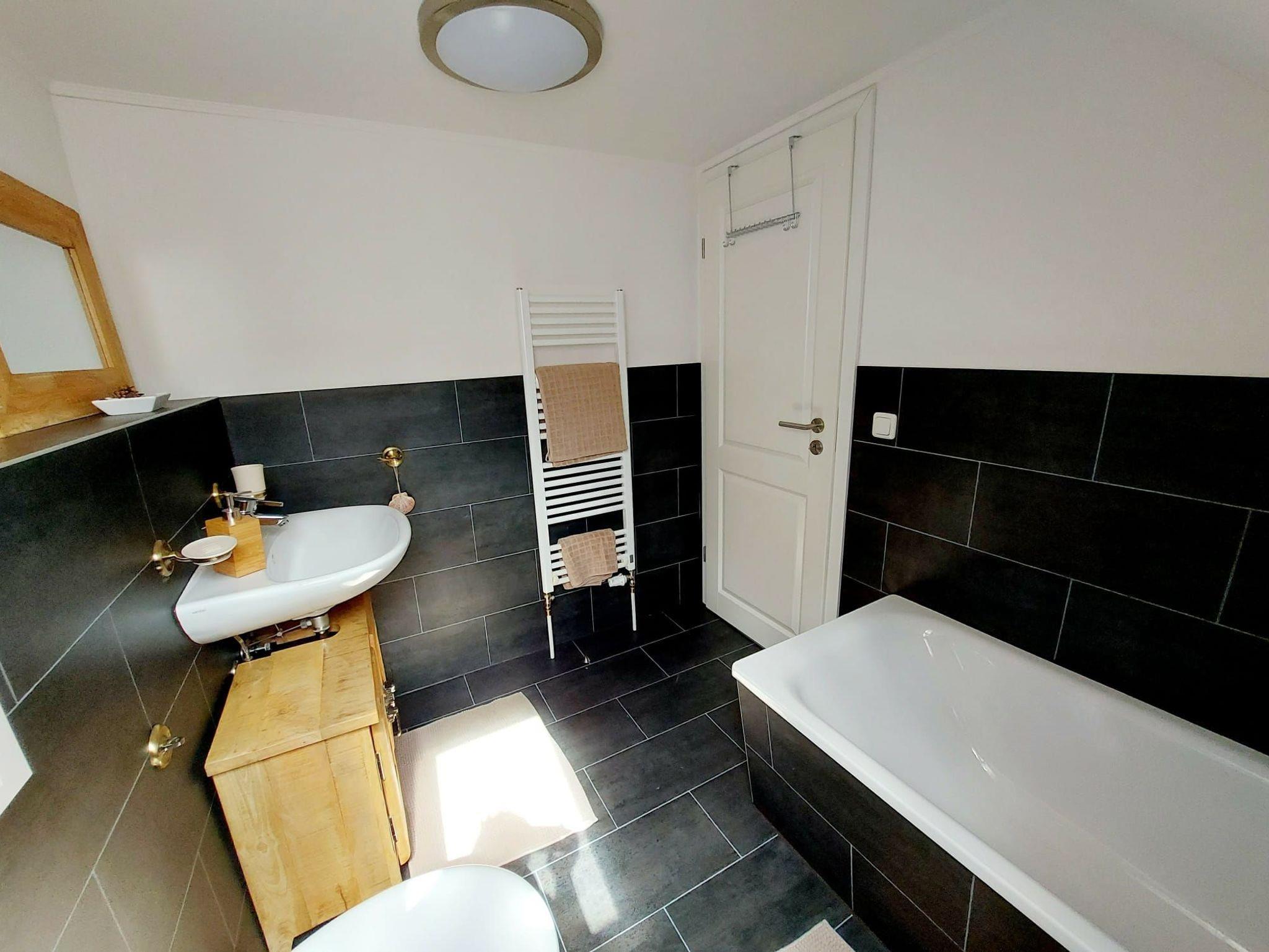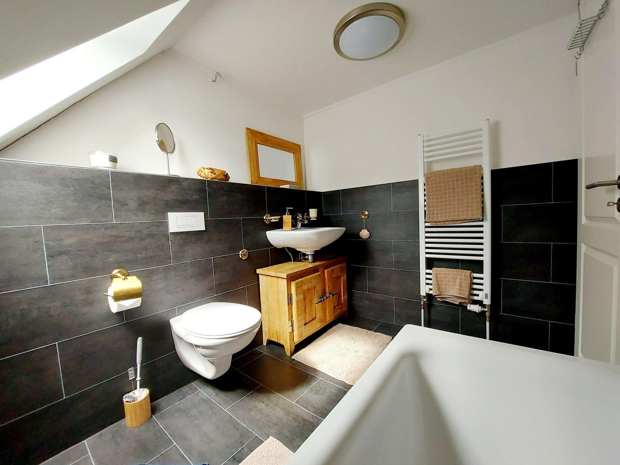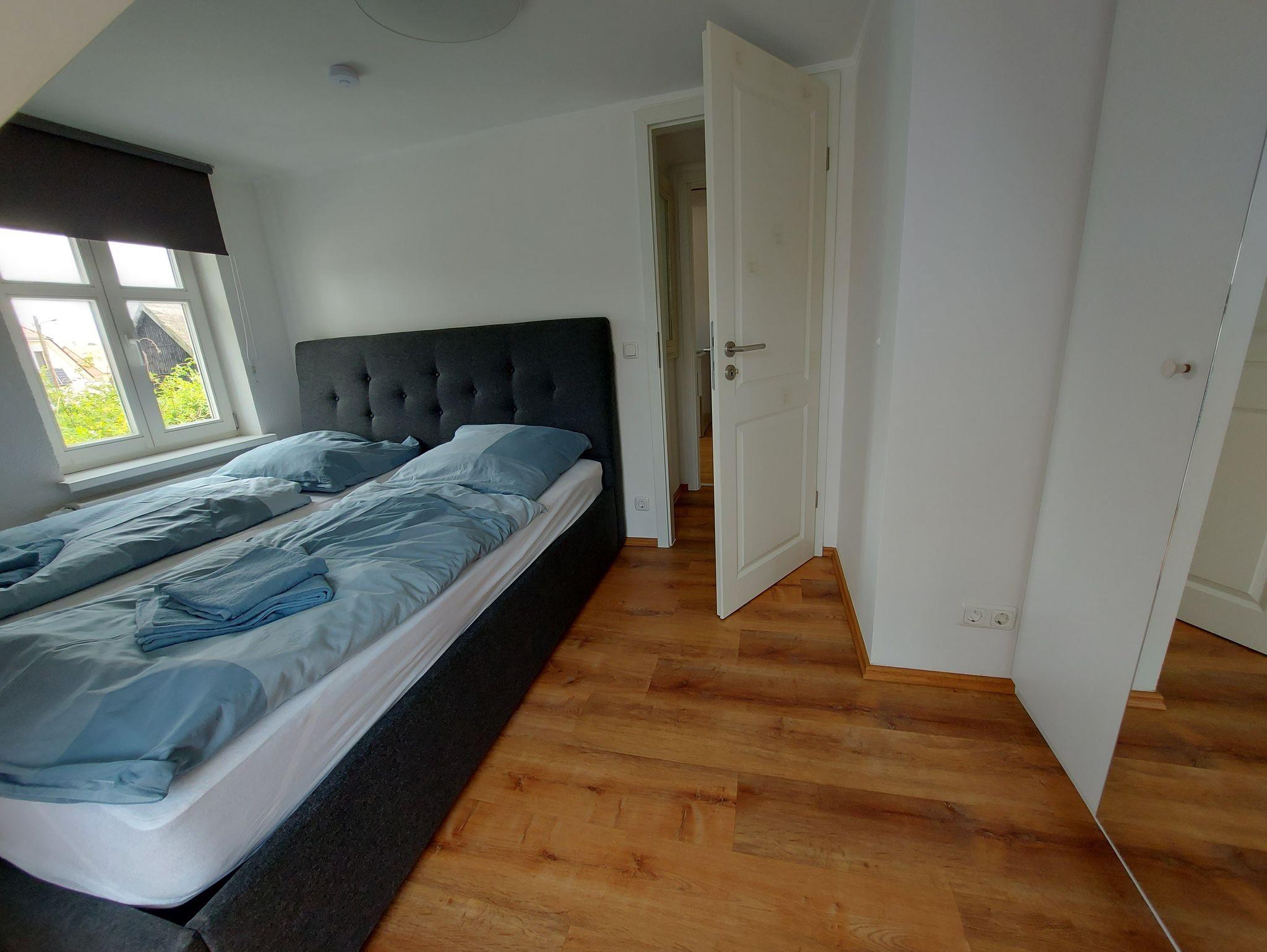Über eine Eichentreppe erreicht man die obere Etage mit einem Schlafzimmer mit Doppelbett, einem weiteren Schlafzimmer mit Einzelbett und Schreibtisch (Arbeitsecke). Das zweiten Badezimmer mit Wanne und WC befindet sich ebenso im 1.OG..