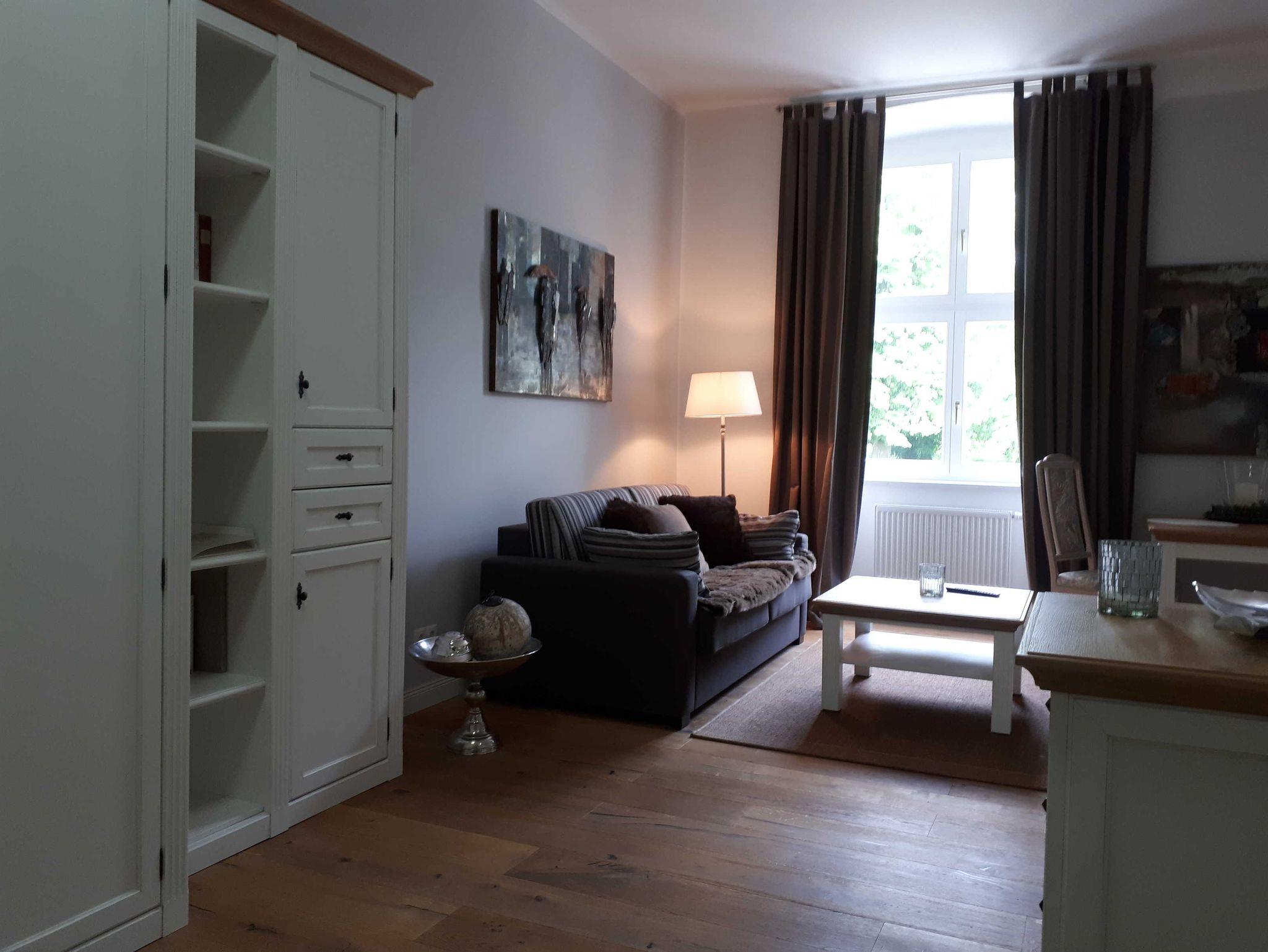 Die Schloss Superior Suite (60 m²) ist ein großzügig geschnittenes, modern eingerichtetes Apartment im Erdgeschoß mit separatem Schlafzimmer und großem Doppelbett (1,80 x 2,00).