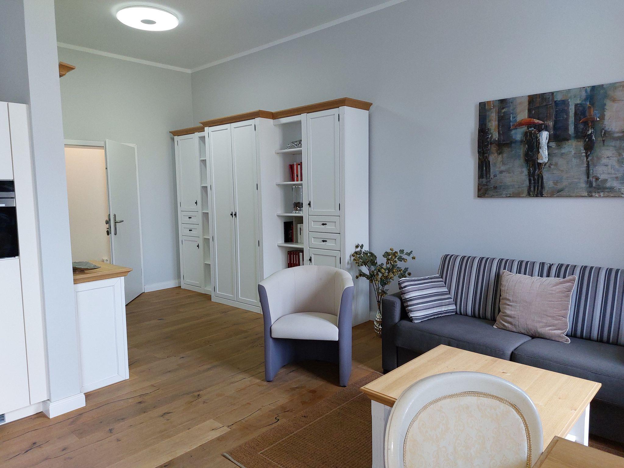 Das Wohnzimmer ist mit einer großen Schlafcouch (1,60 Meter breit), sowie einer hochwertigen, modernen Küchenzeile inklusive Geschirrspülmaschine, Nespresso Kaffeemaschine und weiteren Küchenutensilien ausgestattet.
