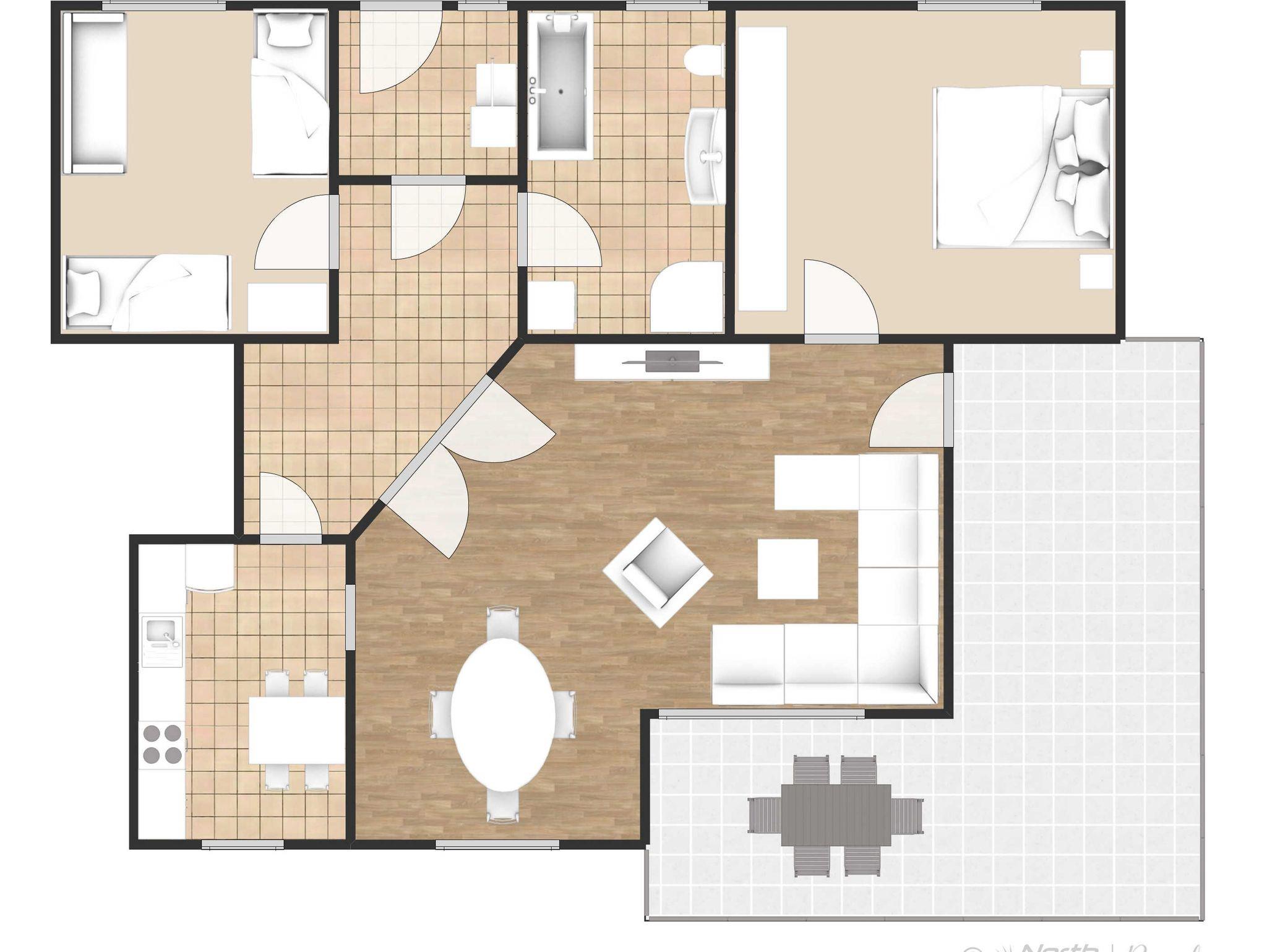 Ein Schlafzimmer ist mit einem Doppelbett (200x200cm), das andere mit zwei Einzelbetten (90x200cm) eingerichtet. Bei Bedarf können die Räume mit elektrischen Rollos abgedunkelt werden.