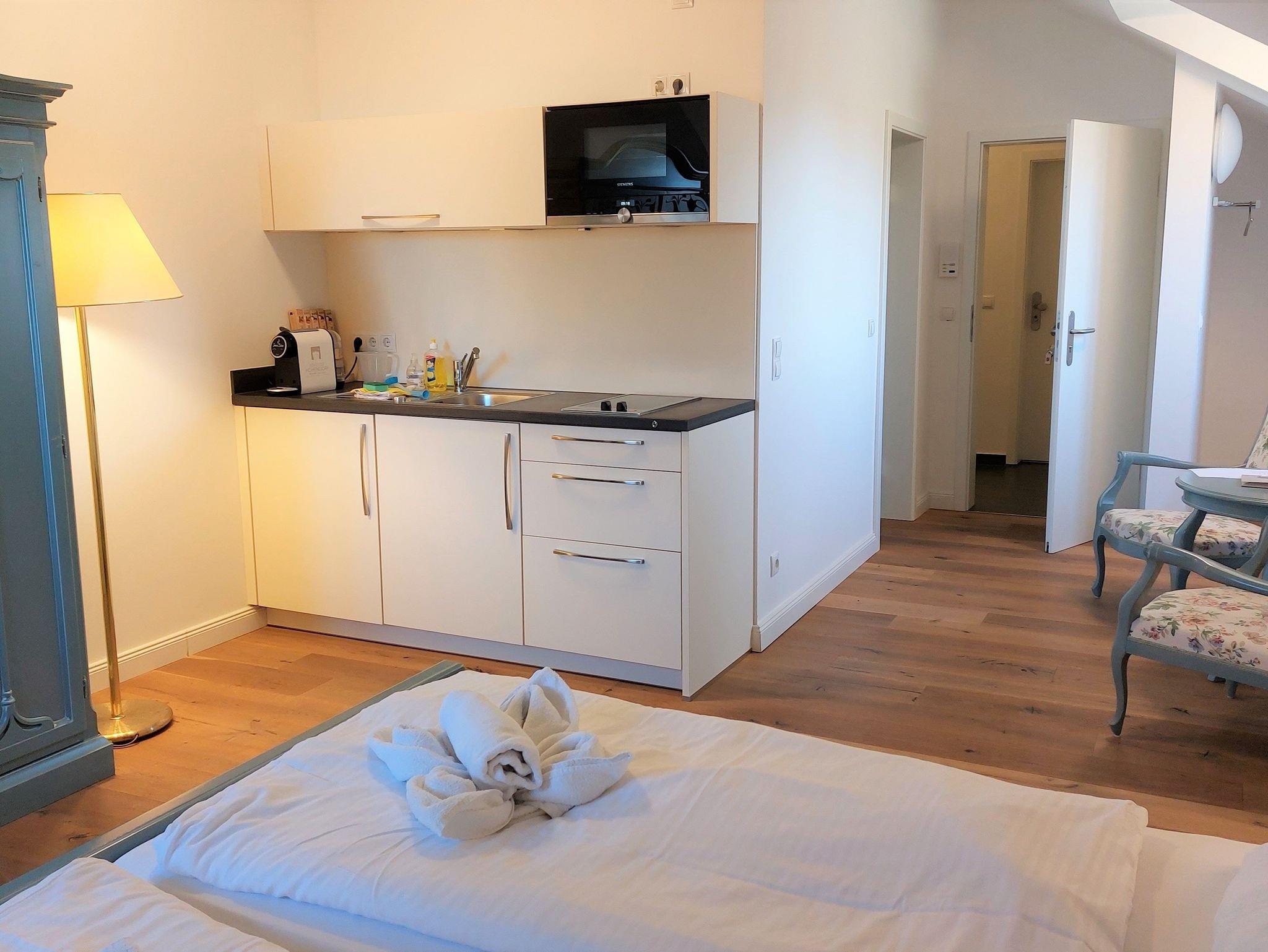 Die Schloss Studios liegen im 1. Stock oder im Dachgeschoss mit Blick in den vorderen oder hinteren Park. Alle Apartments sind mit dem Aufzug zu erreichen. Sie sind modern-minimal oder klassisch ausgestattet und verfügen über eine moderne Küche mit Nespresso Kapselkaffeemaschine und weiteren Küchenutensilien ..