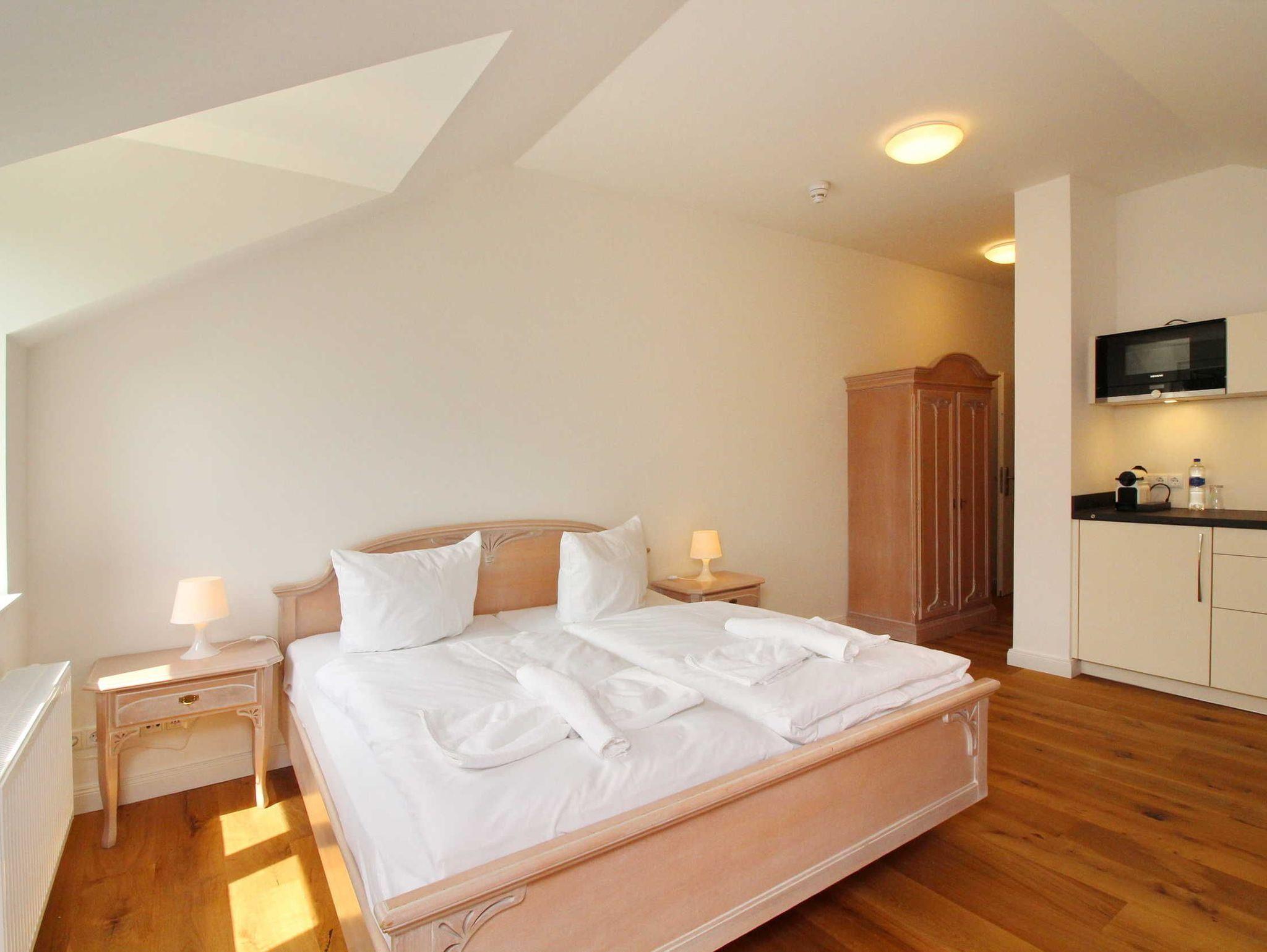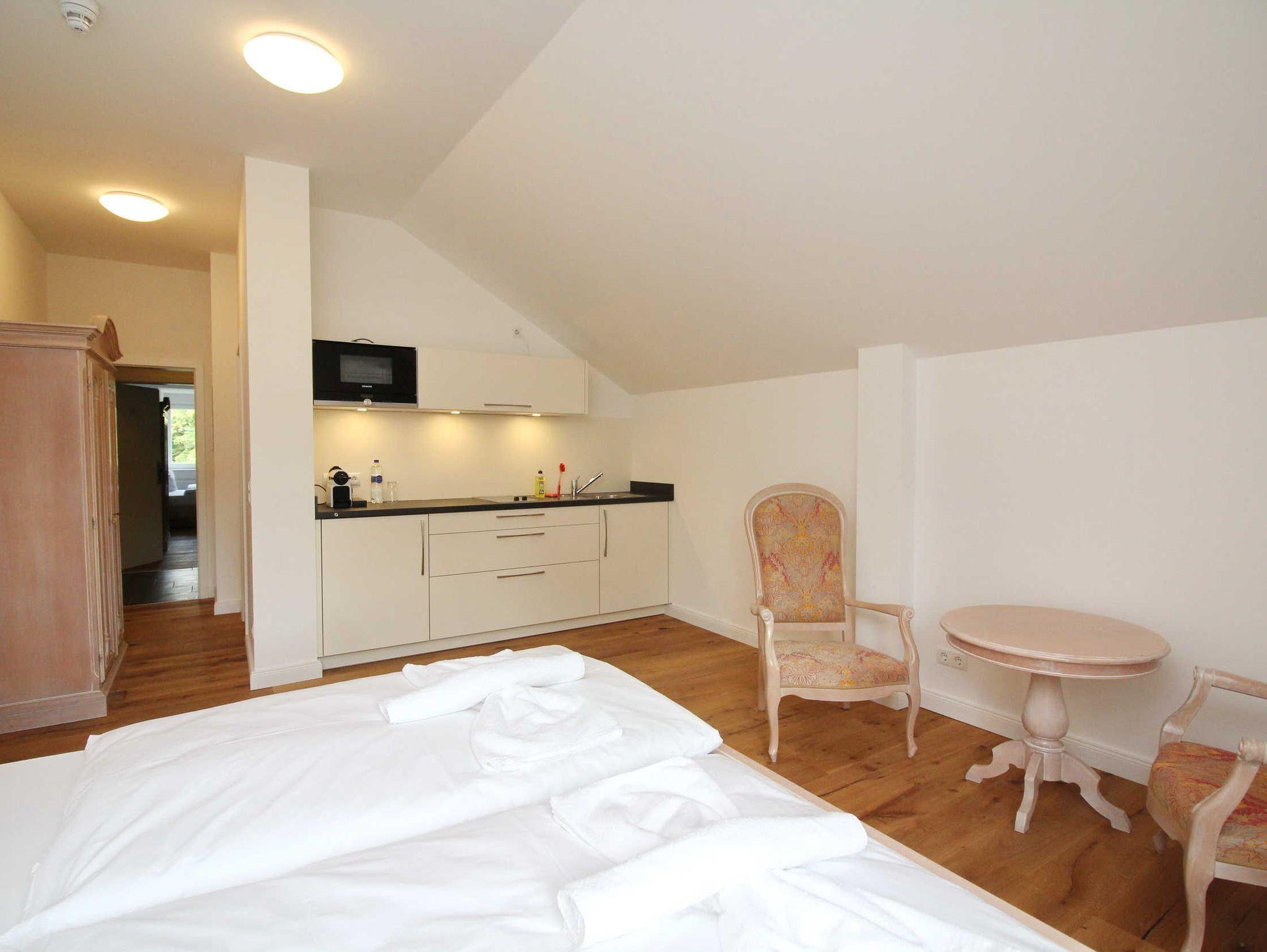 Die Schloss Studios liegen im 1. Stock oder im Dachgeschoss mit Blick in den vorderen oder hinteren Park. Alle Apartments sind mit dem Aufzug zu erreichen. Sie sind modern-minimal oder klassisch ausgestattet und verfügen über eine moderne Küche.