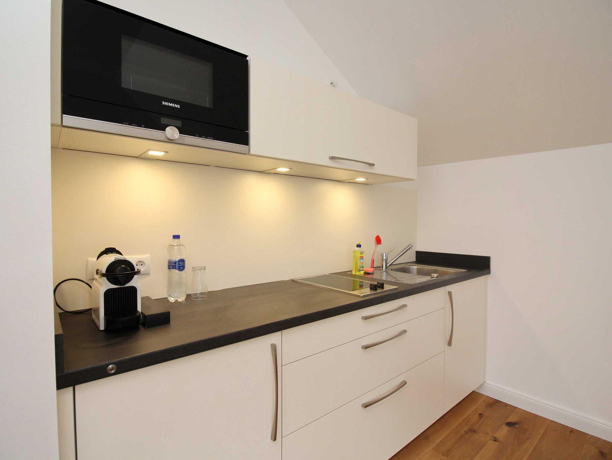 Alle Wohnungen sind ausgestattet mit einer modernen Küchenzeile, einem Kühlschrank und einer Backofen-/Mikrowellen-Kombination. In Anlehnung an das Gesamtkonzept der Kontraste ist das klassische Schloss innen hochmodern eingerichtet. So gibt es auch für Feriengäste sowohl modern, als auch klassisch ausgestattete Apartments.