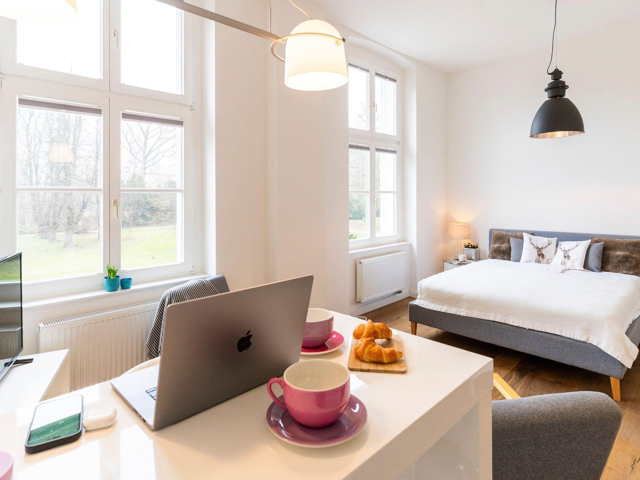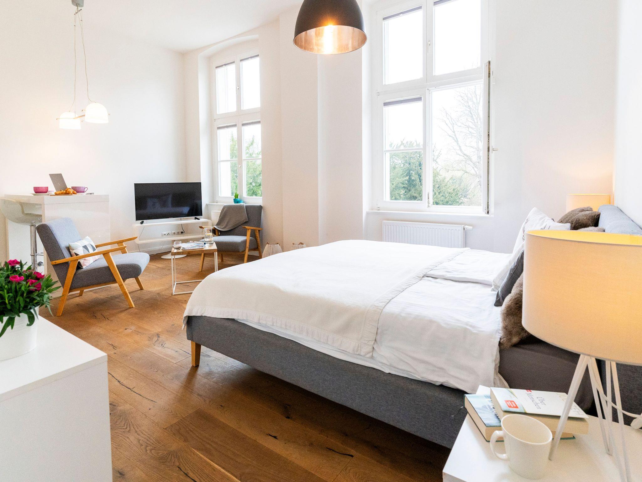 Modern eingerichtetes Schloss-Apartment in Hohendorf mit WLAN und SMART-Frühstück, ideal für entspannte Tage in historischem Ambiente.