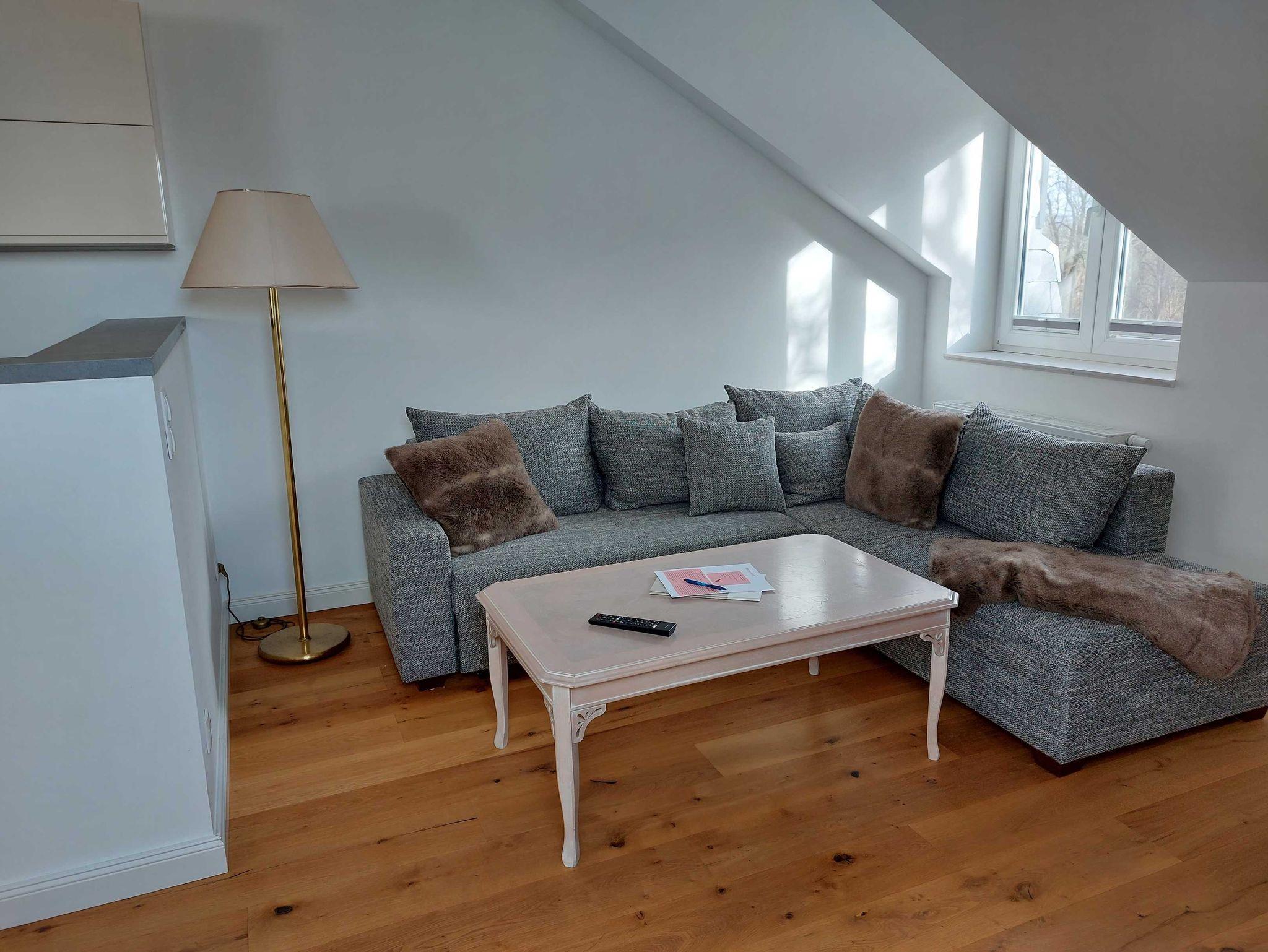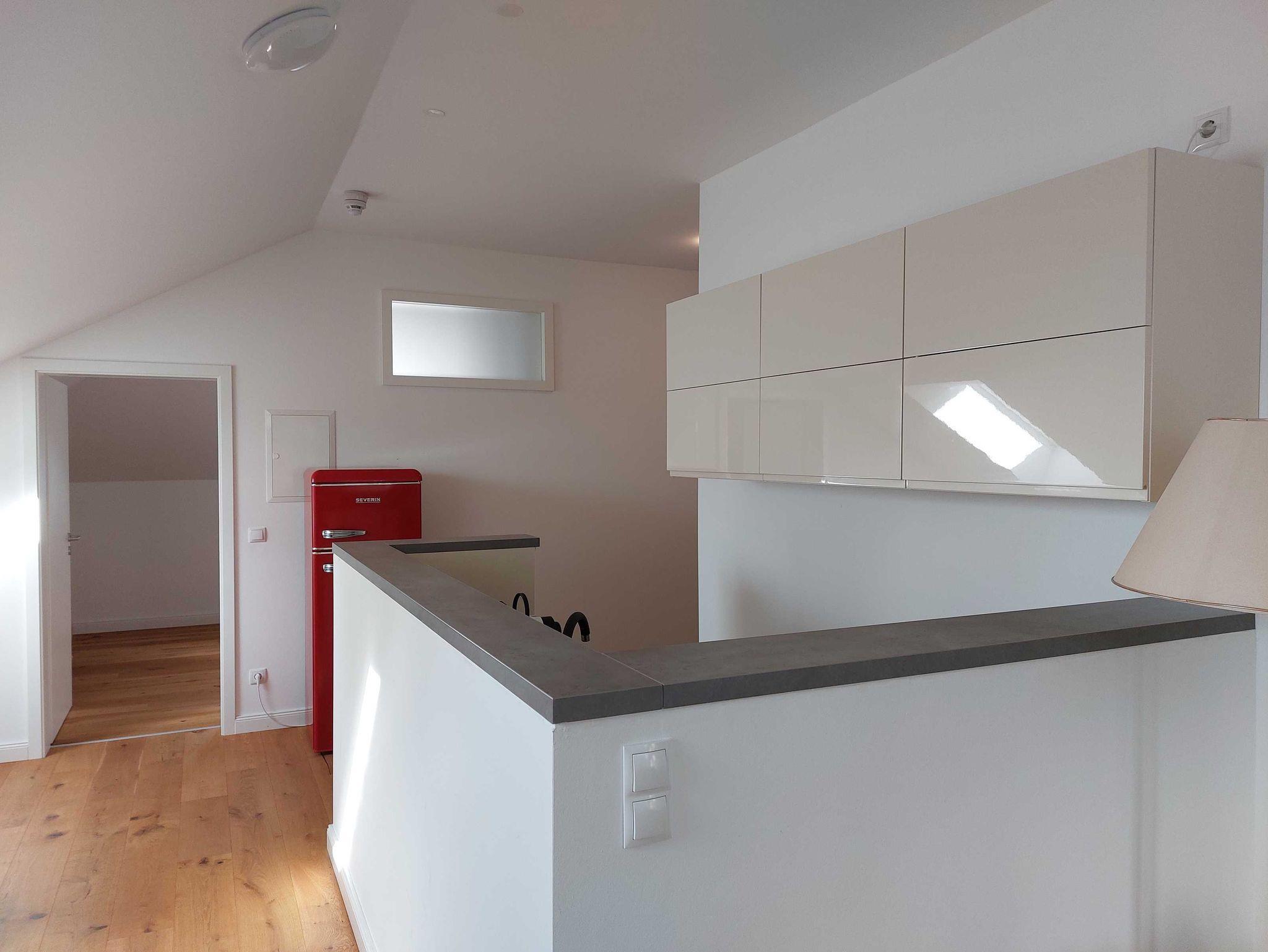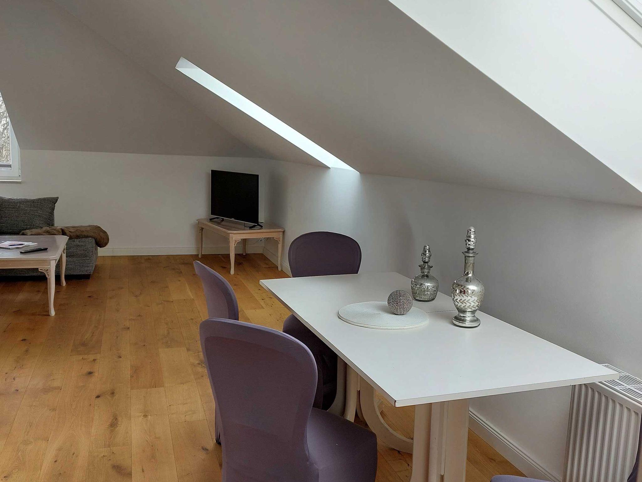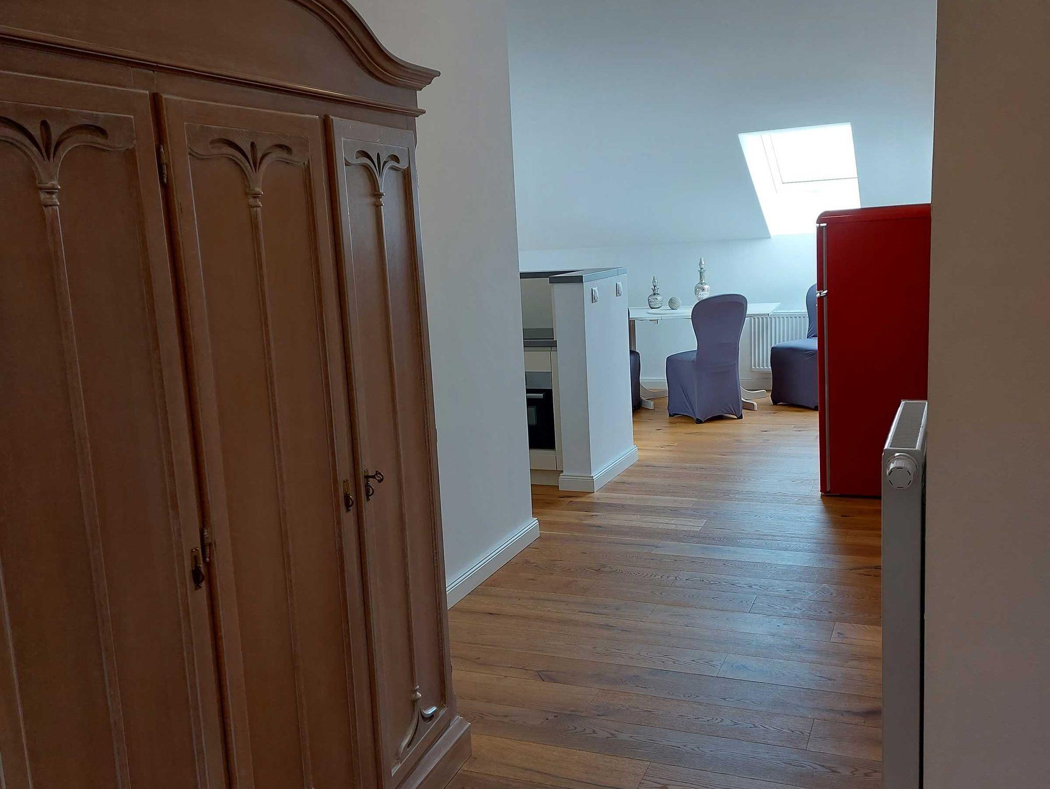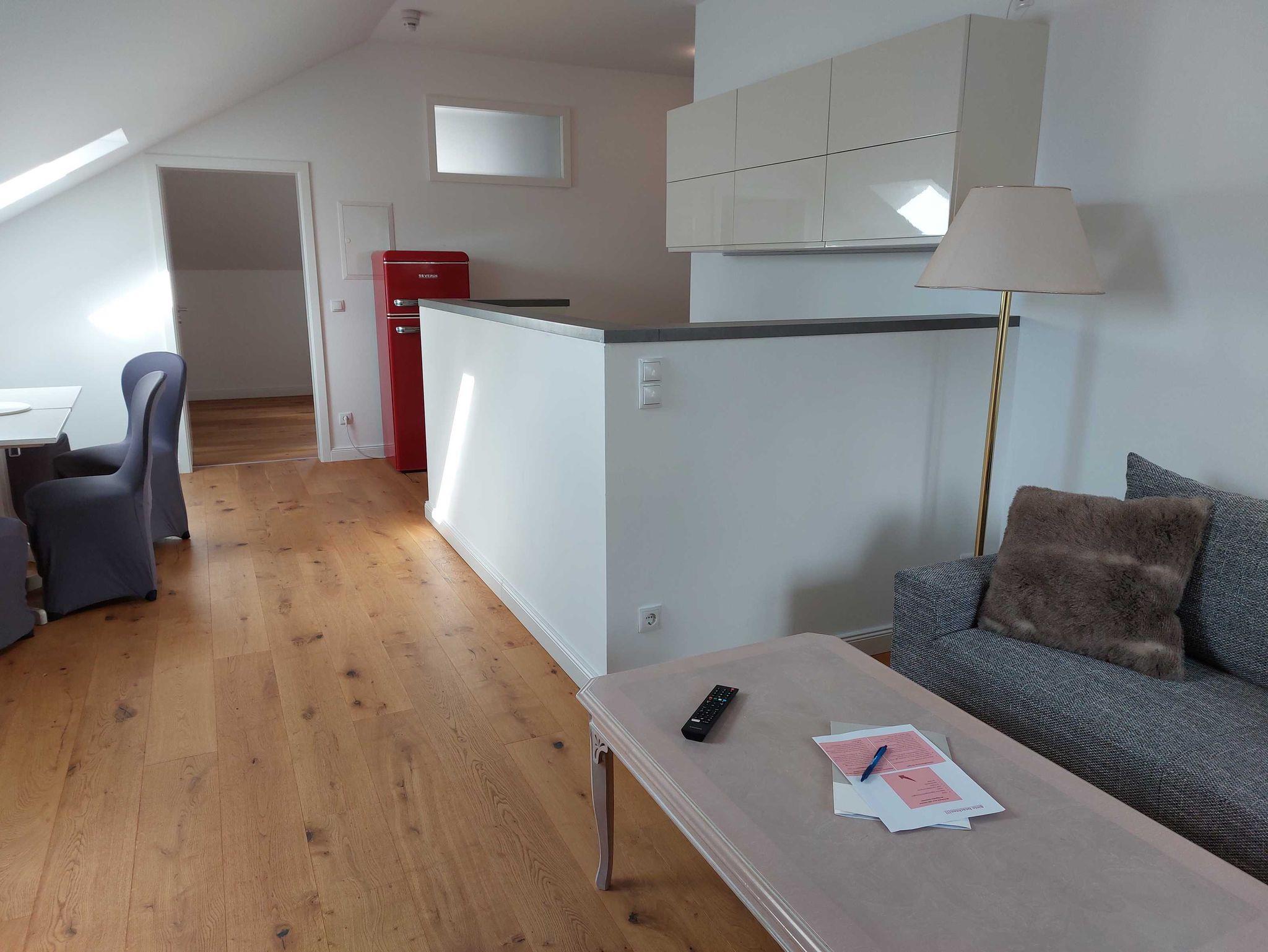 Diese Dachgeschosswohnung hat ihren eigenen Charme: ein separates Schlafzimmer mit Doppelbett (1,80 Meter breit) mit zauberhaftem Blick auf die vielen kleinen Türme des Schlosses, ein Bad mit Tageslicht, eine Barküche mit Esstisch und eine gemütliche Schlaf-Sofaecke (1,60 Meter breit) machen es besonders. Die offene Küche zum Wohnraum hin, ist mit einer Nespresso Kaffeemaschine und weiteren Utensilien ausgestattet.