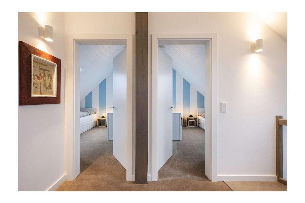 Verbringen Sie einen wunderbaren erholsamen Urlaub im Küstendorf Groß Schwansee! "Jules Hus" befindet sich frei stehend auf einem großen Grundstück mit unverbautem Blick auf Felder und Wiesen gen Süden. Aus der oberen Etage kann man an heiteren Tagen in nordwestlicher Richtung die Lübecker Bucht sehen. Das Haus liegt in fußläufiger Entfernung zum wildromantischen Strand - Sie laufen dorthin durch ein kleines Reetviertel, am Schloß vorbei und durch eine sehr schöne Baumallee. Bei gutem Wetter bietet ein sympathischer Strandkiosk direkt am Strandübergang alles für das leibliche Wohl. Dort können auch hochwertige Mountainbikes und Stand-Up-Paddeling Boards gemietet werden. In der Brasserie des Schlosses können Sie ab mittags schlemmen. Das große Ferienhaus vereint zum eine pure Architektur mit skandinavischer Gemütlichkeit. Im Erdgeschoss befinden sich der Eingangsbereich mit Garderobe, ein großzügiges Duschbad mit Regendusche, eine Sauna sowie ein zentraler Wohnbereich, in dem man wunderbar die Seele baumeln lassen kann. Das TV-Gerät empfängt Satellitenfernsehen und erlaubt Ihre eigenen Streaming-Konten zu nutzen. Über Bluetooth können Sie Ihre Musik über die Stereoanlage abspielen, Radio und CD laufen selbstverständlich auch. Die Küche ist großzügig mit schönem Geschirr ausgestattet. Gekocht wird mit Induktion. Spülmaschine ist vorhanden. Im Hauswirtschaftsraum stehen Ihnen eine Waschmaschine und ein Trockner zur Verfügung. Vom Wohn-/Essbereich haben Sie direkten Zugang zur großen, möblierten und sonnigen Terrasse (Südausrichtung). Grill, Feuerkorb und großer Garten bieten Ihnen einen lauschigen Ort für Grillabende. Der Garten liegt in direkter Feldrandlage. Über eine schöne Holztreppe kommen Sie in das Obergeschoss mit 3 Schlafzimmern. Für die ganz kleinen Gäste gibt es ein stabiles Gitterbett (60x120cm), eine Wickelauflage, eine Babybadewanne und einen Hochstuhl. Das gemütliche Haus mit erstklassigem Wohnkomfort hat mit ca. 117 m² Platz für 7 Personen und 1 Baby. Die Betten/Matratzen sind auf 4 Erwachsene und 3 Kinder ausgelegt. Hier können 3 Generationen zusammen Urlaub verbringen. Mögliche Unterbringung: - großes Schlafzimmer mit Doppelbett, Babybett und Tagesbett (letzteres kann für kleinere Kinder zum Schlafen genutzt werden) - kleines Schlafzimmer mit 2 Einzelbetten, ein Bett davon kann jeweils ausgezogen werden - kleines Schlafzimmer mit 2 Einzelbetten, ein Bett davon kann jeweils ausgezogen werden Kostenfreies WLAN ist vorhanden. Der PKW-Stellplatz ist direkt vor dem Haus. Familien mit Kindern können hier einen unbeschwerten Urlaub verleben und sich ausgiebig erholen. Wellness-Liebhaber werden die Sauna und den Kamin genießen.