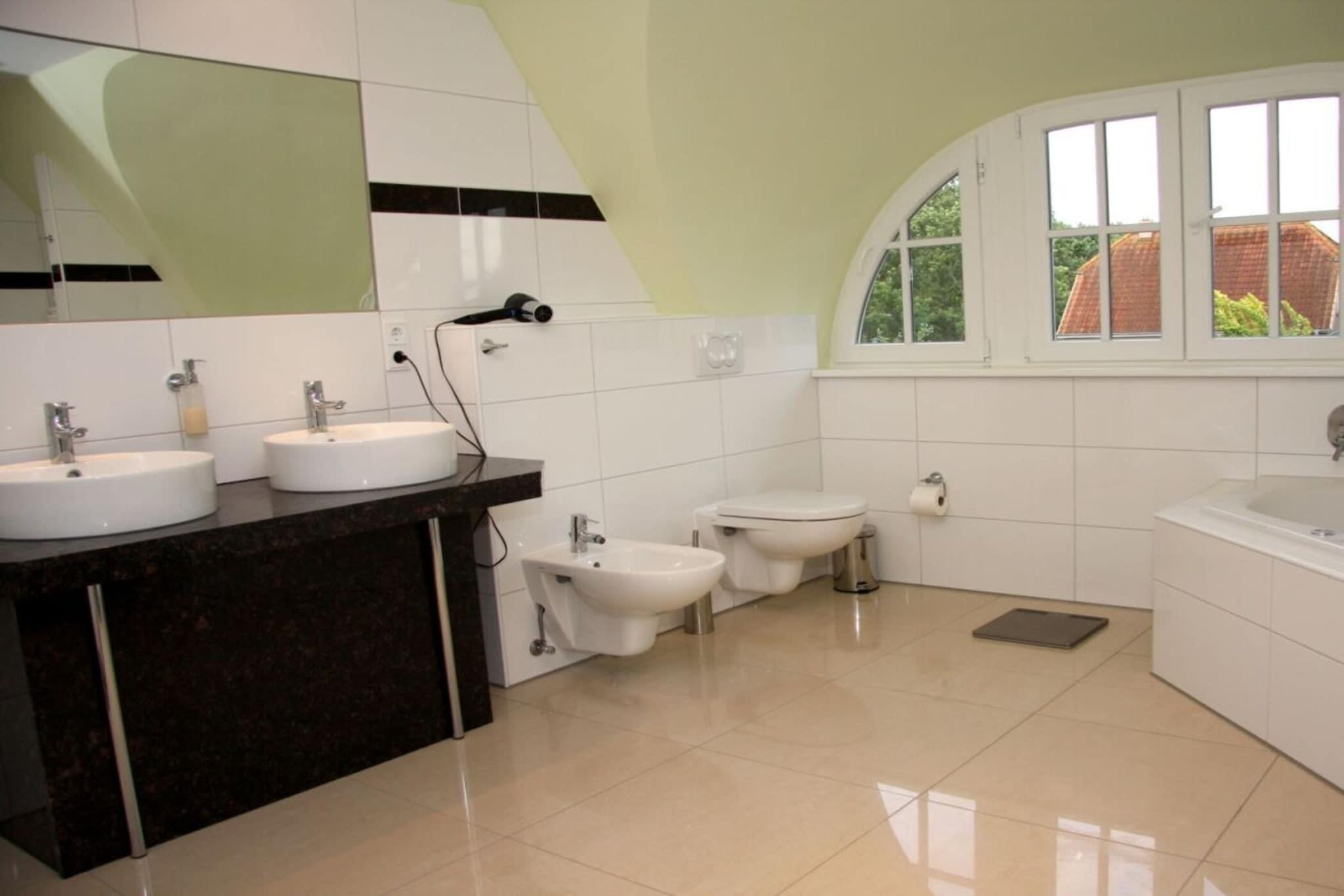 Die Villa "DUXCAAR / La Mer" ist zum wiederholten Male vom Deutschen Tourismusverband zertifiziert worden und erreichte zum vierten Mal in Folge die höchste Bewertung unter fast 70.000 zertifizierten Ferienhäusern in Deutschland. Die Villa bekam daher bereits 2010 die Auszeichnung "Deutschlands beste Ferienvilla" verliehen. Nach dem Eintritt in die Villa durch den eleganten Eingangsbereich empfängt Sie das großzügige offene ca. 60 qm große Wohn- Esszimmer mit offenem Kamin, Antiquitäten, HiFi System und einer internationalen Bibliothek, die für Sie umfangreiche Literatur in deutscher, englischer und französischer Sprache bereithält. Außerdem befindet sich dort unser ca 175 Jahre Top restaurierte Blüthner Konzertflügel. Bei einem guten Buch und einem Glas Rotwein aus dem hauseigenen Weinkeller und knisterndem Kamin werden Sie sich wünschen, dass die langen Winterabende nicht mehr enden mögen. Bei schönem Wetter haben Sie auch von Ihrem zweiten Wohnzimmer, einer ca. 60 qm großen Dachterrasse einen wunderschönen Blick über die weite Landschaft und in Richtung Ostsee. In der großen Küche haben Sie ausreichend Platz, auch umfangreichere Menüs zuzubereiten. oder sich auf Wunsch auch von unserem Hauskoch bekochen lassen können. Weiterhin finden Sie im Erdgeschoss ein komplett ausgestattetes Badezimmer mit separatem WC und einen Hauswirtschaftsraum mit Waschmaschine, Wäschetrockner, Reinigungsmöglichkeiten für Sportausstattung etc. Die Villa verfügt über eine große exklusiv ausgestattete Küche samt Hauswirtschaftsraum. Darüber hinaus gibt es eine zweite kleinere, modern ausgestattete Küche im Einliegerbereich. Es befinden sich insgesamt drei Kühlschränke in beiden Küchen zusammen. Beide Küchen verfügen über einen Backofen, in der großen Küche sogar einen extrabreiten Backofen von 90cm Breite. Die Villa verfügt über zwei separate Wohn- und Esszimmer, eines über 60qm groß mit großem Rundkamin, Blüthner Konzertflügel und Bibliothek und das zweite Wohn-/Esszimmer befindet sich in einem separatem Gebäudeteil und bietet eine Rückzugsmöglichkeit, gerade bei einer Belegung des Hauses mit mehreren 10 Gästen. Beide sind sehr großzügig mit hochwertigem Geschirr und einer großen Gläserauswahl ausgestattet. Neben den Wohnzimmern gibt es noch ein Lesezimmer und ein hochprofessionelles Arbeitszimmer mit entsprechender Büroausstattung (Bildschirm, Drucker großer Granitschreibtisch mit Bürostuhl), so dass auch ein "Workcation" Aufenthalt jederzeit möglich ist. Der Glasfaseranschluss ermöglicht auch ein störungsfreies Teilnehmen an Web-Meetings. Alle Betten verfügen über hochwertige Matratzen, zum Teil elektrische Lattenroste. Die meisten Schlafzimmer haben entweder eine gemütliche Sitzecke oder einen kleinen weiteren Arbeitsbereich. Die Betten sind bei Anreise bezogen mit blütenweißer hochwertiger Bettwäsche. Kinderzimmer mit Spieltisch und Spielsachen verfügbar. Alle Bäder sind hochwertig ausgestattet, drei Bäder sind Tageslichtbäder, weiterhin gibt es eine separate Toilette sowie einen abgetrennten Saunabereich. Wir stellen jedem Gast eine Auswahl von verschiedenen Handtüchern zur Verfügung und für die Erwachsenen zusätzlich einen flauschigen Bademantel. Der Pool mit ca 27° Wassertemperatur, Gegenstromanlage, Ruheliegen und separater Umkleide mit Dusche und WC steht nur den Hausgästen zur Verfügung. Die Villa verfügt über Fernseher (meist Smart TV) in beiden Wohnzimmern, der Küche sowie in den meisten Schlafzimmern und dem großen Arbeitszimmer natürlich auch. Die ganze Villa ist mit WLAN über Glasfasernetz ausgestattet, an welchen auch die meisten Fernseher angeschlossen sind. Der Garten mit altem Baumbestand sowie Sonnenliegen und insgesamt vier Terrassen ausgestattet und lädt zum Relaxen ein. Auch ein Weber Grill darf natürlich nicht fehlen. Ausreichend Parkplätze auf dem Grundstück sind vorhanden, eine Ladestation / Wallbox für Elektroautos steht gegen Gebühr zur Verfügung.