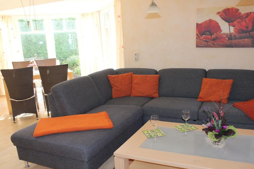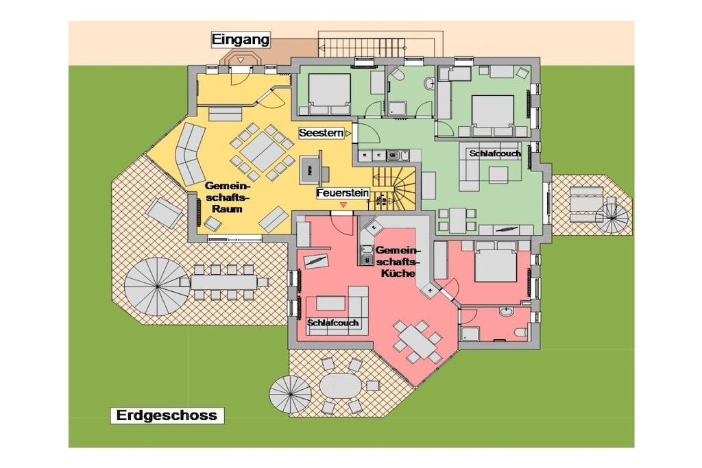 4 gemütlichen Ferienwohnungen als Rückzugsbereich und ein lichtdurchfluteter Gruppenraum lassen Ihren Urlaub in unserem Ferienhaus unvergesslich werden. Urlaubs-Garten, Liegewiese, Tischtennis und Spielplatz, Sauna und Grillplatz bieten Ihnen alles für eine glückliche Zeit. Sie wohnen in 4 wunderbar eingerichteten Ferienwohnung verteilt über 3 Etagen. In der Wohnung im neben dem Gruppenraum finden Sie eine großzügige Küche mit allen Inventar, um für viele Personen zu kochen und zum Spülen des Geschirrs gibt es im Haus 4 Geschirrspüler. Jede der Wohnungen mit Wohnzimmer mit Schlafcouch, ein- bzw. zwei Schlafzimmern, Bad und Küche hat einen ganz besonderen Charme. Im Untergeschoss finden Sie unsere mediterrane Sauna mit Ruhebereich.
