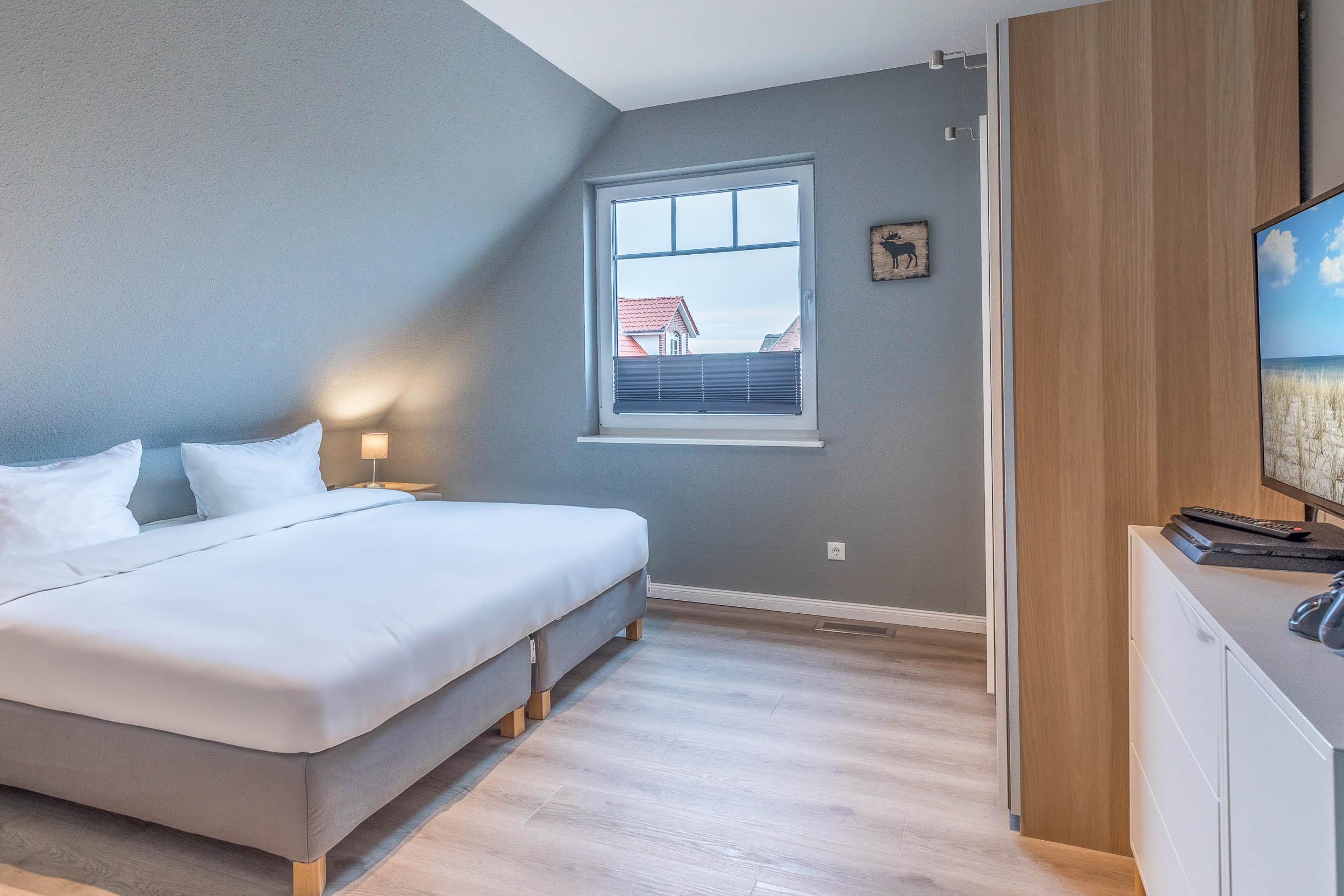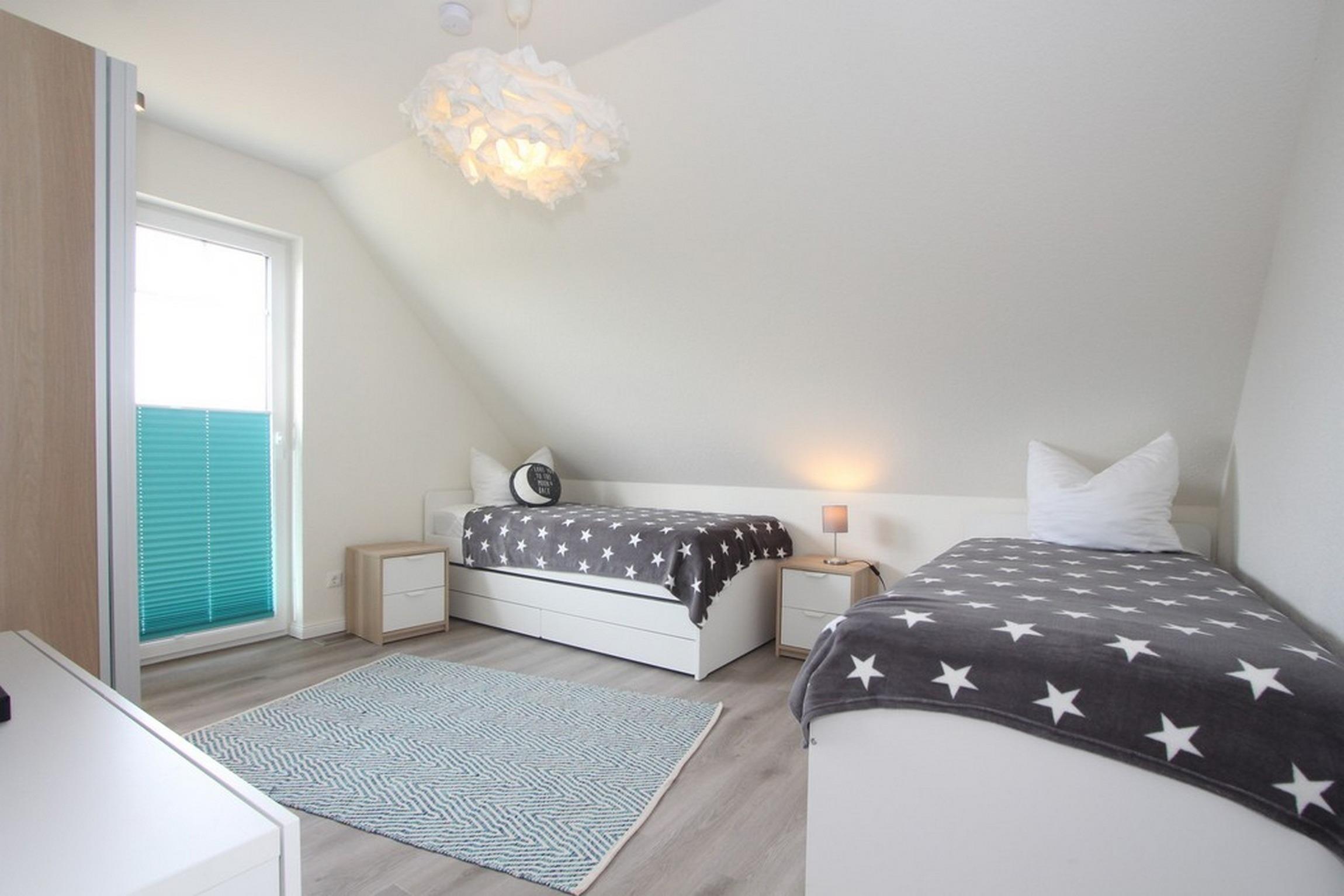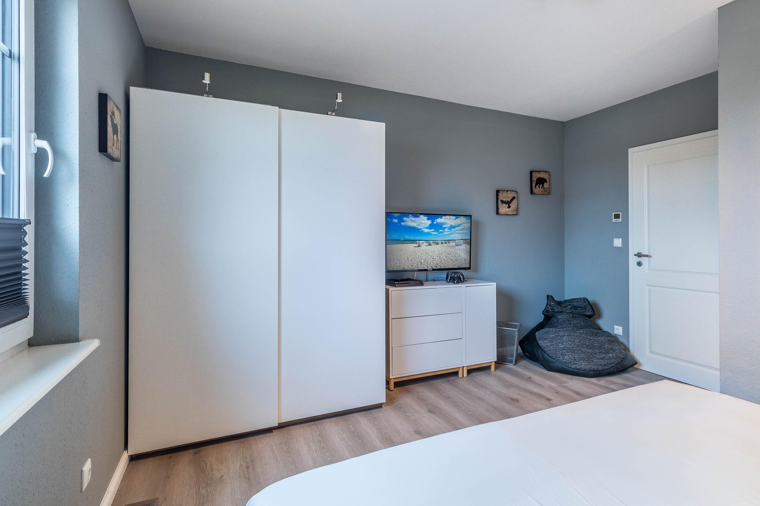 Das dritte Schlafzimmer ist mit zwei Betten (90/200) eingerichtet und bietet ebenfalls einen schönen Blick auf die Ostsee. Jedes Schlafzimmer verfügt über ein TV [&] Blu-Ray-Player. Die Betten sind für Sie, liebe Gäste, bei Anreise schon bezogen!