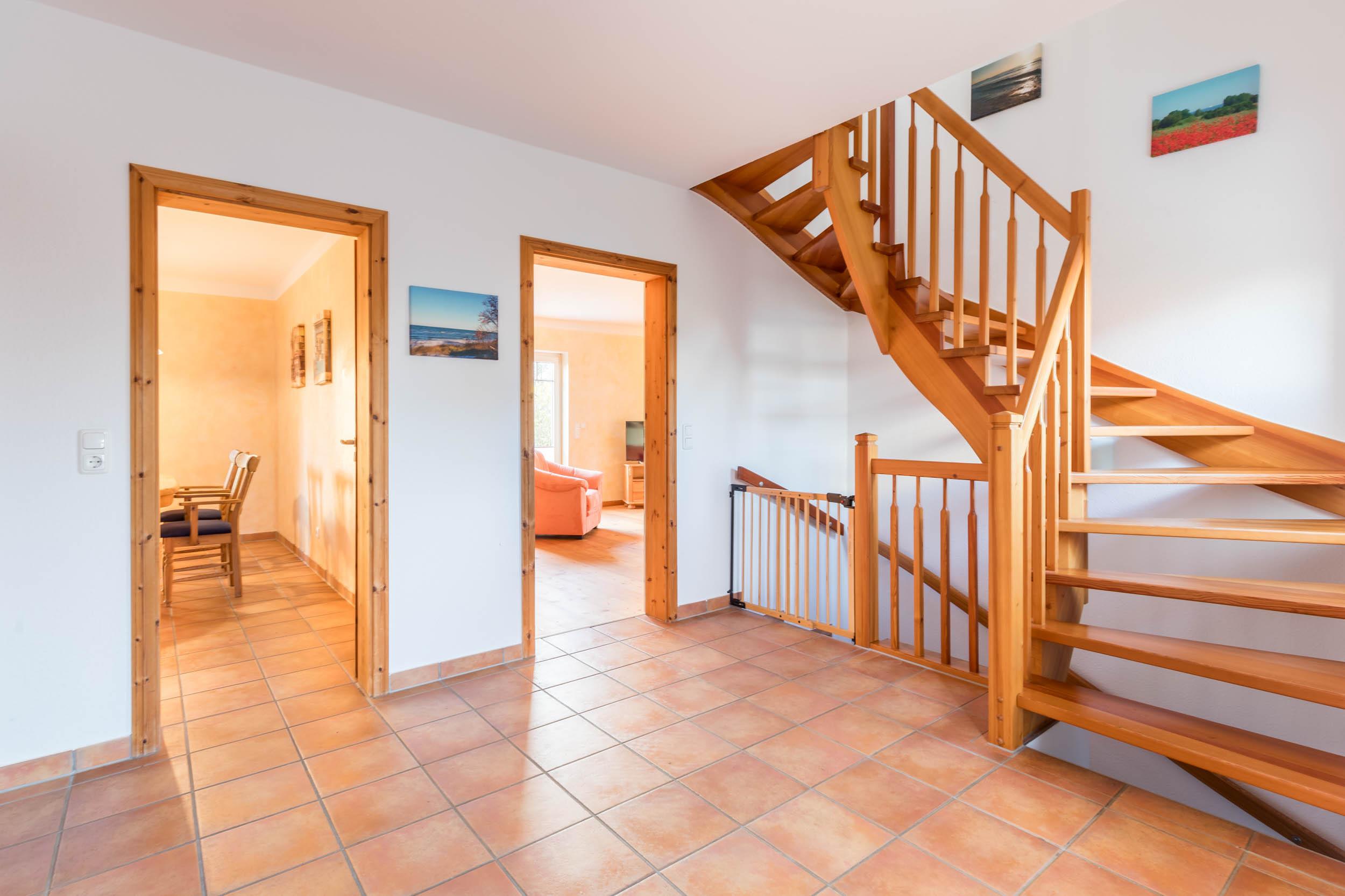 Von hier aus führt eine Holztreppe ins 1. Obergeschoss, wo sich im Friesengiebel ein schöner Sessel und eine kleine Kommode befinden - ein kleiner Rückzugsort, wenn man etwas Entspannung und Ruhe sucht. Am oberen Ende der Treppe ist ein Treppenschutzgitter befestigt.