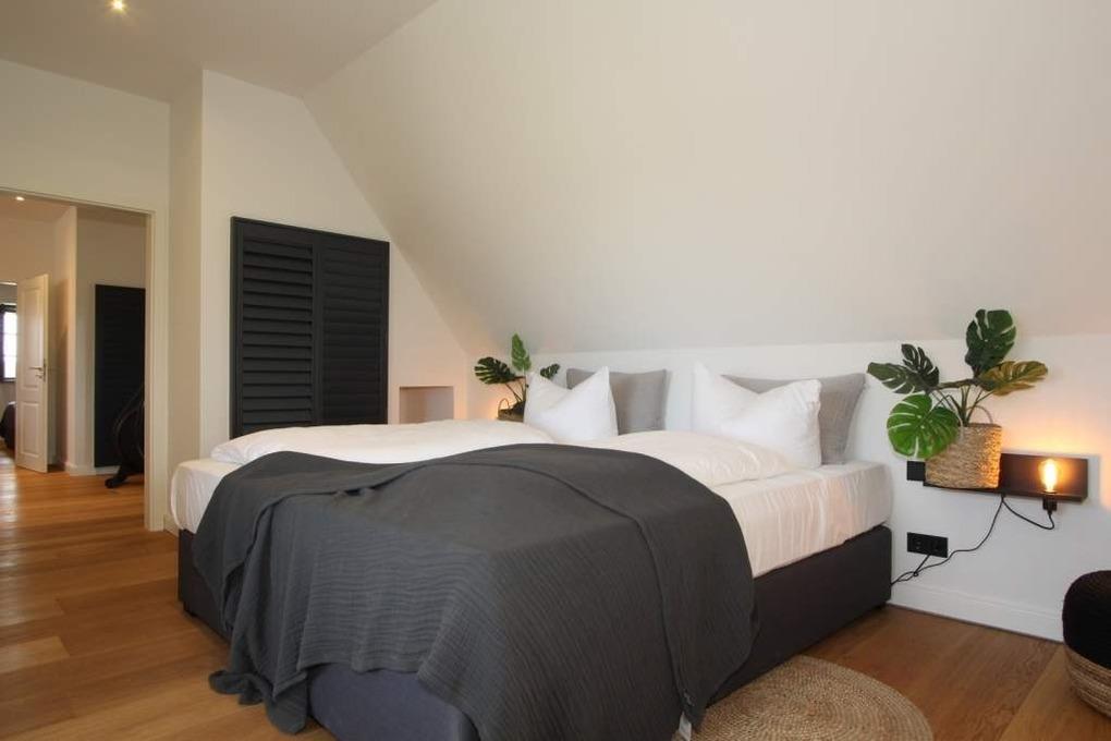 Ein Schlafzimmer mit Boxspringbett 180x200cm und ein passender Kleiderschrank erwarten Sie ebenfalls, wie auch das Badezimmer mit Doppelwaschtisch, WC und Dusche.