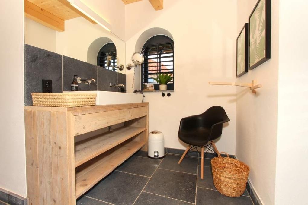 Im größeren Badzimmer auf dieser Wohnebene befindet sich neben dem Waschtisch, auch ein WC sowie eine freistehende Badewanne. Das andere Badezimmer ziert eine Dusche und ein Waschtisch mit WC.