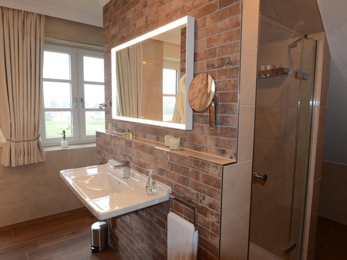 Das Ferienhaus bietet Ihnen insgesamt 4 vollwertige Schlafzimmer. Davon verfügen allein 3 Schlafzimmer über ein eigenes, direkt angrenzendes Badezimmer! Alle Schlafzimmer sind mit Premium-Doppelbetten ausgestattet. Die Betten verfügen über sehr gute Matratzen und eine angenehme Komforthöhe für Ihr persönliches Boxspringfeeling. Alle Schlafzimmer sind mit modernen, hochwertigen Flatscreen-Fernsehern in angenehmer Größe ausgestattet. 2 Schlafzimmer im Obergeschoss verfügen über einen eigenen Balkon mit Bestuhlung. Das Schlafzimmer im Erdgeschoss bietet Ihnen einen direkten Zugang zur Terrasse. Küche: Die Größe der Küche wird Sie beeindrucken und die Ausstattung positiv überraschen. An die Küche schließt sich der offene Wohn-/Essbereich an. Für Ihren individuellen Kaffeegenuss steht eine Nespresso-Kaffeemaschine mit Milchaufschäumer bereit. Sauna: Es steht Ihnen eine kleine Premium-Anlage des Marktführers Klafs zur Verfügung. Badezimmer: In allen Badezimmern finden Sie stufenlose Duschterrassen bzw. eine ebenerdige Dusche vor. In zwei der Duschen wurden Regenduschen integriert. Freuen Sie sich auf große Waschbecken, beleuchtete Spiegel, Kosmetikspiegel und Haartrockner. Zusätzlich zu den 3 Badezimmern gibt es ein weiteres separates Gäste-WC. Außenanlage: Es steht Ihnen eine große Terrasse mit Süd-West-Ausrichtung zur Verfügung. Die Möblierung ist ausgesprochen hochwertig. Der Tisch ist großzügig bemessen. Sonnenliegen stehen zur Nutzung bereit. Als Wetterschutz sind eine großflächige Terrassenüberdachung aus Glas mit integrierter, individuell steuerbarer Sonnenmarkise vorhanden. Unmittelbar an die Terrasse schließt sich ein vertiefter Grillplatz mit großem Holzkohle-Grill an. Technische Ausstattung: Es steht Ihnen sehr schnelles WLAN zur Verfügung. Es sind Access-Points sowie CAT-7-Netzwerk-Leitungen vorhanden. Parkplätze: Auf dem Grundstück sind Parkplätze vorhanden.