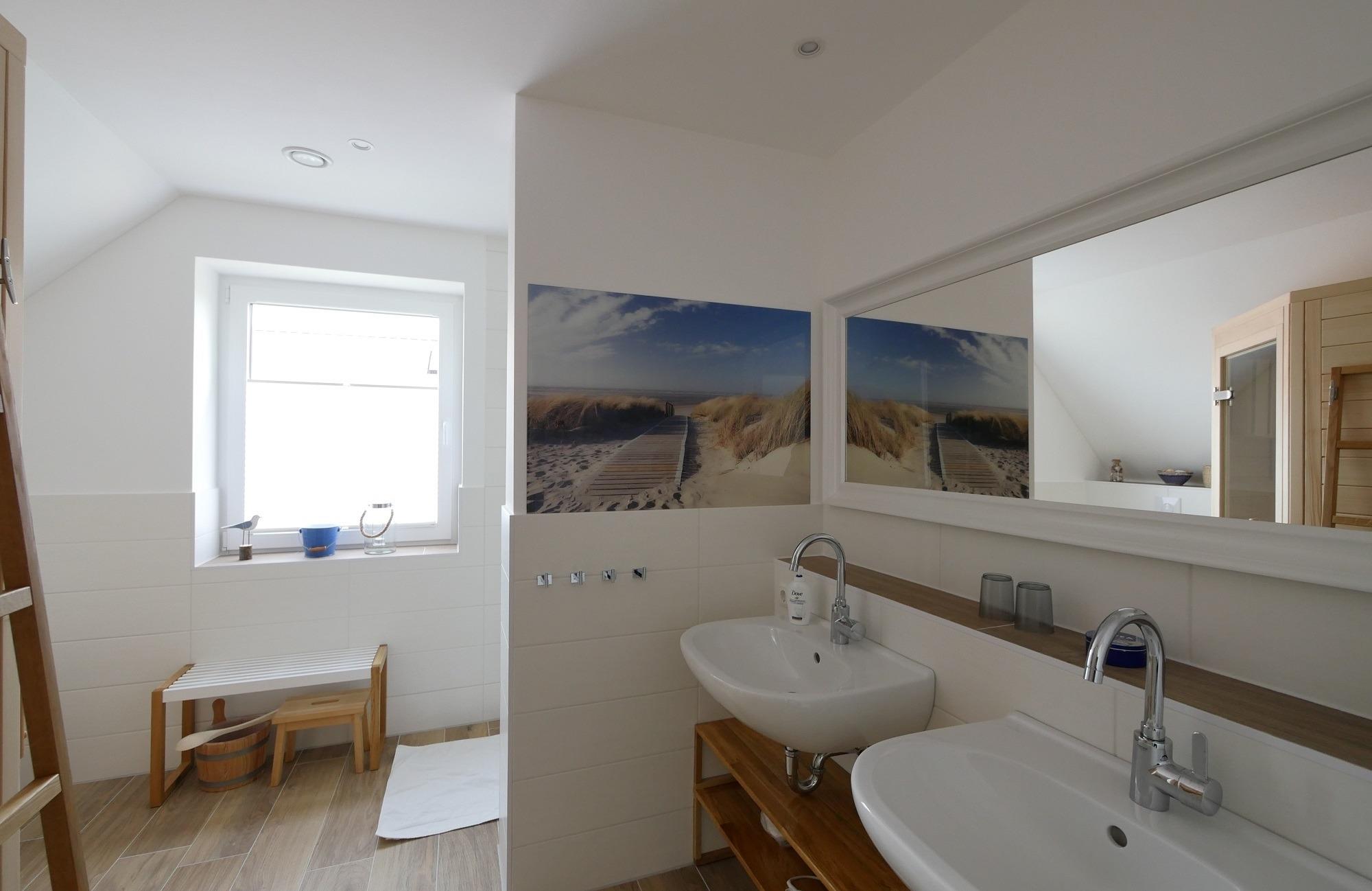 hochwertige Massivholzsauna (ca. 2,10 m x 2,10 m) mit Unterbankofen (geringe Verletzungsgefahr für Kinder), Geräumige bodentiefe Rainshower Dusche, 2 Waschbecken und Wand-zu-Wand Spiegel im OG. Walk-In Dusche im EG.