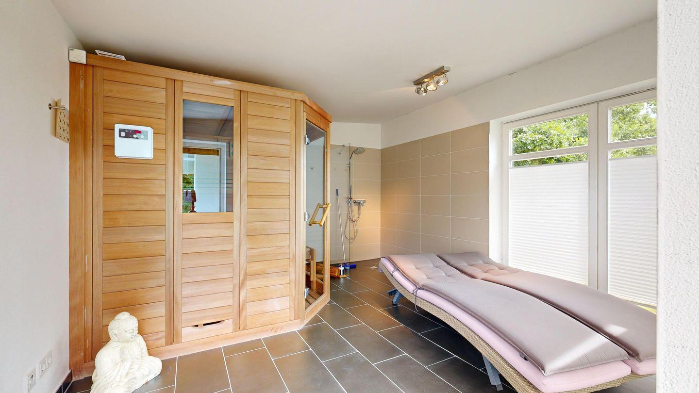 * Nebengebäude mit Saunabereich (ca. 20 m²), Duschen und Liegen, Fahrradabstellraum
