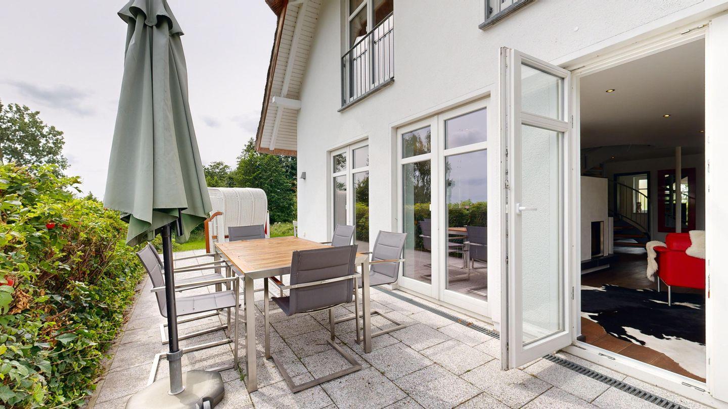 * große Süd-Terrasse mit Meerblick und Gartenmöbeln