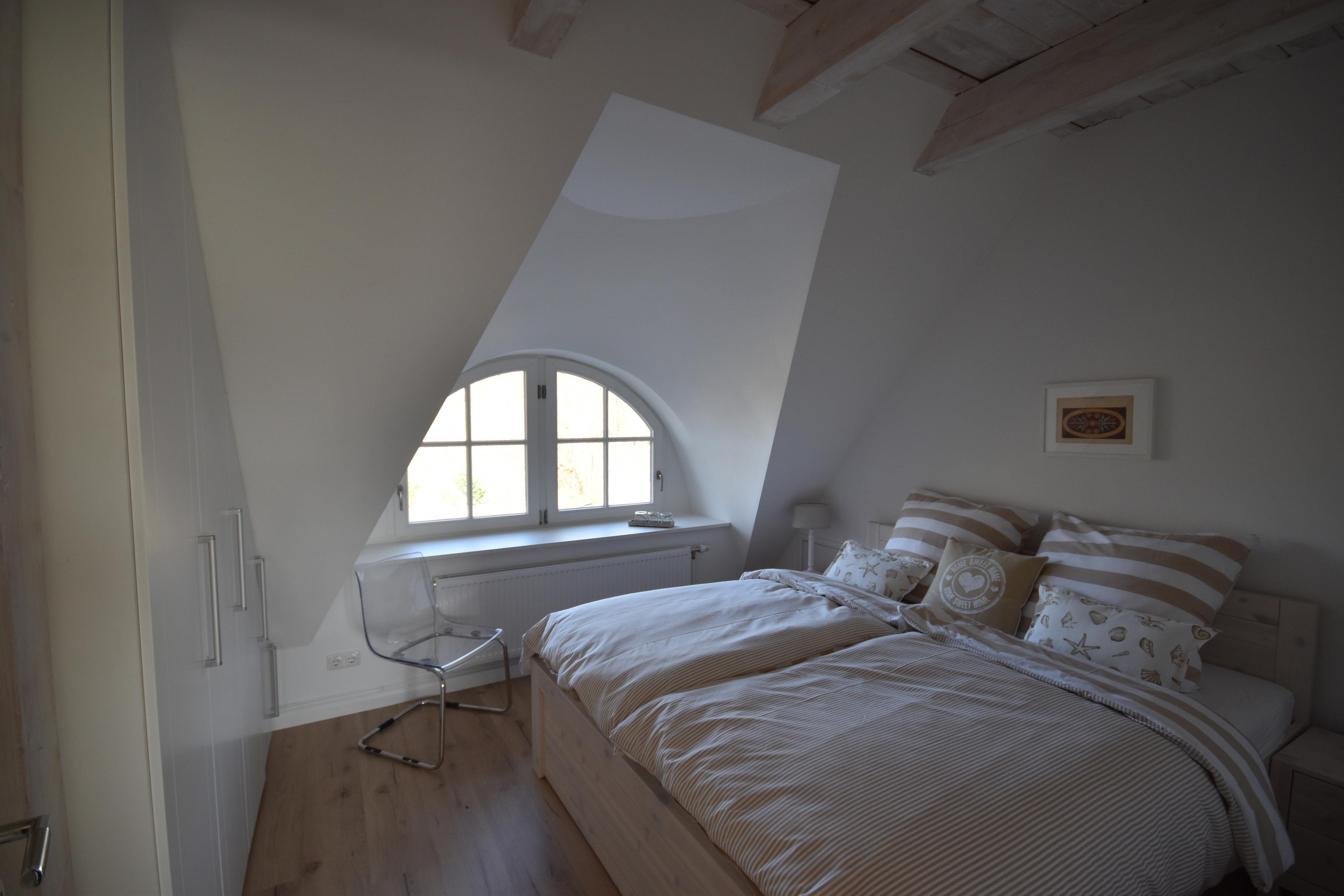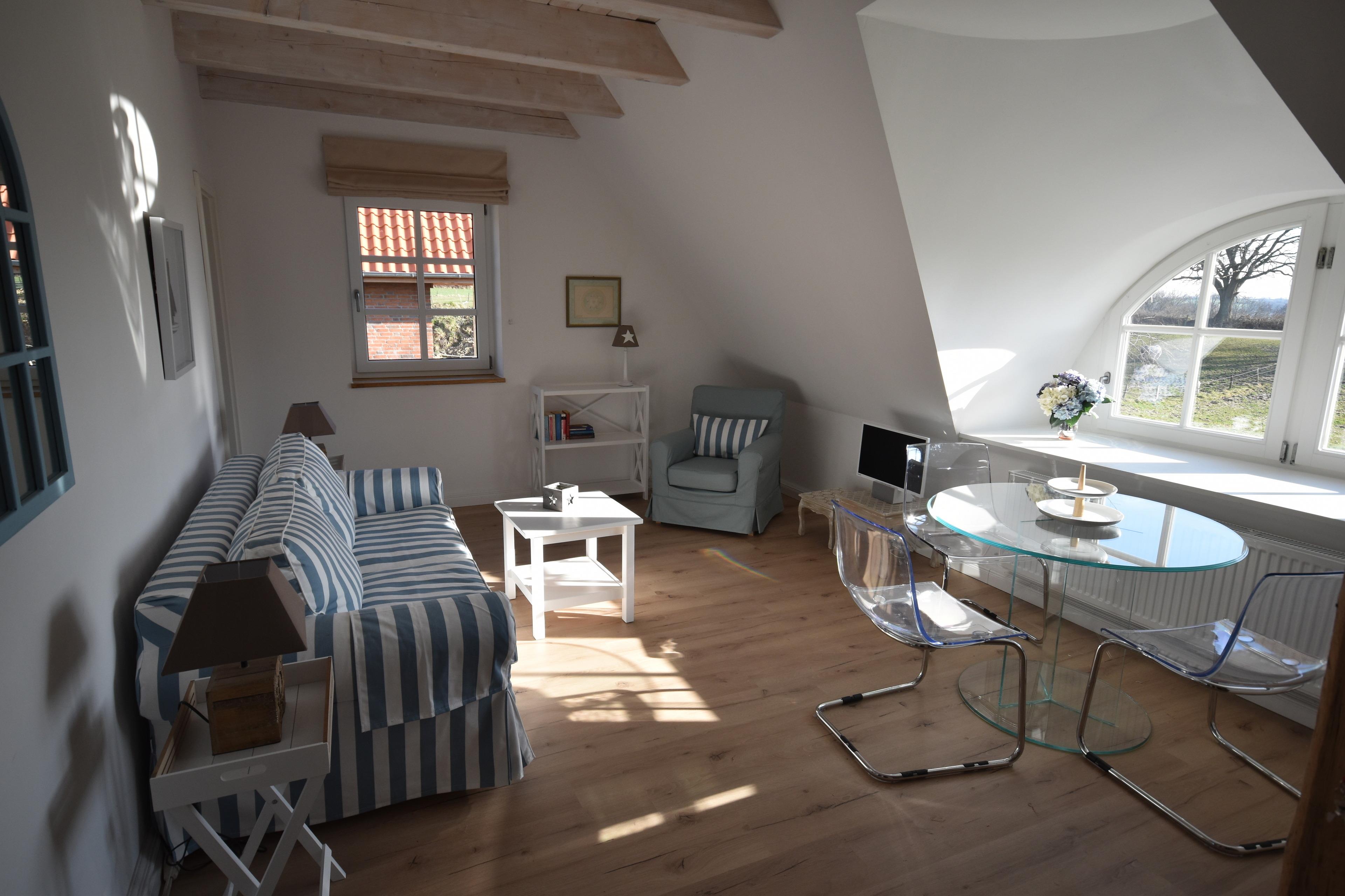 Ihr Feriendomizil liegt im 1. Stock und hat mit seinen hellen Holzbalken und den halbrunden Reetdachgaubenfenstern viel ländlichen Charme.
