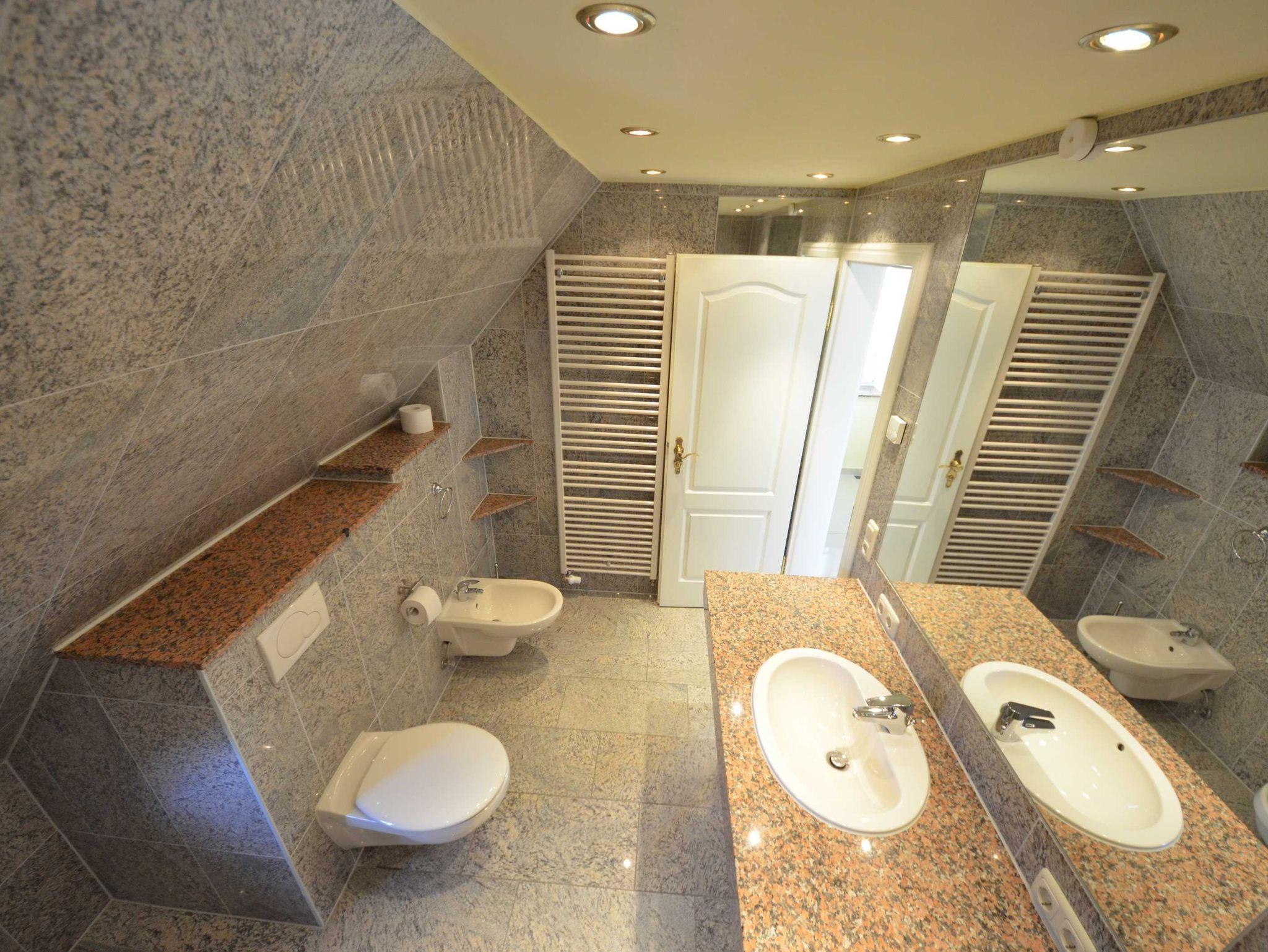 Ein Bad mit Badewanne (mit Glas-Duschabtrennung), Toilette und Bidet, zweites Bad mit Duschbad, Granitverkleidung, Fußbodenheizung, Granit - Abdeckungen, große Spiegel, schöne Sanitärausstattung, Einbau-Waschbecken, beheizbarer Handtuchhalter, Fön, Schminkspiegel, dekorative Beleuchtung.