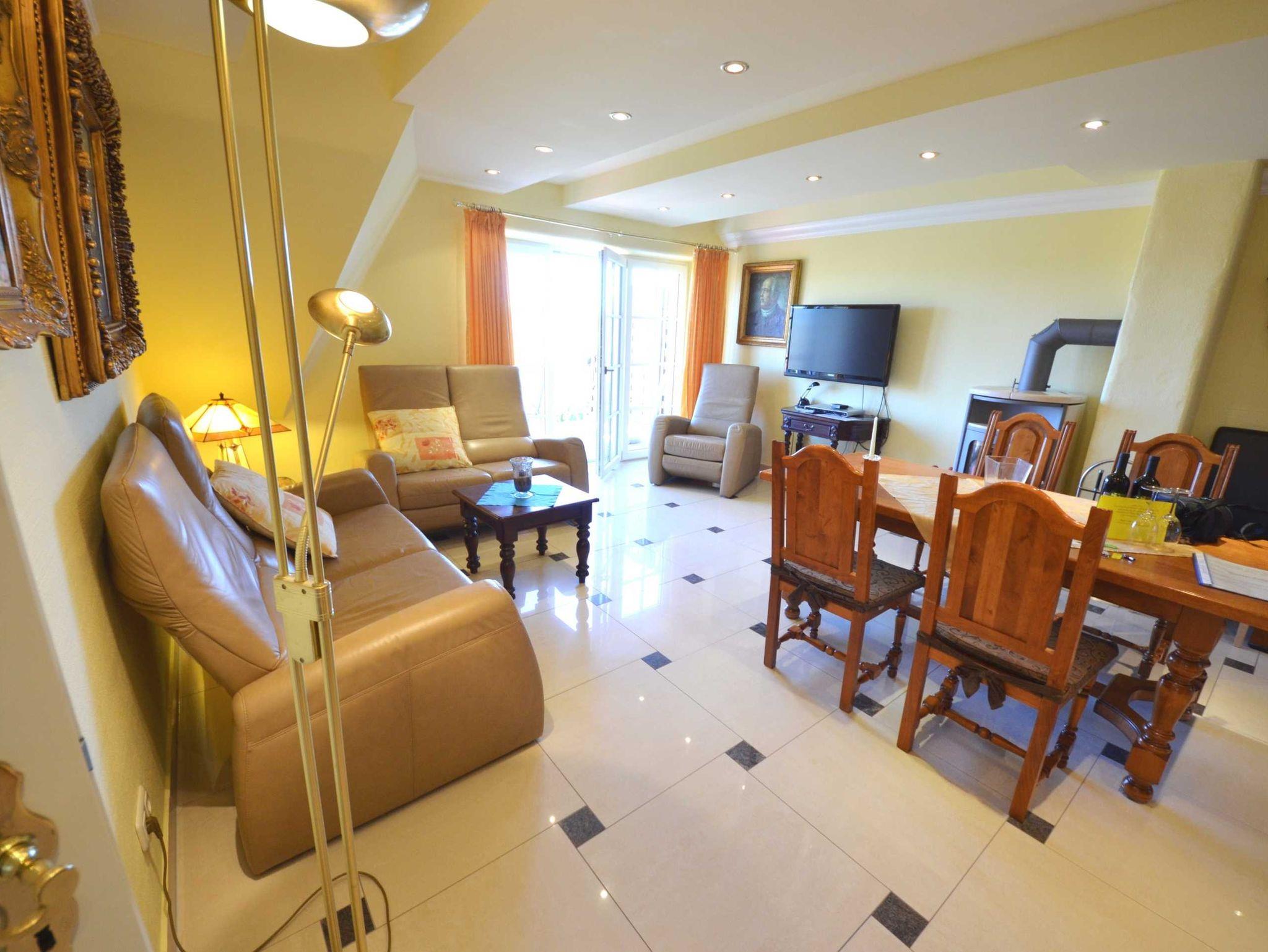 Großzügiges Wohn-/Esszimmer mit Ausgang zum großen Balkon mit direktem traumhaften Blick auf die Ostsee, den kleinen Hafen von Groß Zicker und die gegenüber der Bucht liegenden Orte Thiessow und Klein Zicker. Schöne Ledergarnitur mit Opiumtisch. Speisetafel mit sechs Stühlen, großer Hark-Kaminofen, antike Vitrinen, kleine Bücherauswahl, Plasma-TV mit 125 cm Großbild, Fußbodenheizung, DVD-Recorder, Stereoanlage, CD-Player, Kinderhochstuhl, Wände dekoriert mit Spiegeln und Gemälden, sehr ansprechende Beleuchtung.