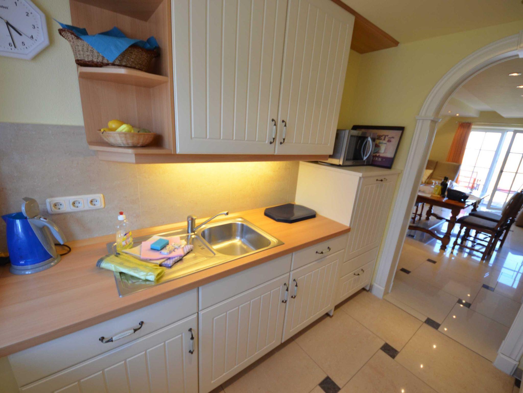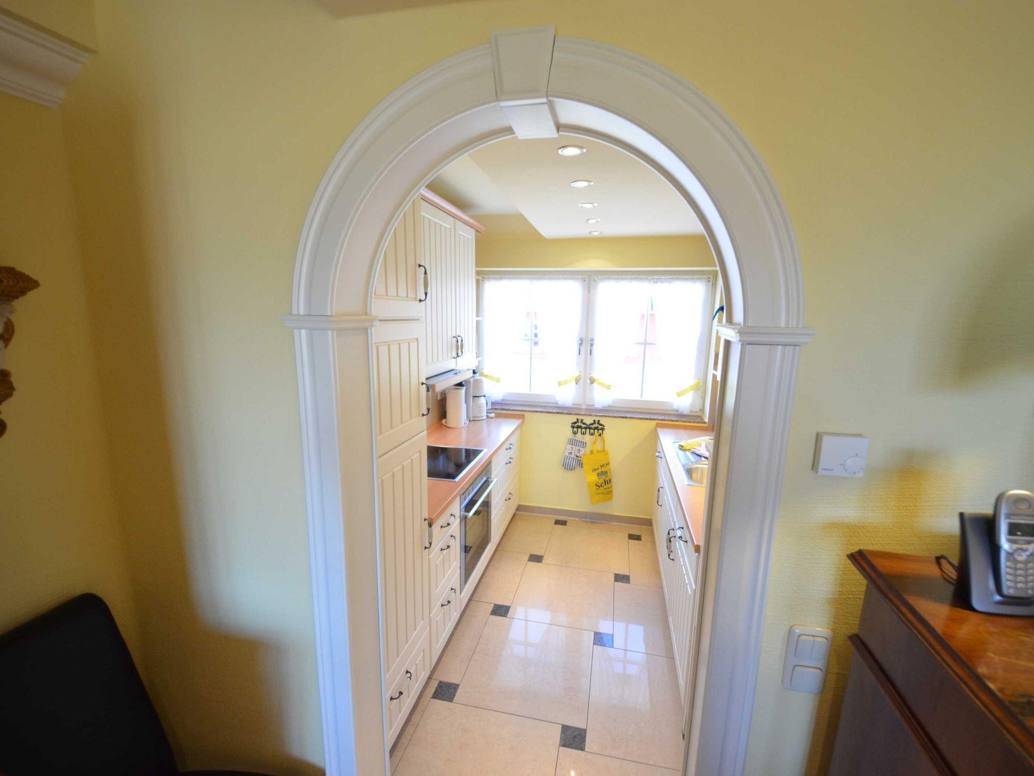 Sehr dekorative Landhaus-Einbauküche in vanillegelb, Geschirrspüler höher gelegt, Mikrowelle, Herd mit Cerankochfeld und Backofen, Flachschirm-Dunstabzugshaube, großer Kühlschrank mit 38 LGefrierteil, zwei Kaffeemaschinen, Wasserkocher, Eierkocher, Toaster, Waffeleisen, Mixer, ausreichend Edelstahltöpfe Schnellkochtopf, Gewürze, sehr schönes Geschirr, Auswahl an Gläsern.