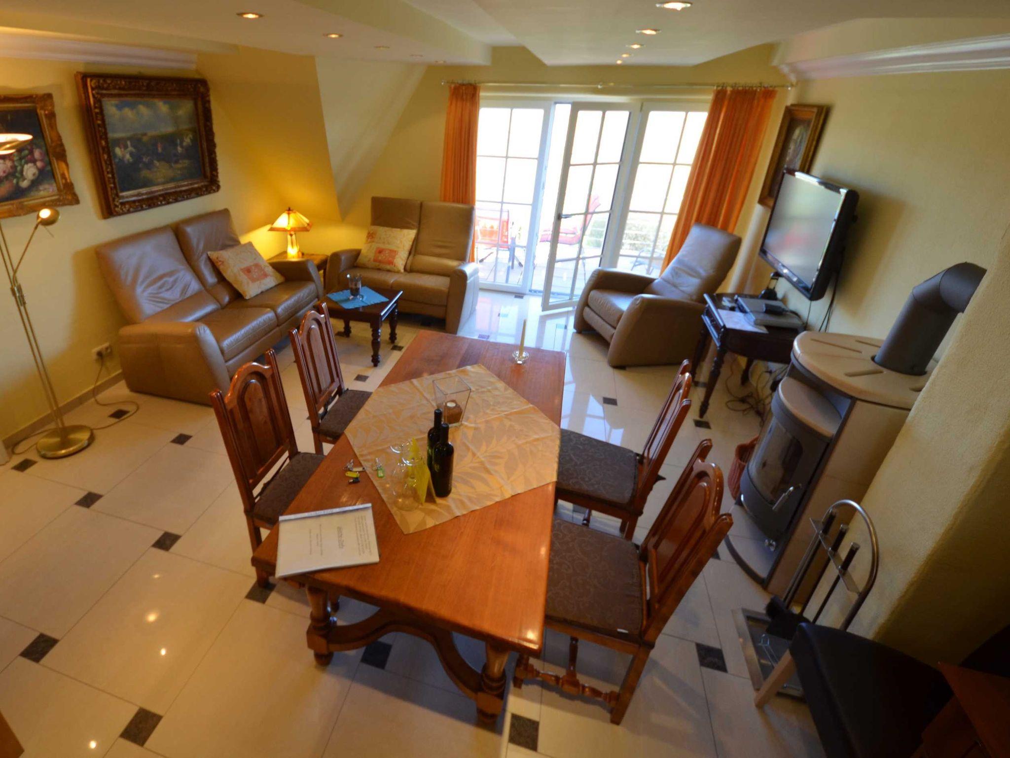 Hark-Kaminofen, antike Vitrinen, kleine Bücherauswahl, Plasma-TV mit 125 cm Großbild, Fußbodenheizung, DVD-Recorder, Stereoanlage, CD-Player, Kinderhochstuhl, Wände dekoriert mit Spiegeln und Gemälden, sehr ansprechende