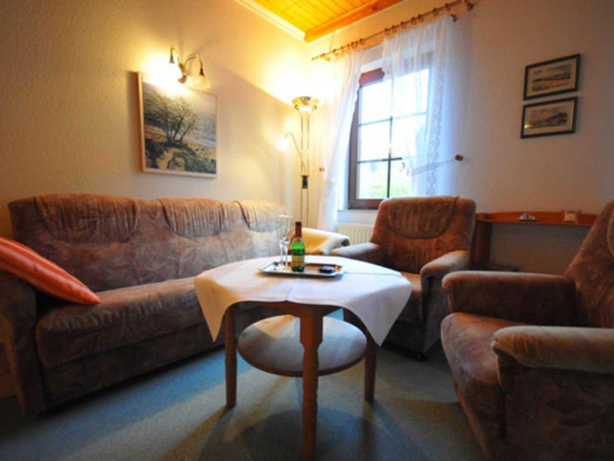 Die Ferienwohnung befindet sich im Erdgeschoß und besteht aus einem Wohnraum mit Sitzgruppe und TV sowie einem Schlafraum mit einem Doppelbett und einem Schlafraum mit Doppelstockbett. Die Ferienwohnung verfügt zudem über ein Duschbad und eine moderne Einbauküche. Auf dem großen Grundstück steht Ihnen eine Liege und Spielwiese sowie ein Grillplatz zur Verfügung.