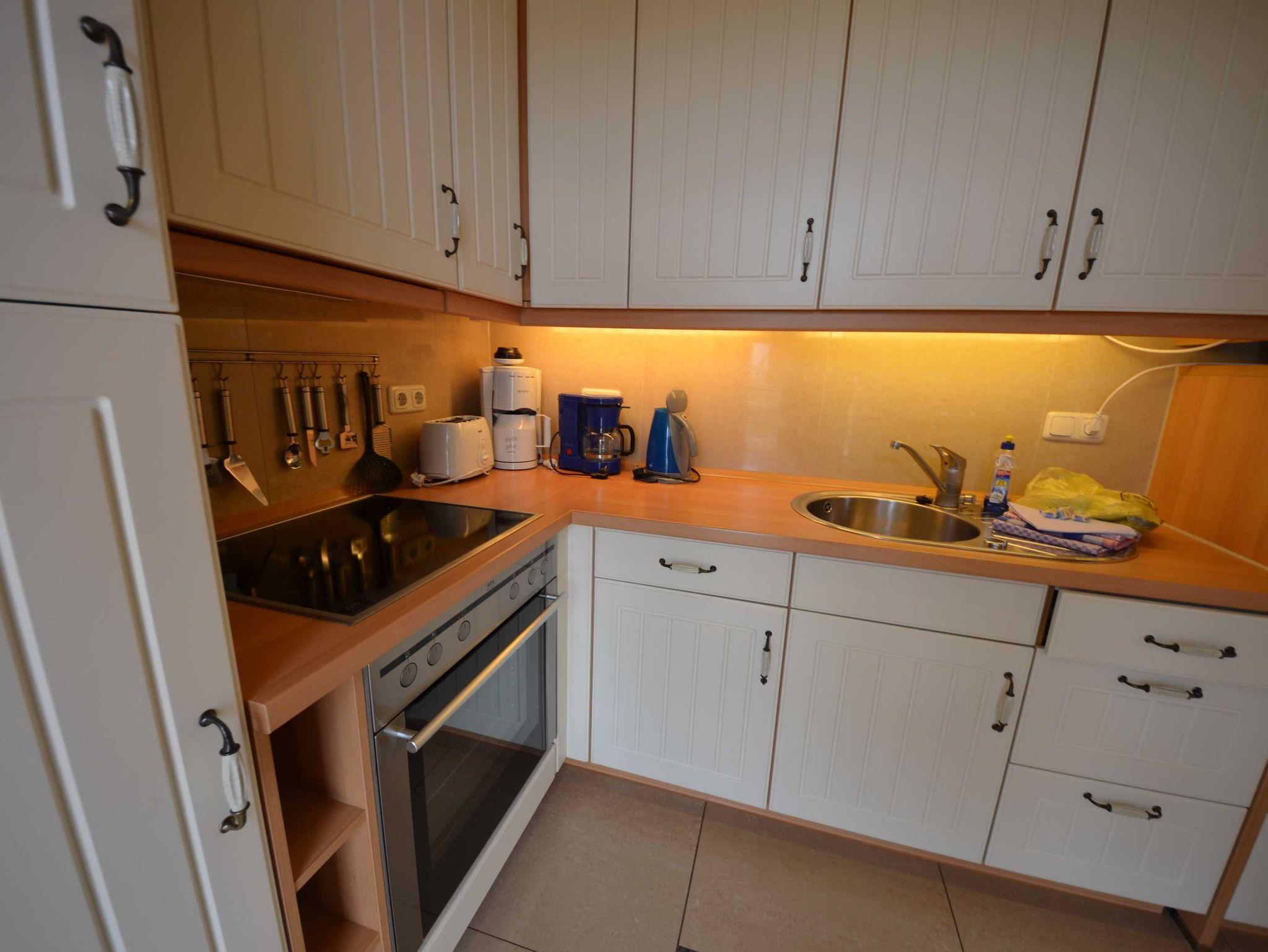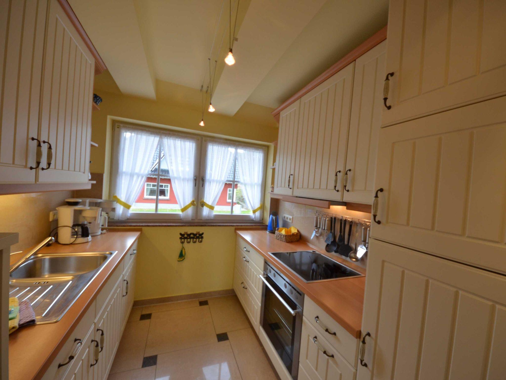 Mit Ausgang zur großen Terrasse, schöne moderne Landhaus-Einbauküche in vanillegelb, Geschirrspüler höher gelegt, Mikrowelle, Herd mit Cerankochfeld und Backofen, Turmhaube, Kühlschrank mit 38 LGefrierteil, zwei Kaffeemaschinen, Wasserkocher, Eierkocher, Toaster, Waffeleisen, Mixer, ausreichend Edelstahltöpfe, Schnellkochtopf, Gewürze usw., sehr schönes Geschirr, Auswahl an Gläsern (ca. 50 Stk.)
