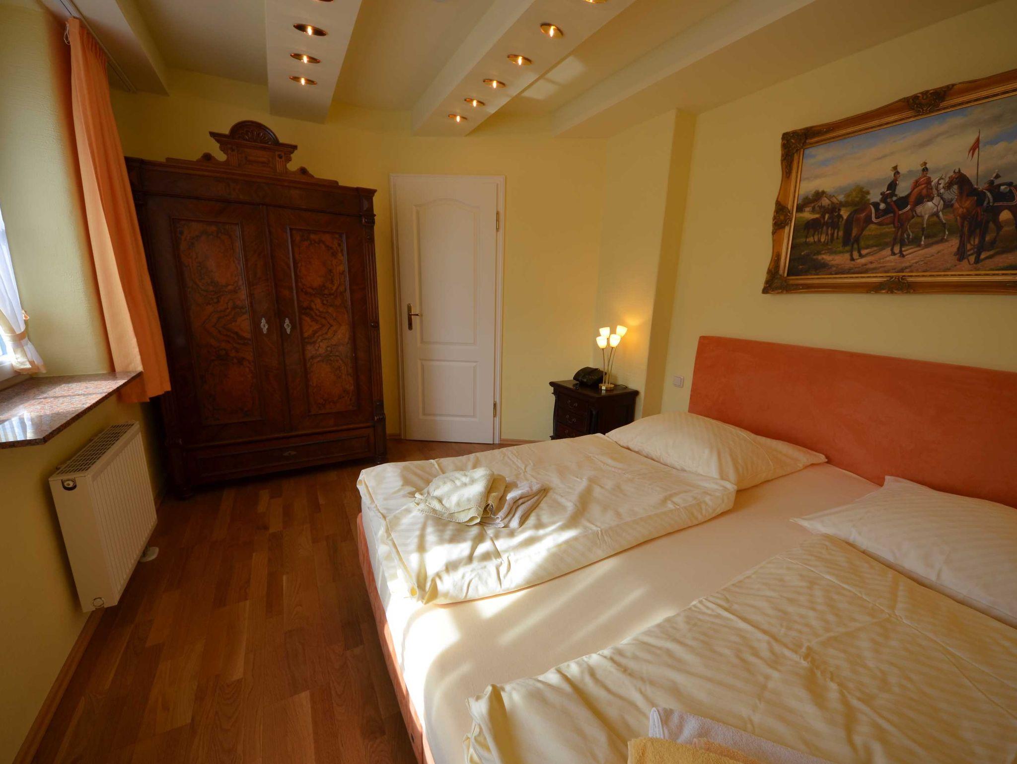 Zwei Doppel-Schlafzimmer mit Doppelbett 1,80 x 2,00 m und einmal mit 1,60 x 2,00 m und aufgezogener Bettwäsche. Radiowecker, Wände mit Bildern dekoriert, antiker Gründerzeit-Wäsche-/Kleiderschrank, elektrische Rollläden, Fenster mit Mückenschutz. Nach Voranmeldung: ein Babyreisebett (kostenlos) mit Bettwäsche.