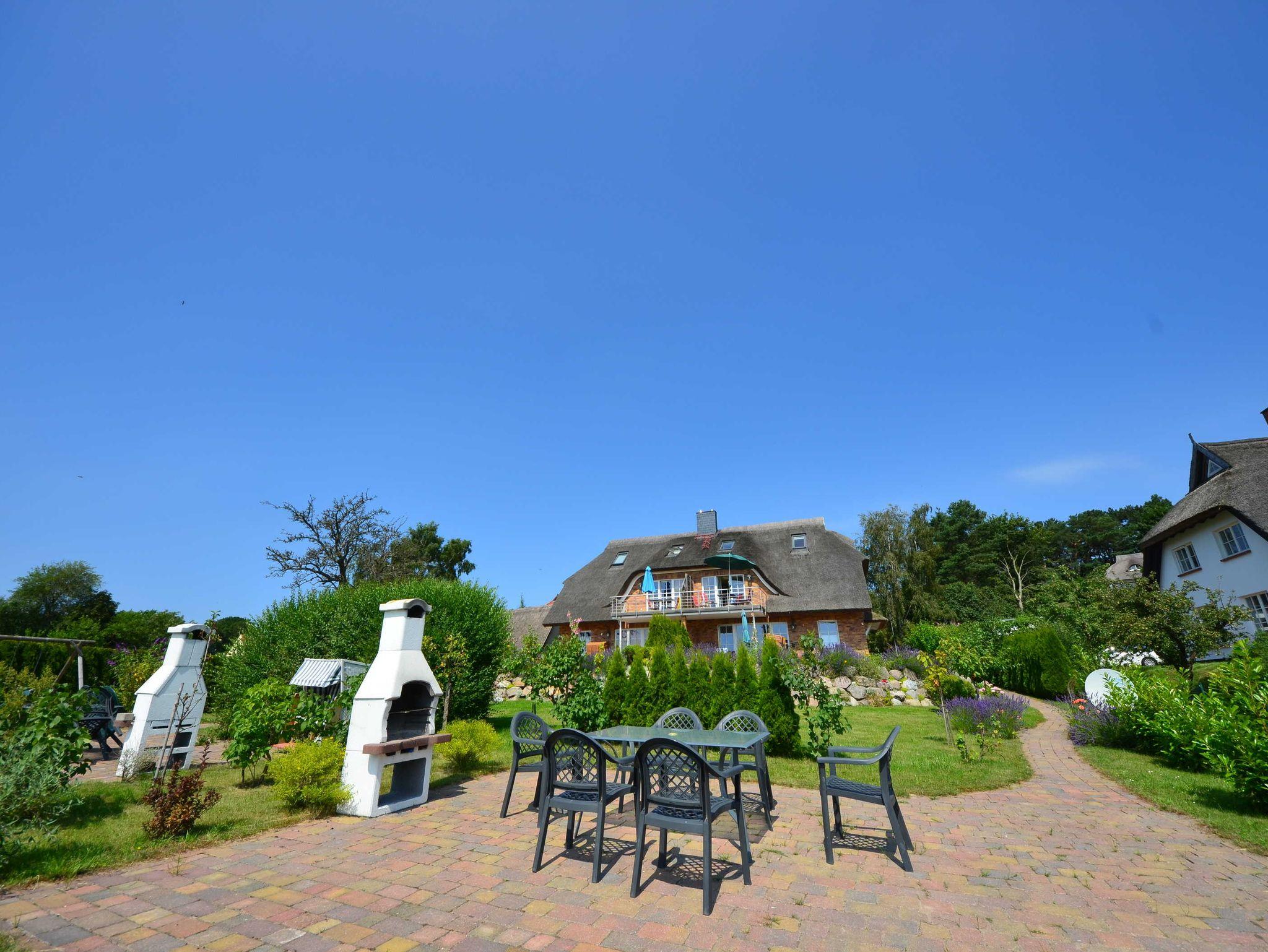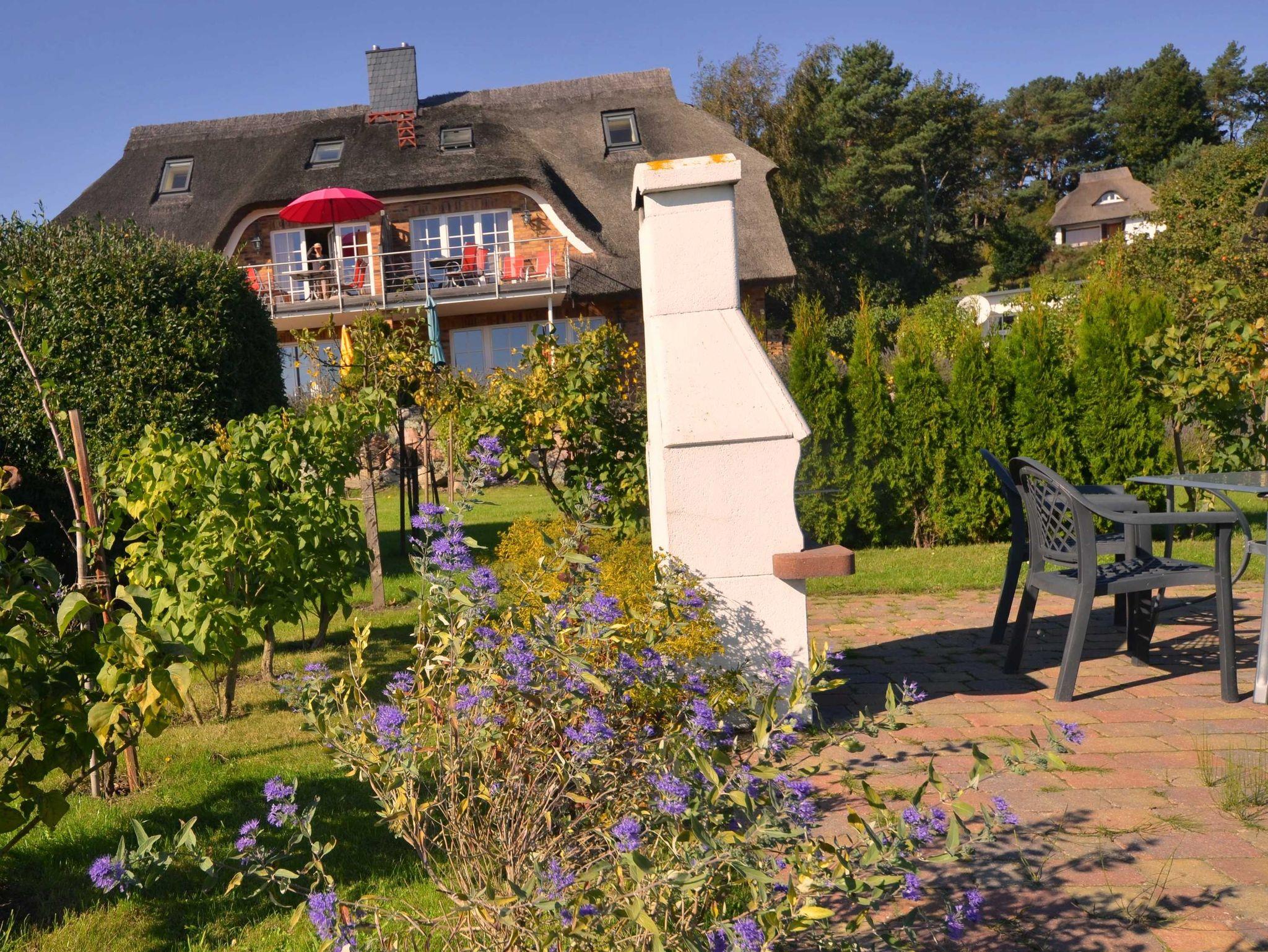 Reetdach-Ferienwohnung mit Meerblick, großer Terrasse, Kaminofen und Garten in Groß Zicker auf der Halbinsel Mönchgut.